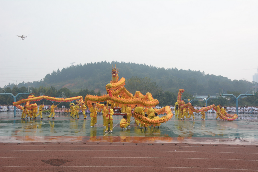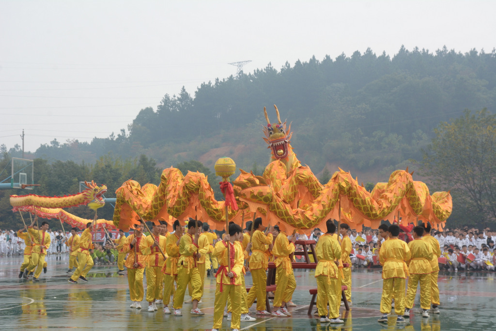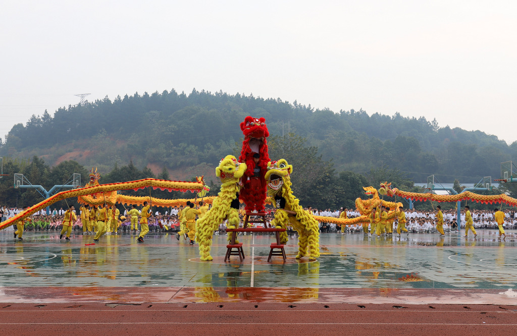 伴随着雷鸣般的掌声,两条金龙、正源憨狮跃入场中,双龙飞舞,醒狮欢腾。这支薪火相传的正源龙狮队,已然伴随了正源15年的辉煌,陪伴了一批批农家学子在正源成长成材,见证了一个个高考神话。