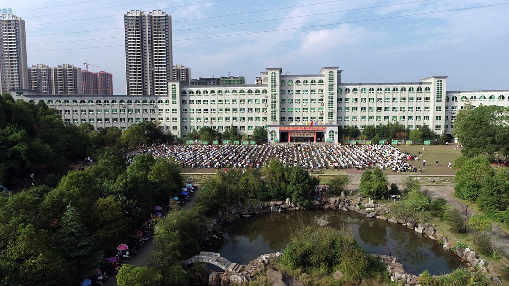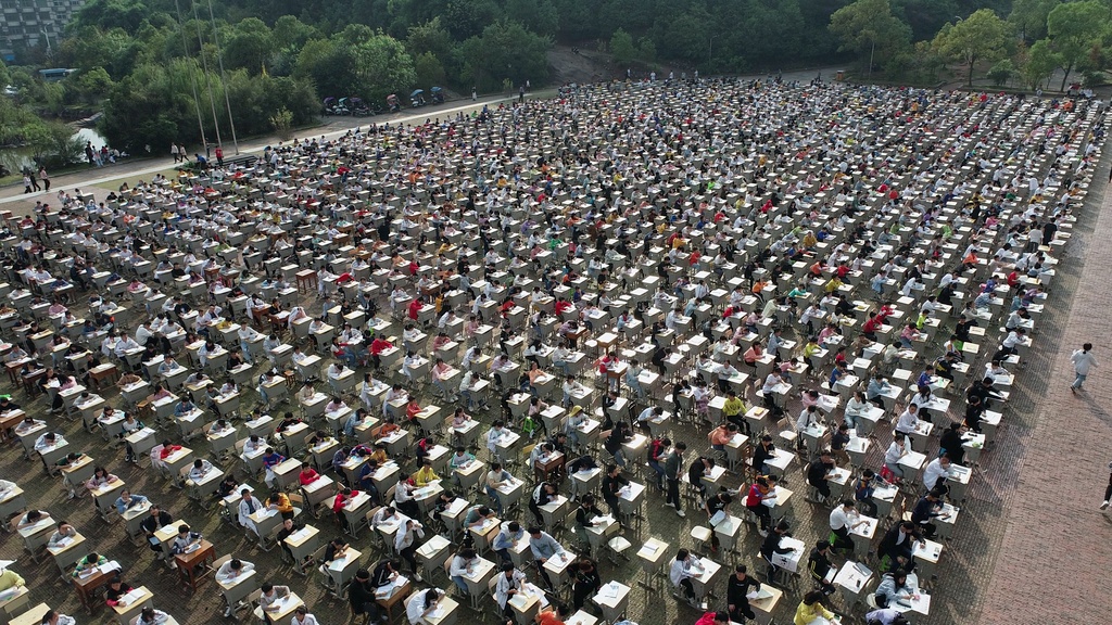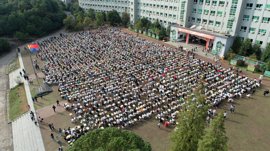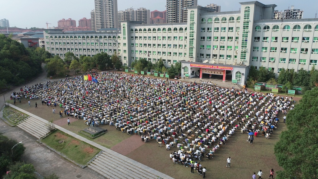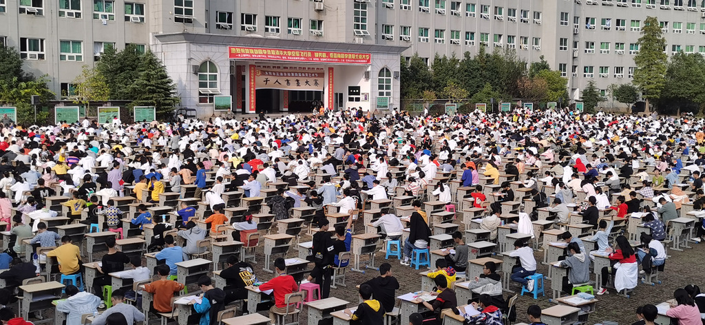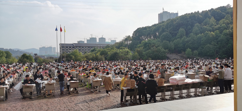 广场中央,整齐排列的2000套桌椅像棋盘一样纵横交错,方方正正布满整个广场。