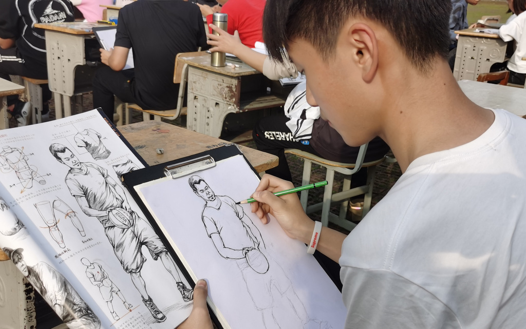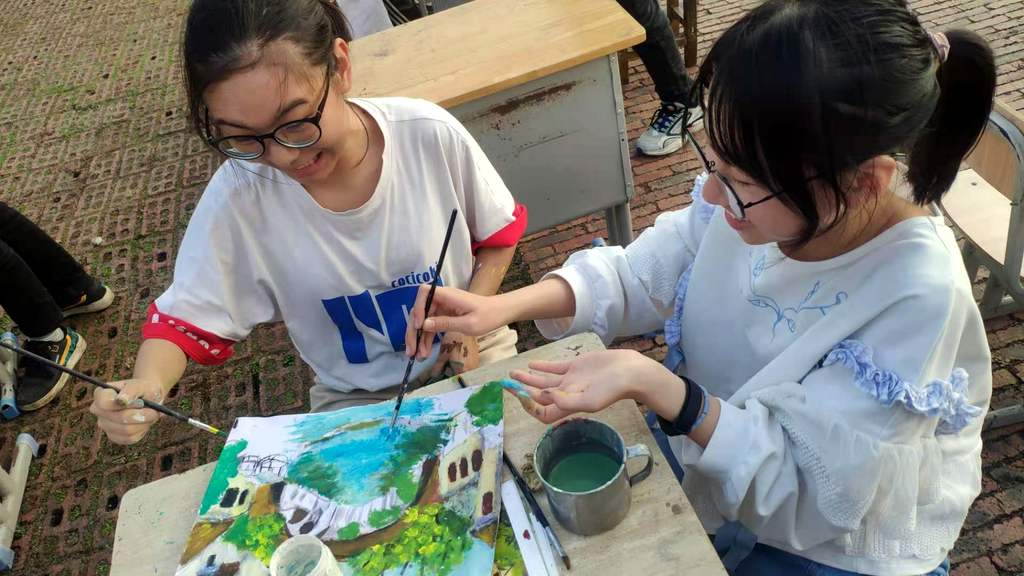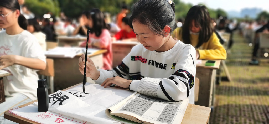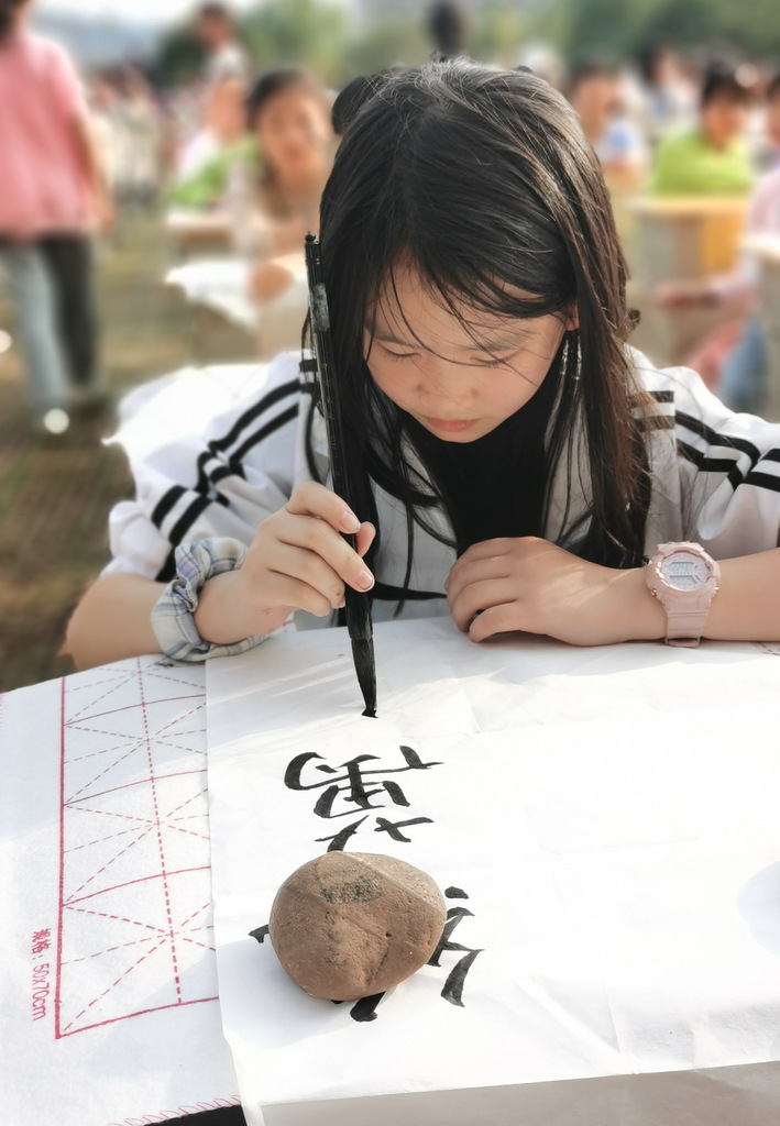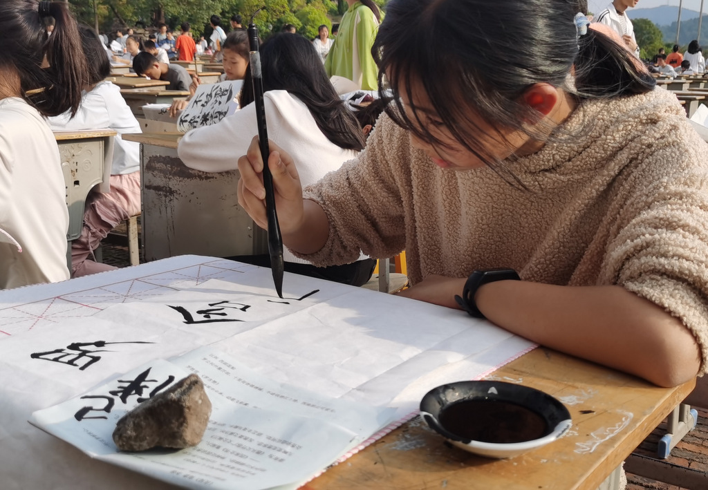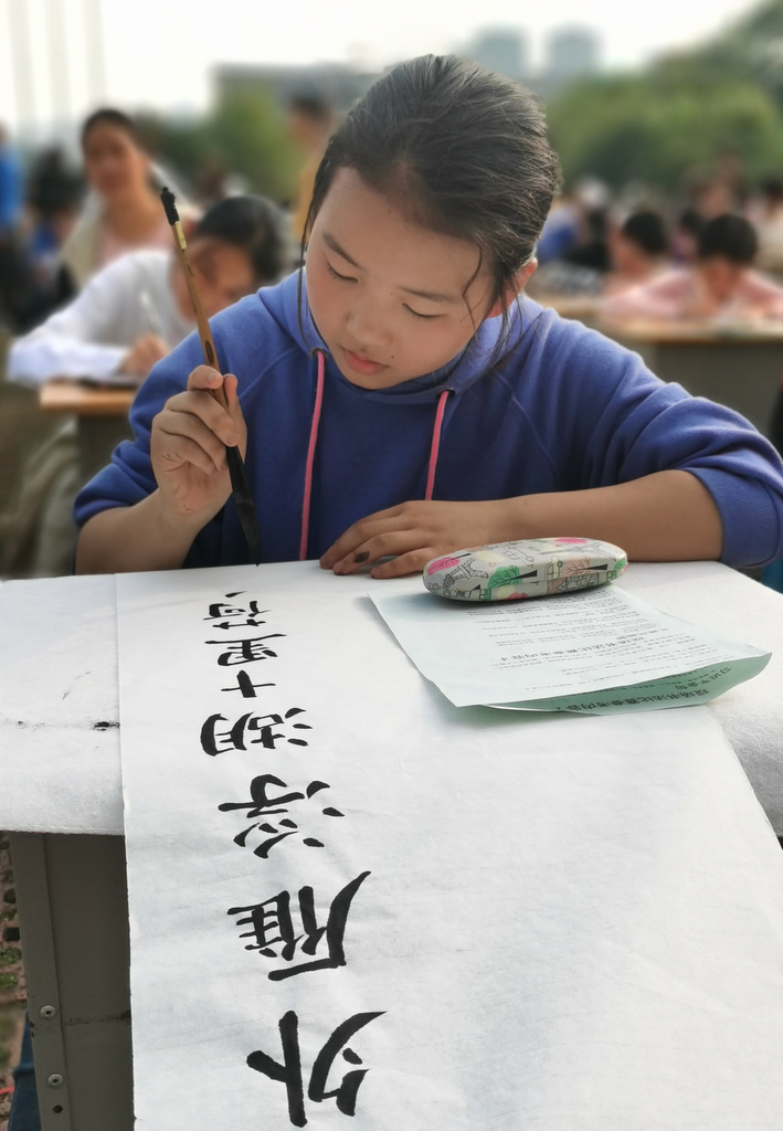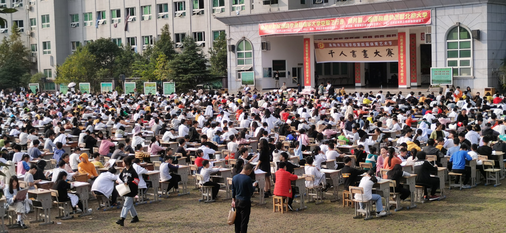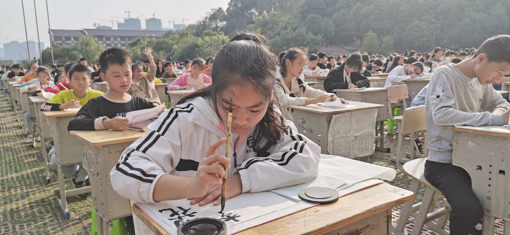 风趣随和的话语最能引起学生的共鸣,在一片欢声笑语中,两千多同学齐刷刷地收起伞和书、纸,在骄阳下屏气凝神,奋笔挥毫。一支笔,一卷纸,绘尽诗意,舞出芬芳;一方墨,一幅画,扬洒童真,放飞梦想。