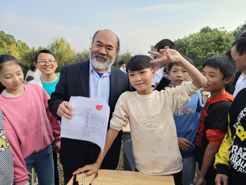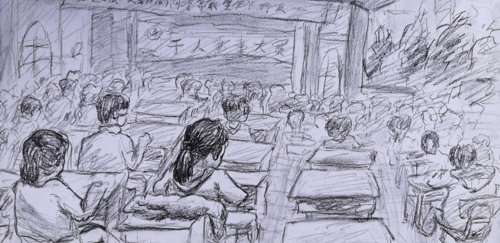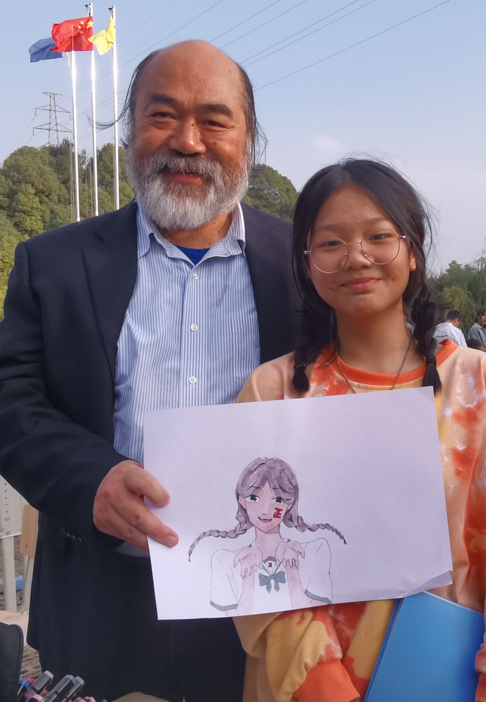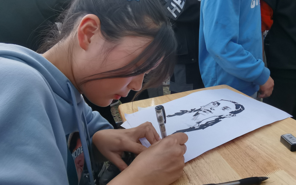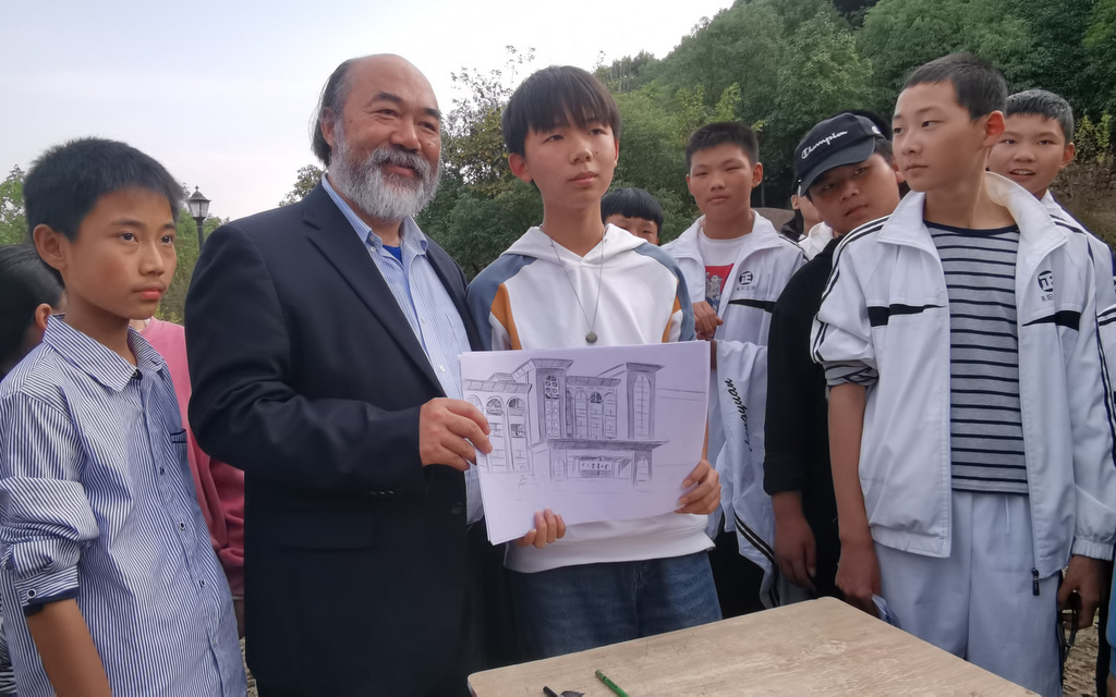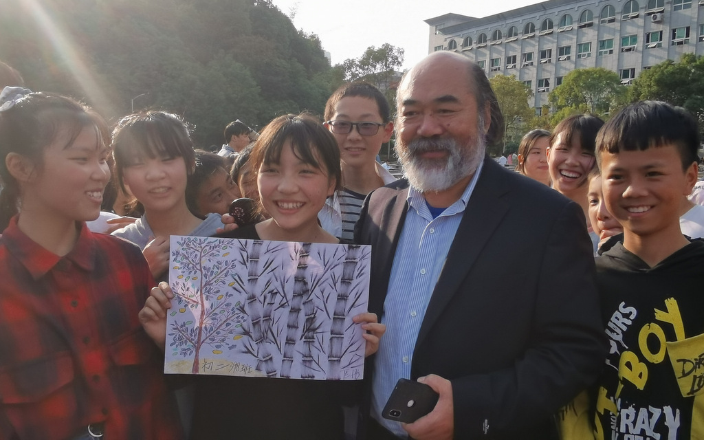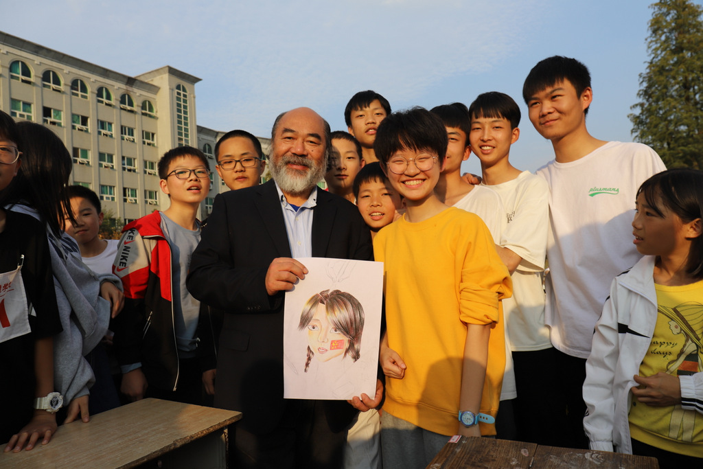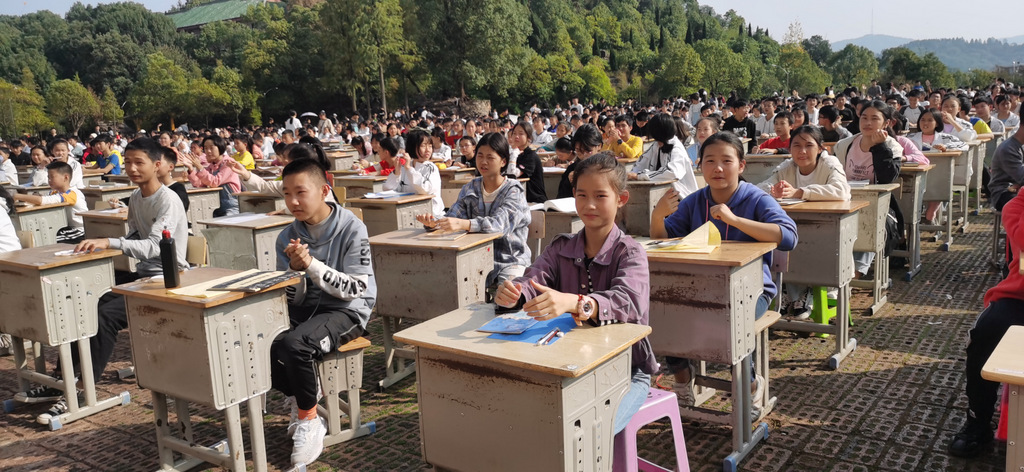 风趣随和的话语最能引起学生的共鸣,在一片欢声笑语中,两千多同学齐刷刷地收起伞和书、纸,在骄阳下屏气凝神,奋笔挥毫。一支笔,一卷纸,绘尽诗意,舞出芬芳;一方墨,一幅画,扬洒童真,放飞梦想。