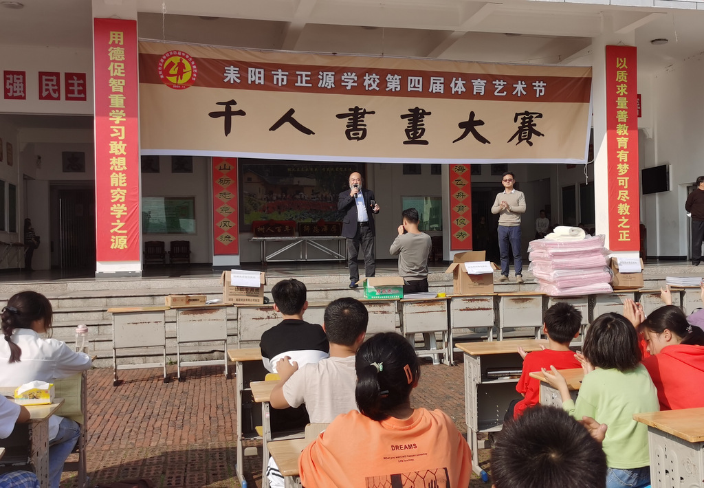 教学楼大厅悬挂着古香古色的“耒阳市正源学校第四届体育艺术节·千人书画大赛”喷绘横幅。横幅上方高悬的“热烈祝贺姚剑同学录取清华大学空军飞行员 钟芳蓉、匡雪梅同学录取北京大学”喜报在阳光下熠熠生辉。