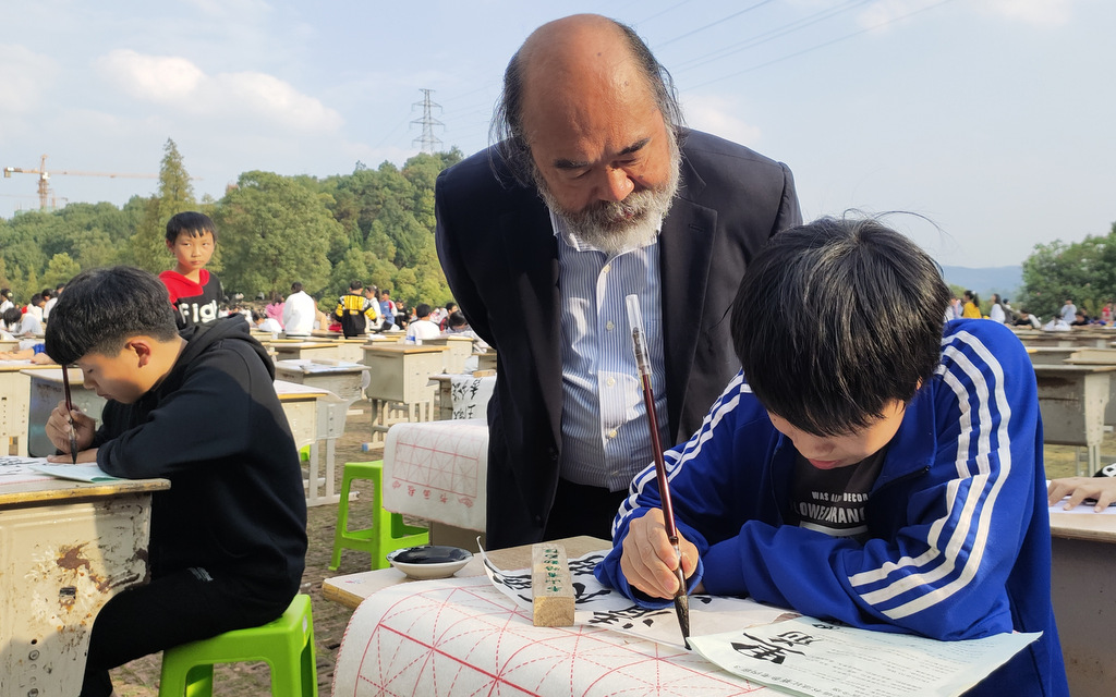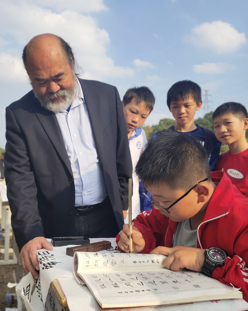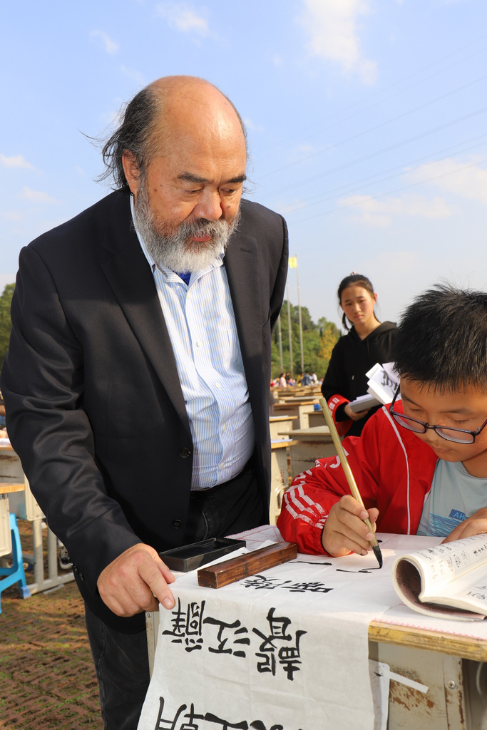 初冬的太阳依然火热,教学楼广场热闹非凡。盼望一展身手的同学们开始坐不住了,拿着书纸擎在额前遮挡太阳。一向倡导吃苦耐劳,注重培养学生坚韧品质的罗校长开始即兴讲话:“我们的老天爷,太给面子啦!晒一下太阳最健康啦!同学们,晒黑了好啊,我们是阳光少年,难道见不得阳光吗?大家把头上的伞,还有书,还有帽子全部取下来……”随即宣布书画大赛正式开始。