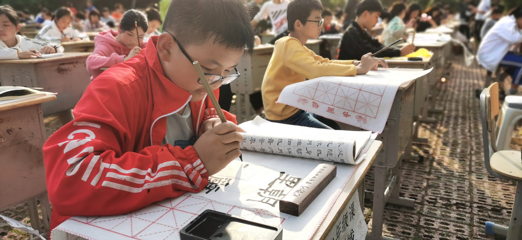 不知道是不是运动场中的奔跑速度太快,快得超越了组委会的预期,前批同学的书画作品还未完成,后批运动场的同学已经满头大汗地跑进广场。一时之间,课桌不够用了。跃跃欲试的后批同学哪肯在边上看着别人龙飞凤舞,自己在一旁干等?草地上,树林边,假山前……四处散布着迫不及待的“文武全才”。他们不等不靠,自己动手,没有桌子,就搬来凳子当桌面,凳子也没有,那就席地而坐——“只要思想不滑坡,办法总比困难多”。人才啊!正源的孩子们果然个顶个都是人才!