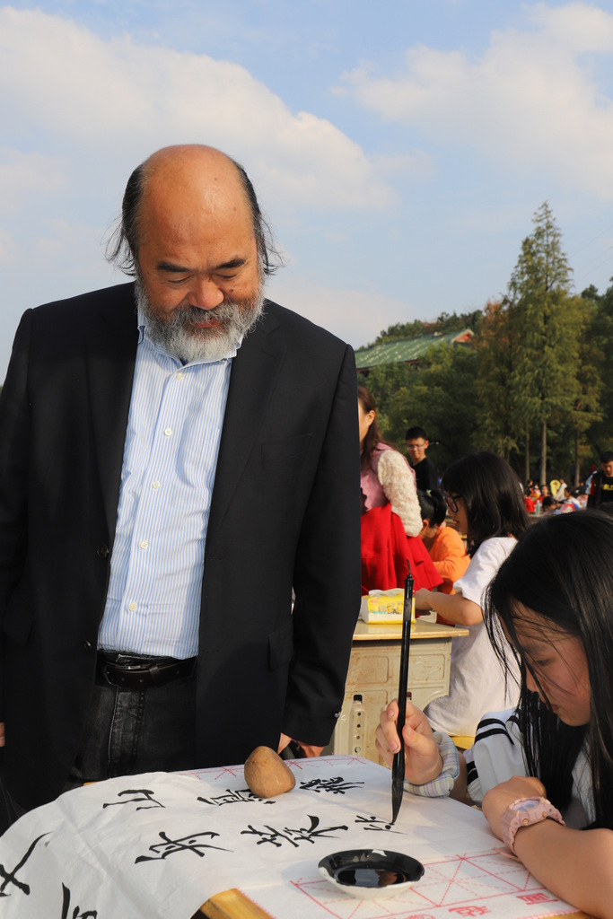 去年的第三届体育艺术节,罗校长在美国正源教育集团出差,没能亲临现场,今年怎能错过呢?昨天刚出席体育艺术节开幕式的罗校长,今天早早就来到广场。教学楼广场已是一片翰墨飘香的海洋。