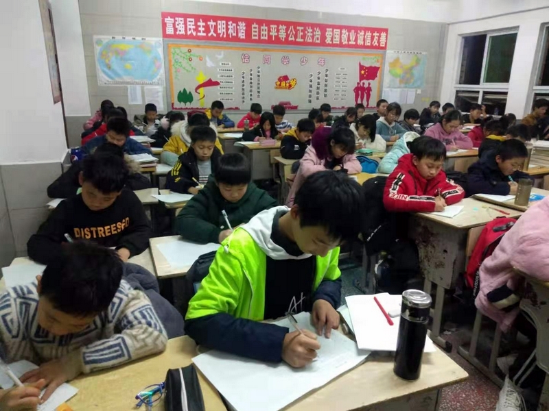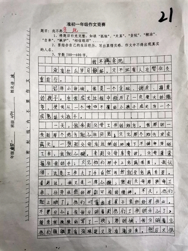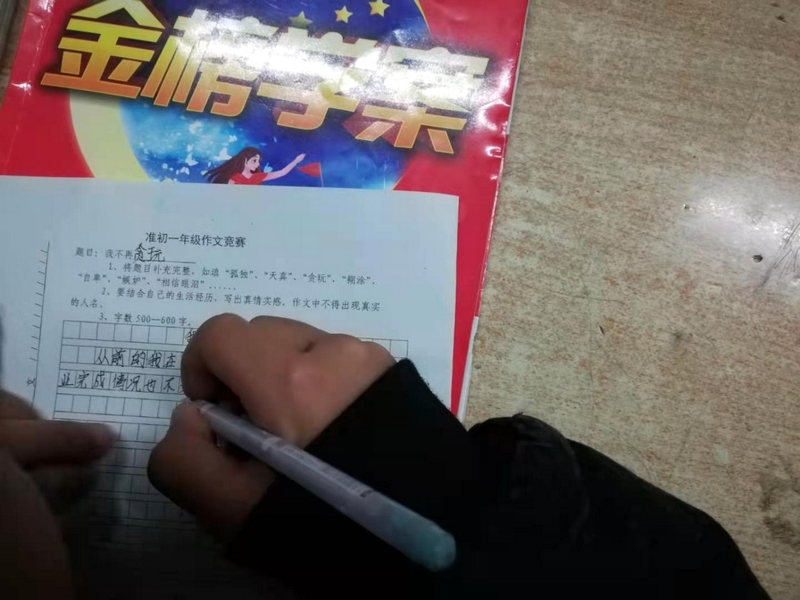 晚上6:30,作文比赛正式开始。同学们或埋头沉思,或奋笔疾书。巡考老师看了看同学们的选题,有写“不再贪玩”的,有写“不再孤单”的,有写“不再相信眼泪”的……