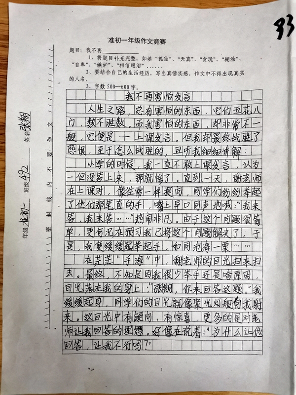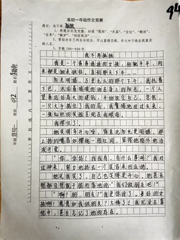 作文是反映学生内心世界、认知范畴的一扇窗户。为丰富学生的校园生活,使广大学生在平日里多想多记,做生活的有心人,同时激发学生学习的热情,提高写作水平,12月28日,正源准初一年级举办了全员参与的作文比赛活动。
