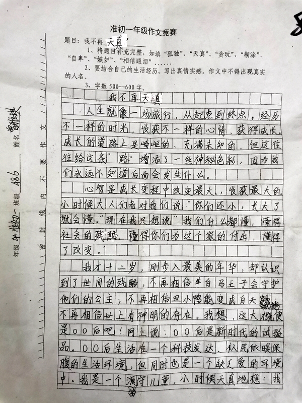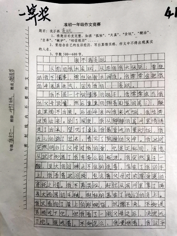 鉴于准初一学生从小学向初中过渡的特殊性,同时也考虑到要贴近同学们的现实生活,便于小同学们把自己的真情实感在作文中落到实处,利于同学们通过作文反映现实、吐露心声,组委会在作文命题上字斟句酌,最终确定以半命题形式的《我不再……》为本次比赛的作文题目。
