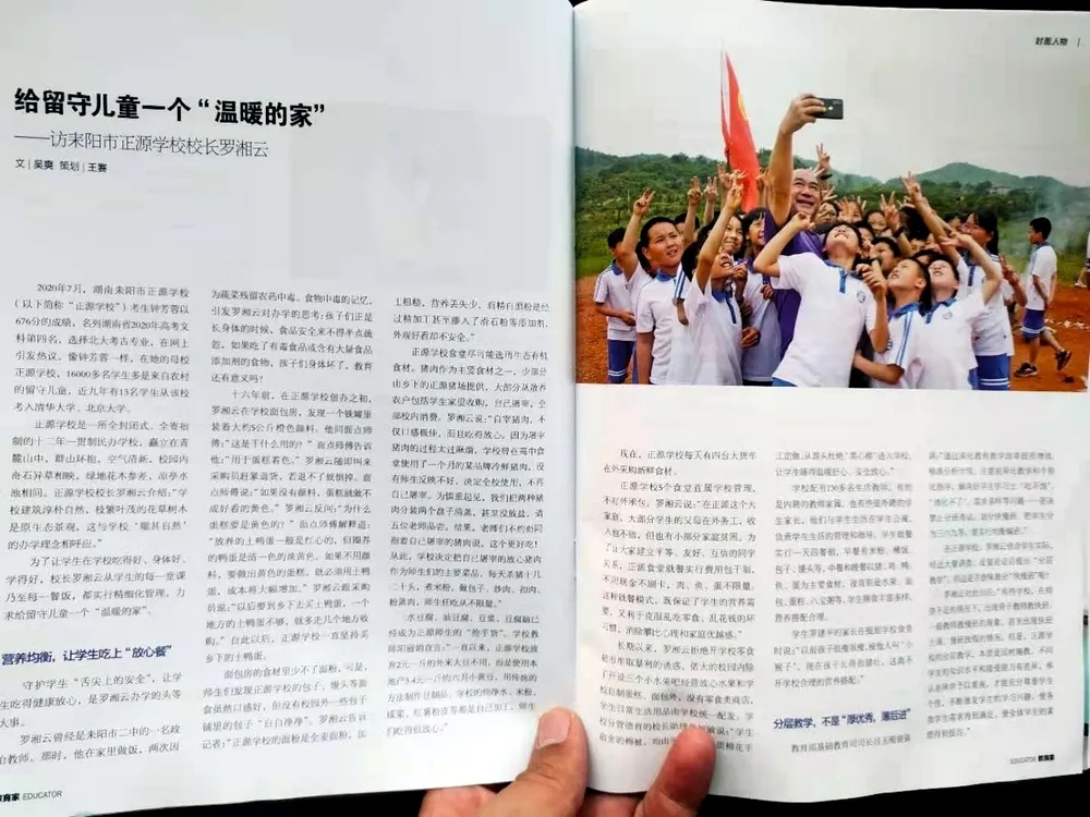 罗校长对农村孩子的天然感情,对留守儿童的独特见解,感动了前来采访的各路记者,他们从不同角度对“正源现象”进行了全方位报道。《教育家》杂志更是从钟芳蓉现象背后,找到了留守儿童在正源超常规成长的秘诀,前来正源探秘的采访部主任吴爽,决定以正源学校给留守儿童一个温暖的家为主题,写作并刊登了《给留守儿童一个 “温暖的家”——访耒阳市正源学校校长罗湘云》。