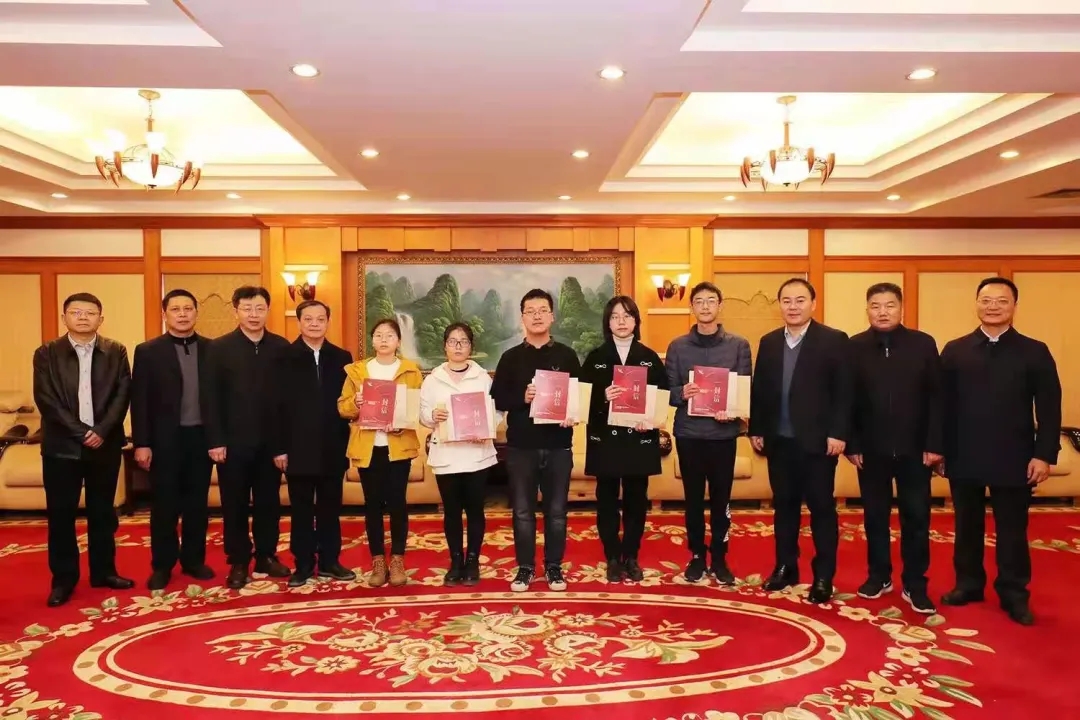 获评“雁城优秀学子”的钟芳蓉、匡雪梅、邹海军、王益铭、秦语嫣与衡阳市领导合影
