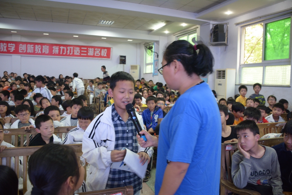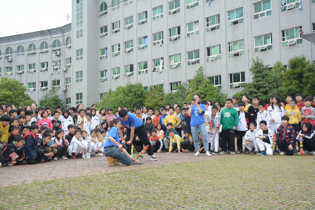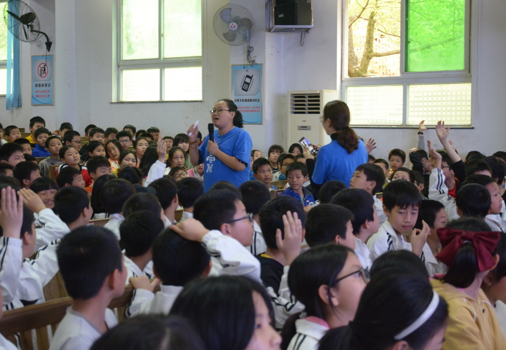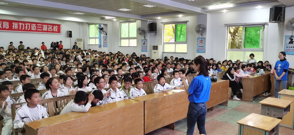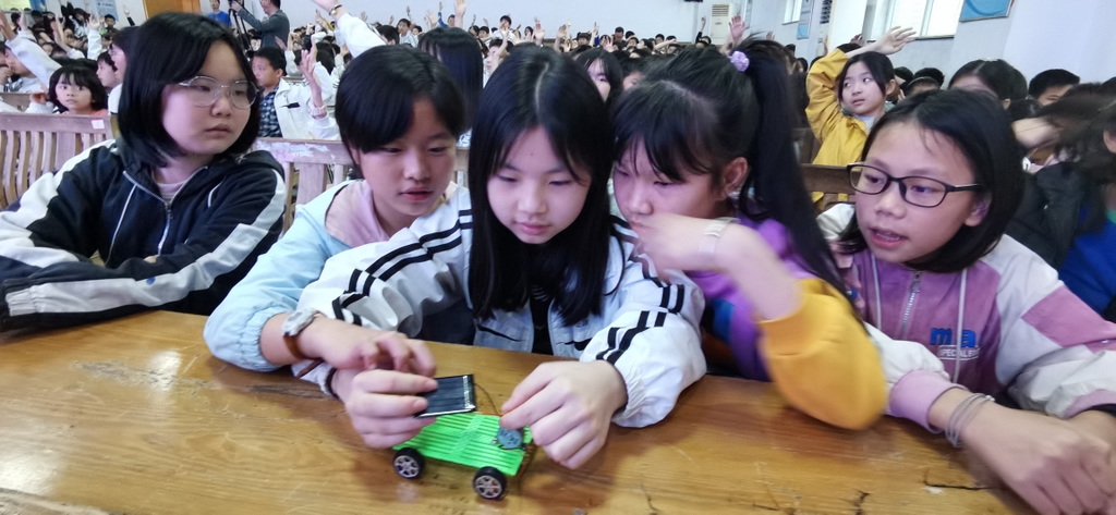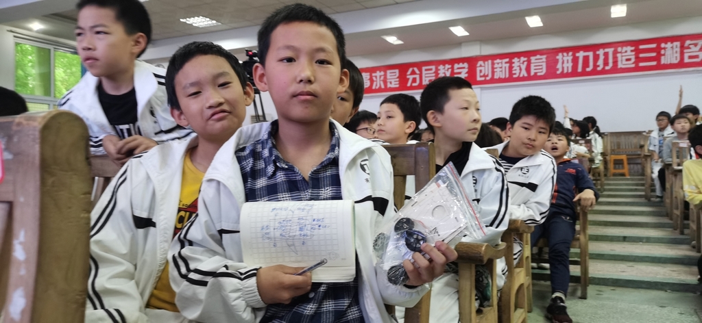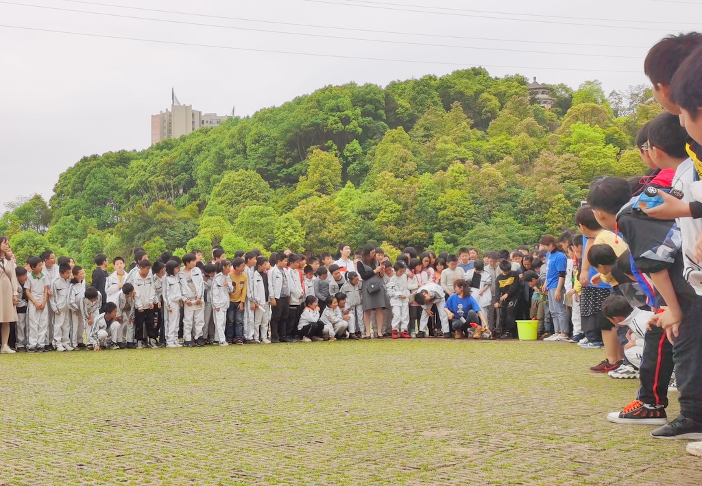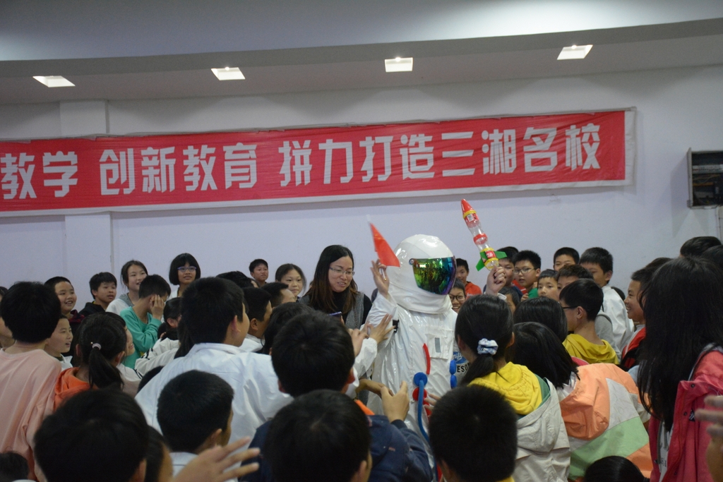 身着白色太空服的“宇航员”,在正源学校报告厅绕场一周,跟同学们击掌致意。