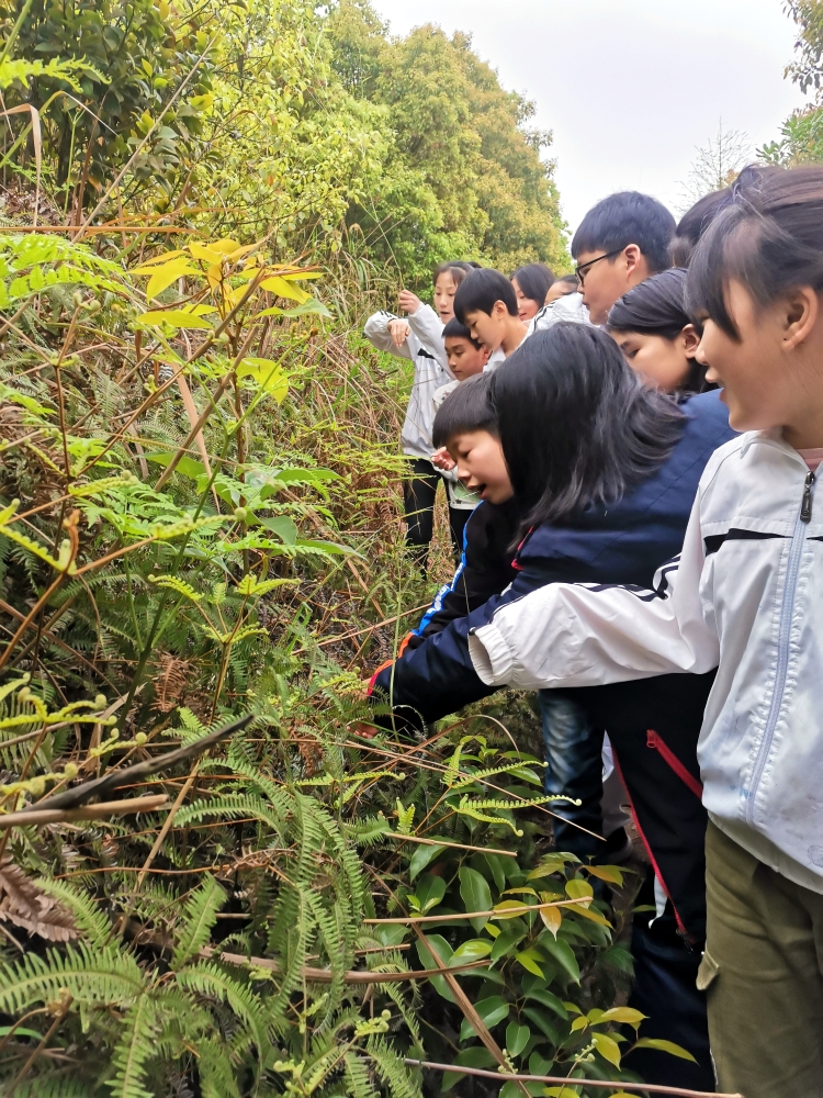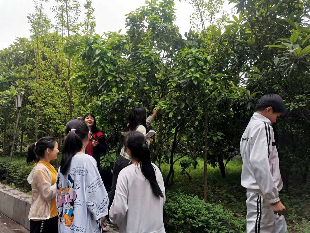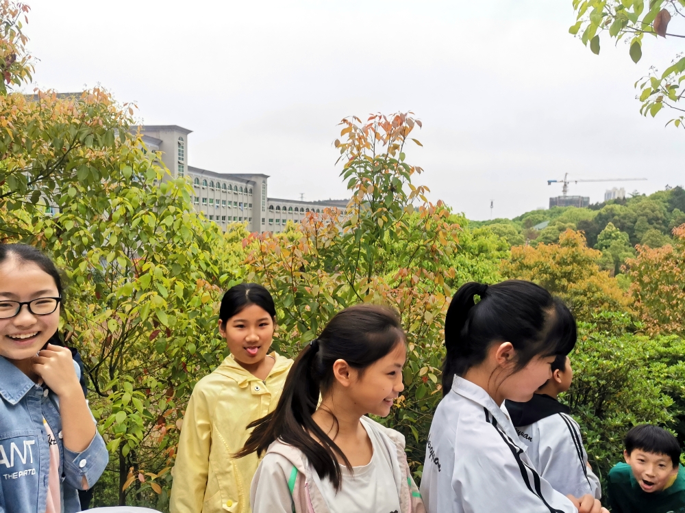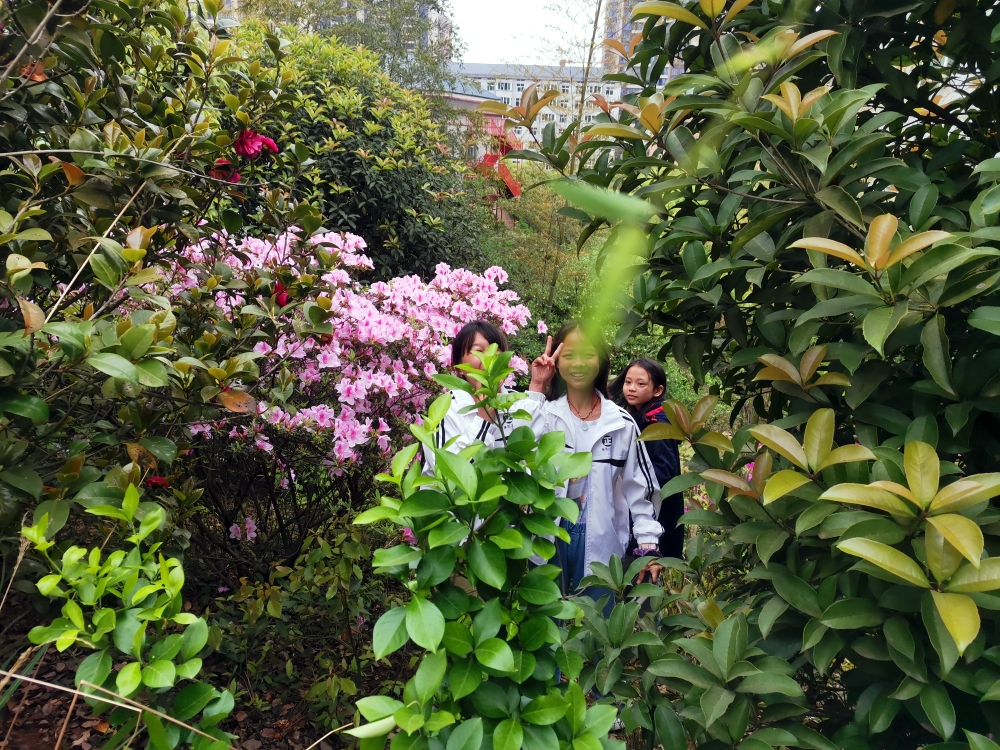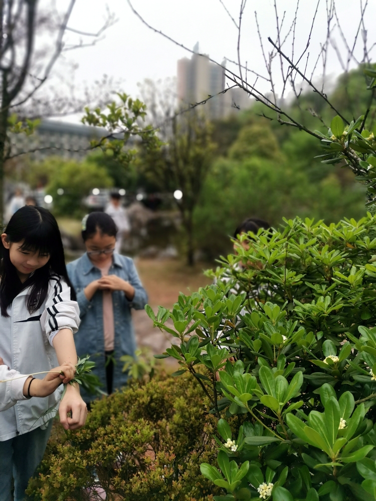 丛生的灌木哪里挡得住孩子们对花花草草的钟爱,这边几个刚刚钻到繁花似锦的粉色杜鹃旁,摇头晃脑地吟诵“人面杜鹃相映红”,那边一堆已在围着女贞树各抒己见“好嫩的花骨朵啊”、“好香”、“甜!”