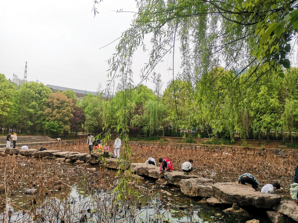 抢不到花瓣的同学却是一脸佛系表情,优哉游哉转到旁边荷花池,去石径上占个好位置,找找小蝌蚪,逗逗小青蛙,悠然自得,其乐无穷。