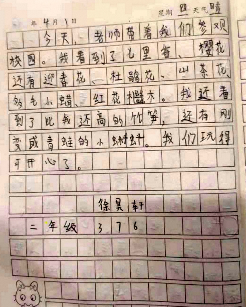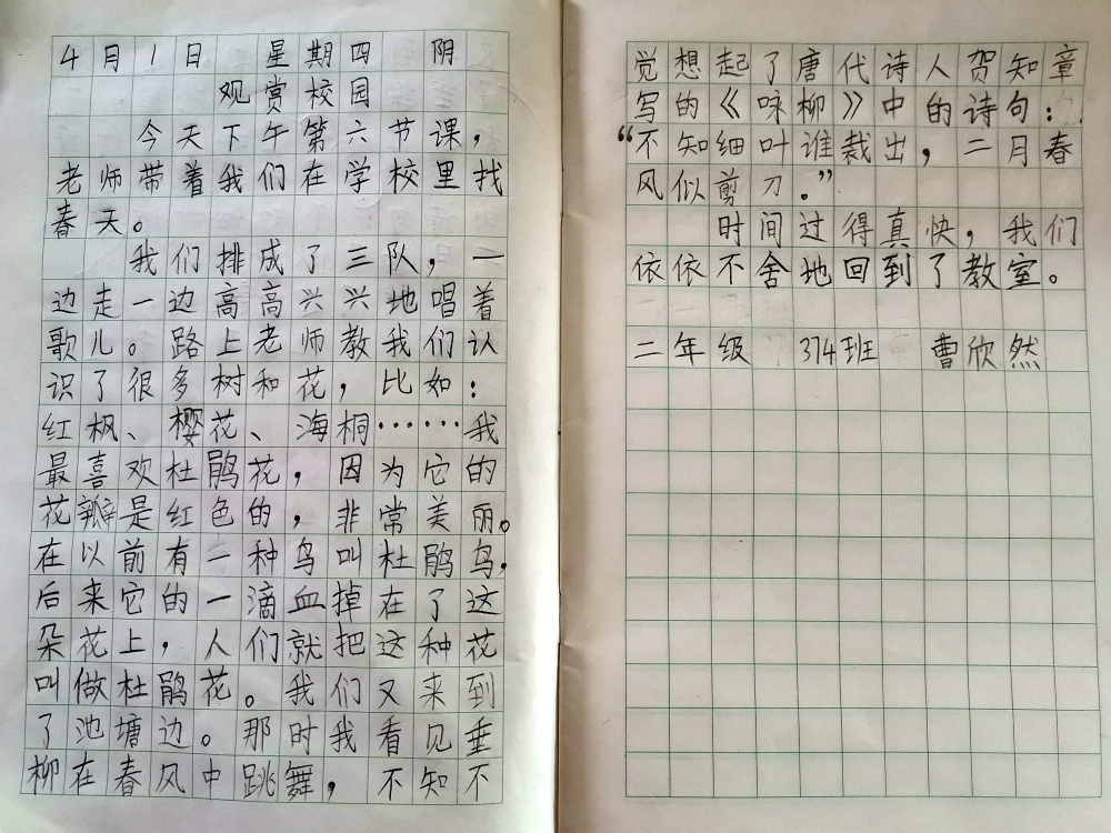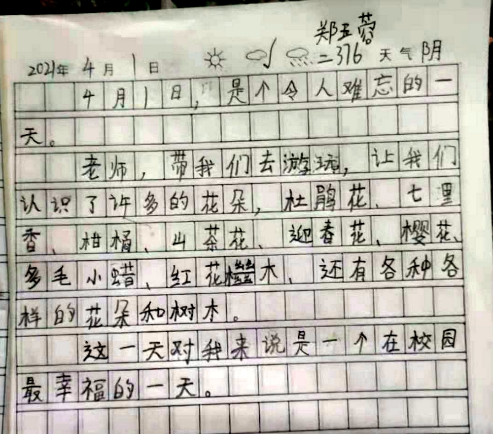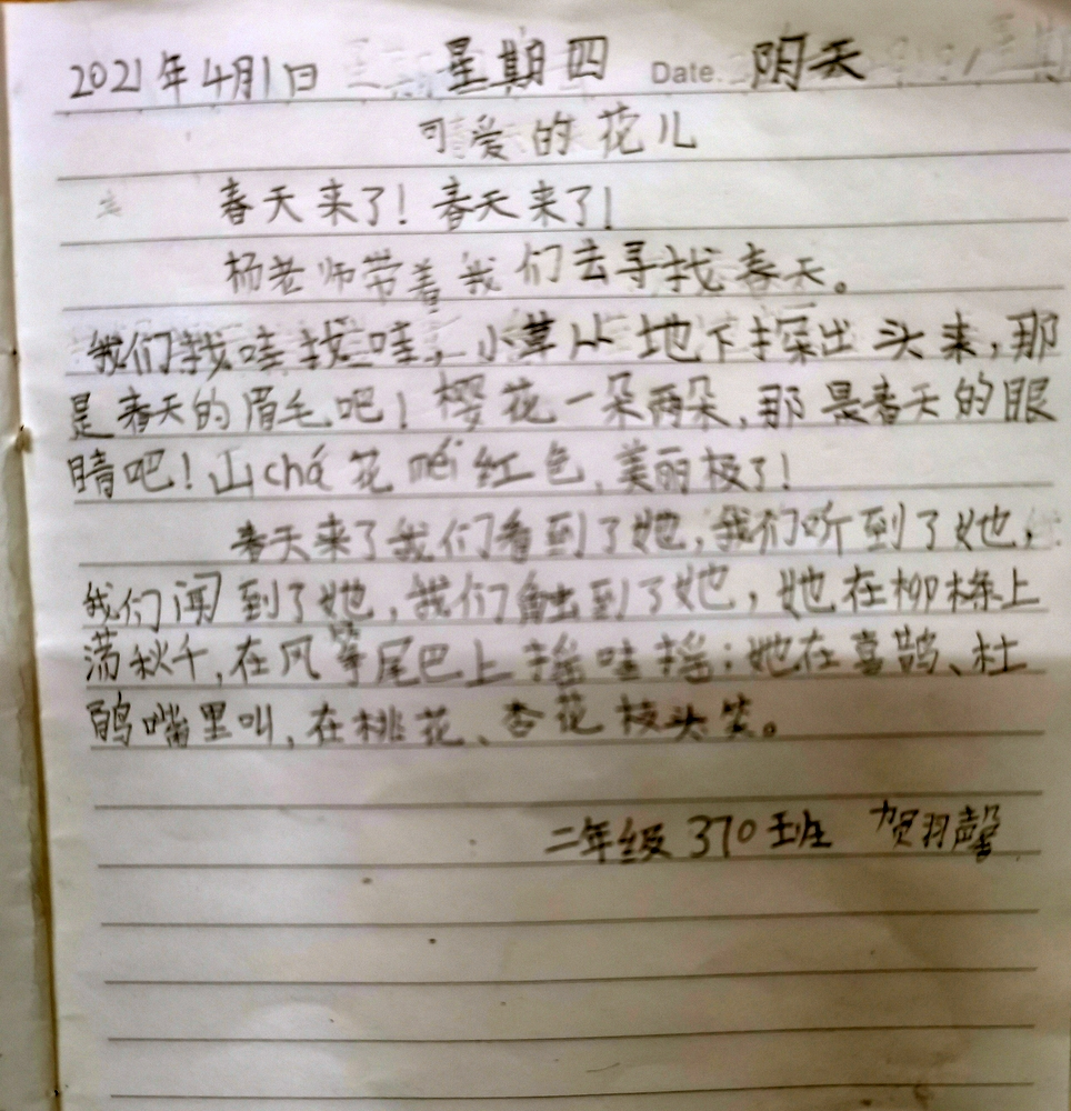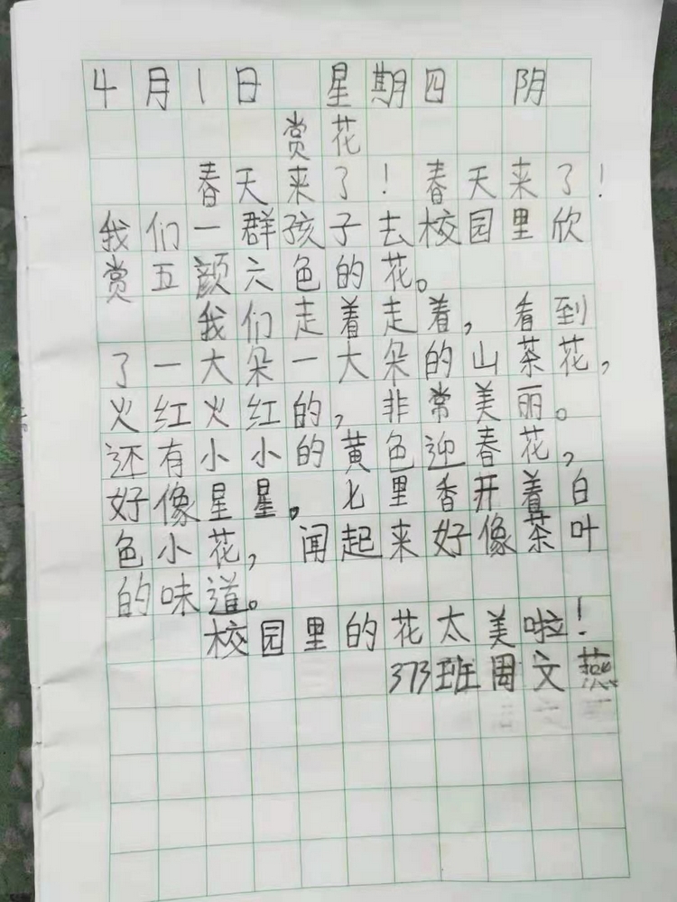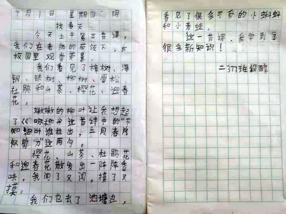 春意盎然、花香四溢的校园里,到处是同学们漫游校园赏春的身影。4月1日小学部二年级的同学在语文老师的带领下,开展了“爱在春天,美在校园”为主题的漫游校园活动。