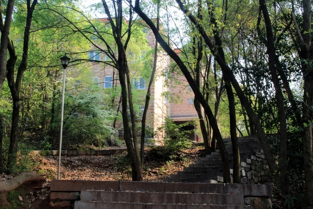 从西山的东边下来,便到了学校的南大门,站在门口往里看,你会惊奇地发现,左边的西山犹如巨龙盘卧,右边的东山仿佛白虎蛰伏,巨龙白虎拱卫着校园。