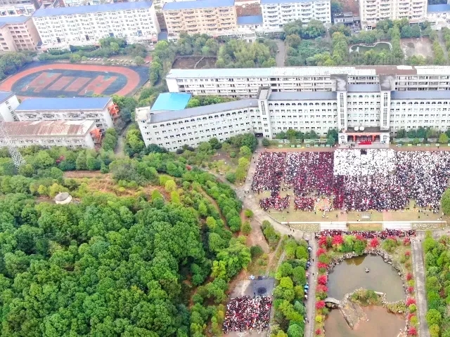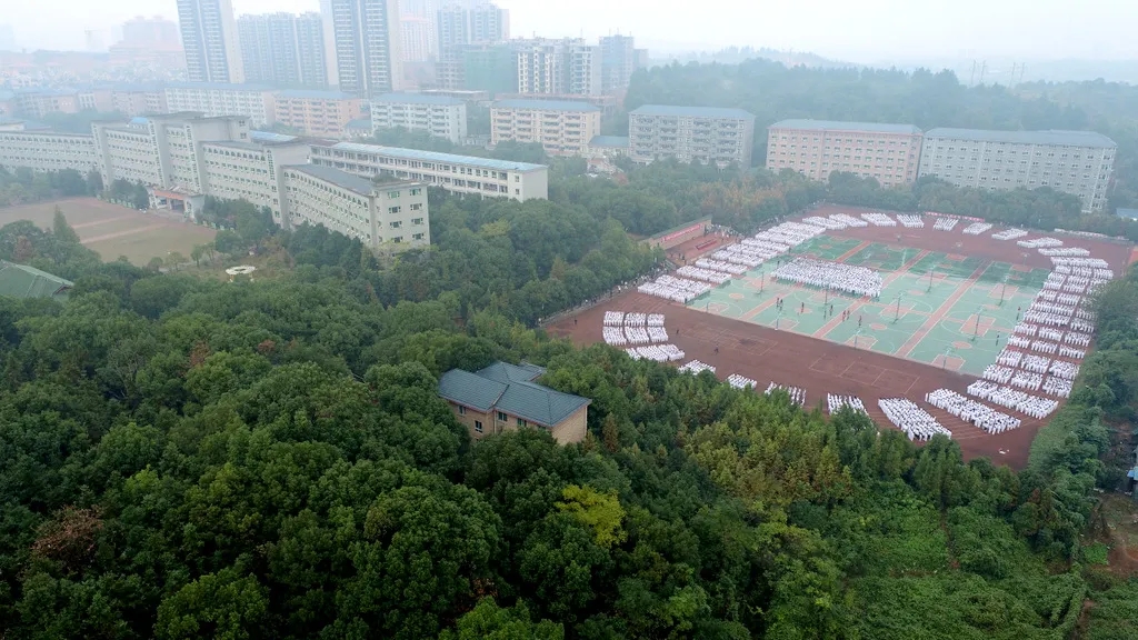 抵达山顶,立足山顶的观景亭往南望,披云带彩的鹿岐峰朦朦胧胧,若隐若现;往北俯视,左前方是小学部,礼正楼、文正楼、武正楼错落有致,浑然一体。屋顶的琉璃瓦在阳光下光芒四散,红砖堆砌的墙体也格外惹眼,给人以古朴厚重之感。右前方是校广场,广场由带孔的红砖铺垫,砖孔里种草,这样的设计使得夏天不烫脚,雨天不藏水。要是在这个时节的雨天站在观景台远望广场,就会呈现一种“天街小雨润如酥,草色遥看近却无”的奇妙景观。广场后面就是主教学楼,楼高七层,长240米,好似大鹏展翅,寄寓正源学子学必有成,一飞冲天!
