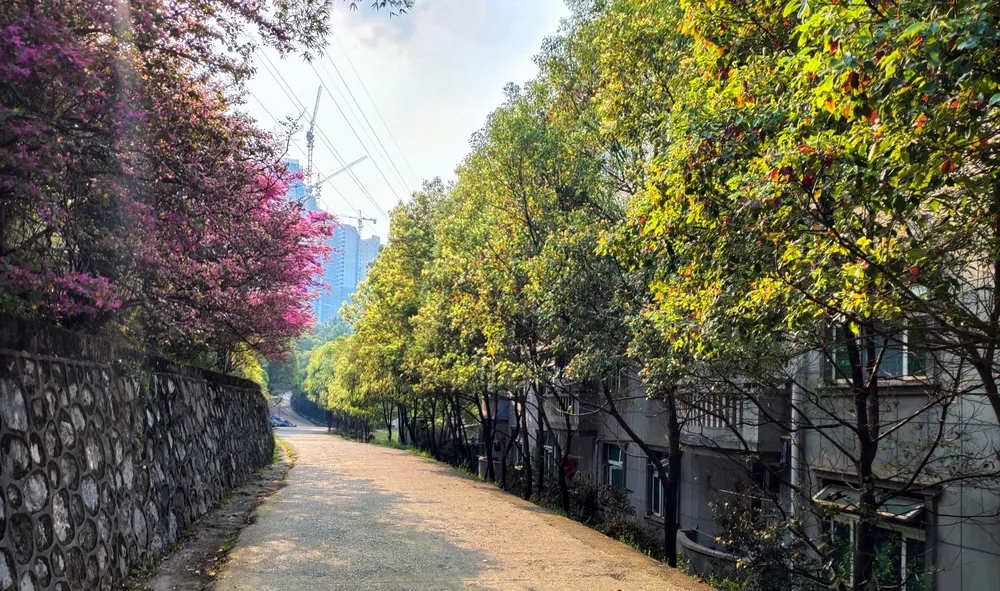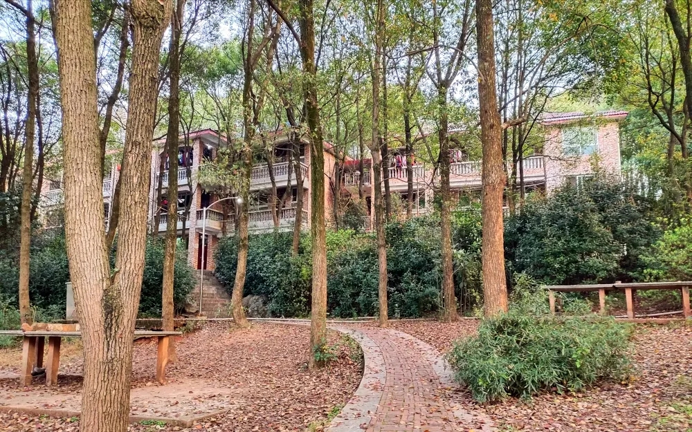西山脚下,是一条古色古香的青石台阶。拾级而上,道路两旁的樟树苍翠欲滴、浓荫蔽日,宛若挺拔的仪仗兵,夹道相迎来客。上完台阶,拥有浓郁民国气息的仿古建筑——西苑就出现在眼前,它坐落在半山之上,绿瓦红墙,古朴庄重。西苑门前的环山路蜿蜒盘旋,沿着它继续上行,山间的野草野花芬芳扑鼻,林中的调皮小鸟欢快歌唱,还有许多活泼可爱的小学生在窜上窜下,嘻笑打闹,既有森林的清幽,又有市井的喧闹,真是别有一番风味。