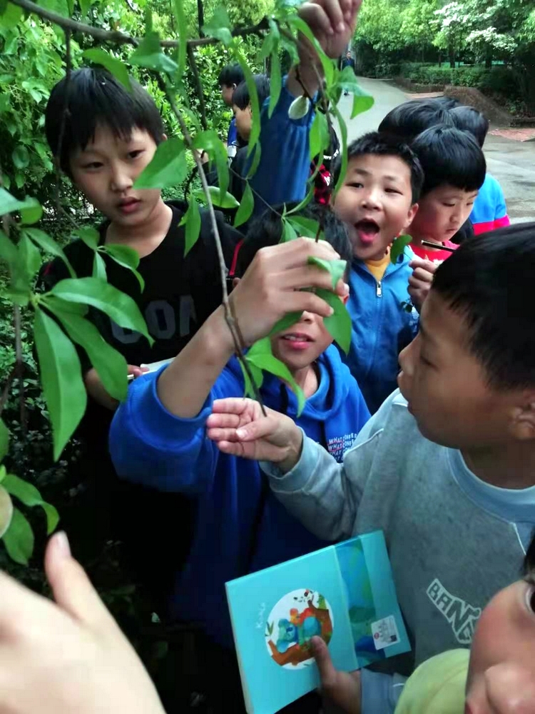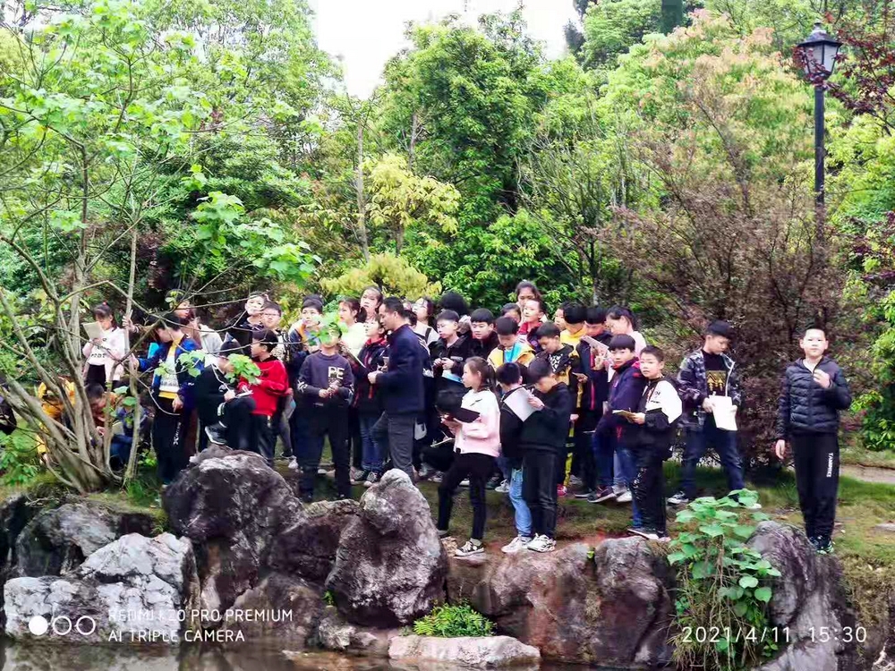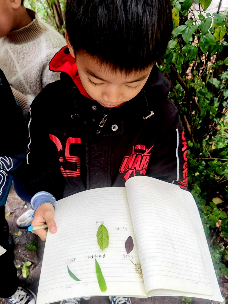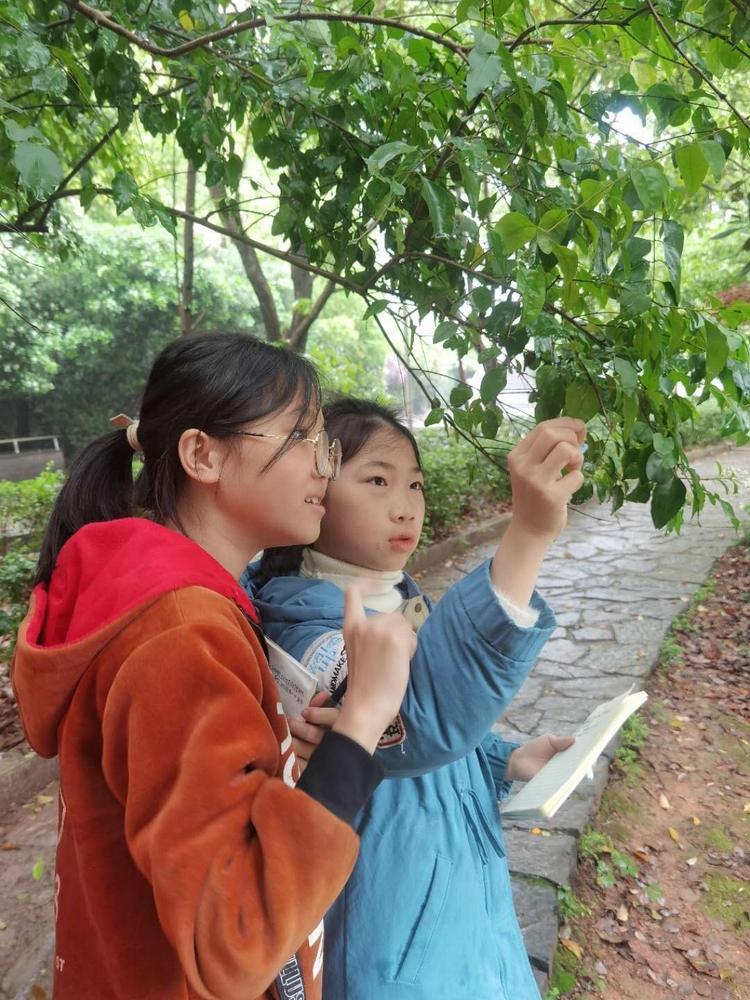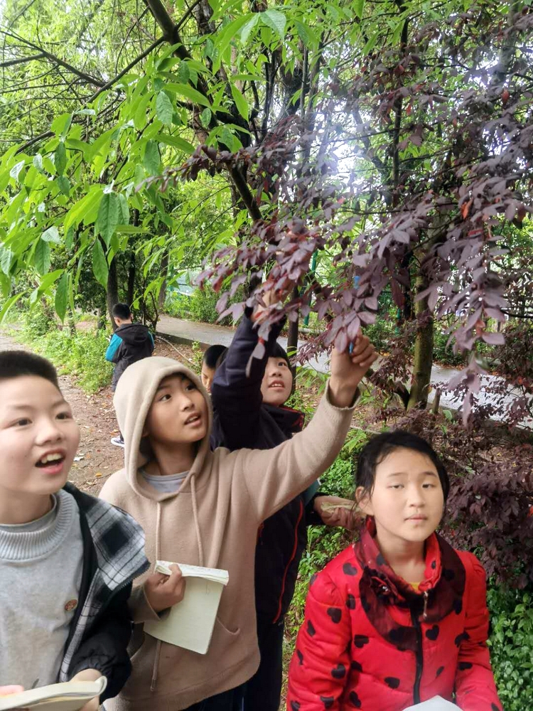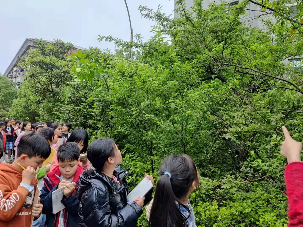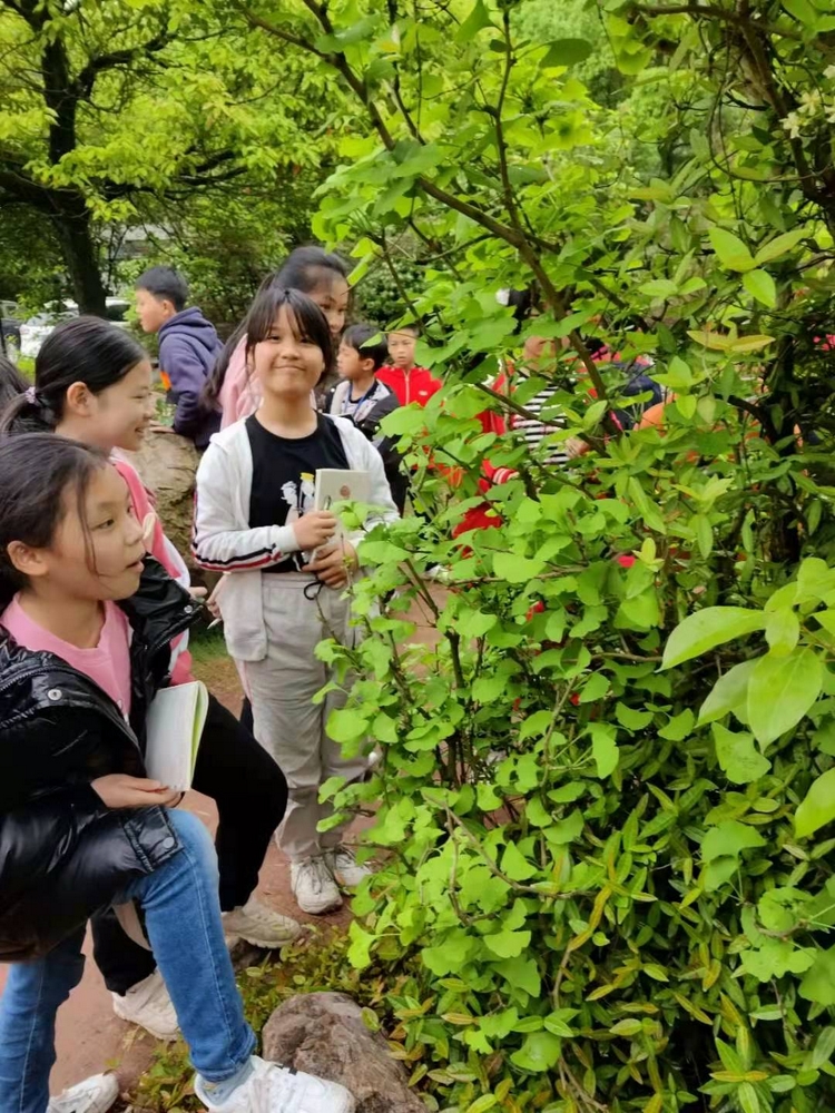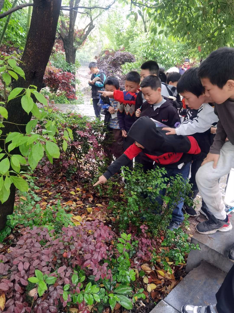 一群群拿着纸和笔的孩子簇拥在老师身边,漫步在校园的环形水泥道上,叽叽喳喳,热热闹闹,孩子们惊奇地发现,这青绿之中竟藏着这么多不同种类的植物呀!面对不熟知的种类,孩子们都睁着求知的双眼,一遍遍的询问老师,此时的语文老师恨不得化身为生物老师,不厌其烦的拿着手机拍图识物,把自己有限的树木花草知识讲解给孩子们听。