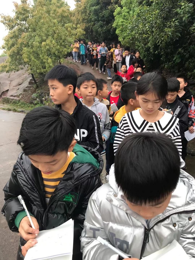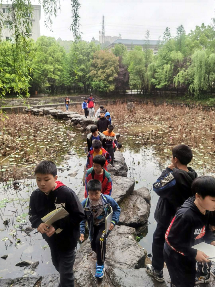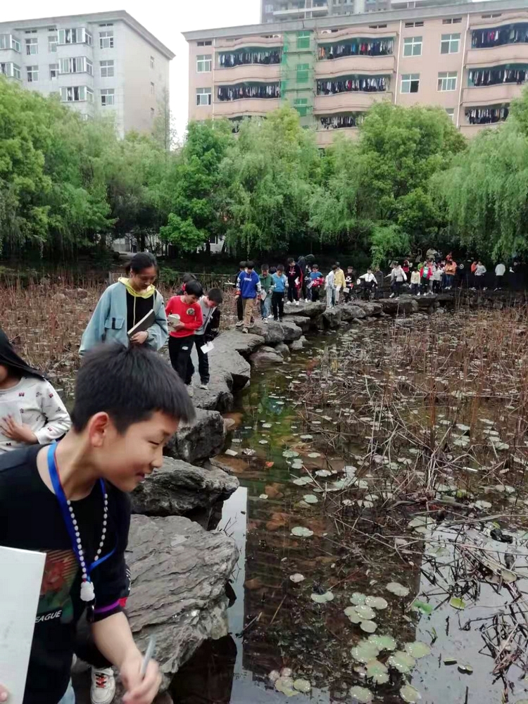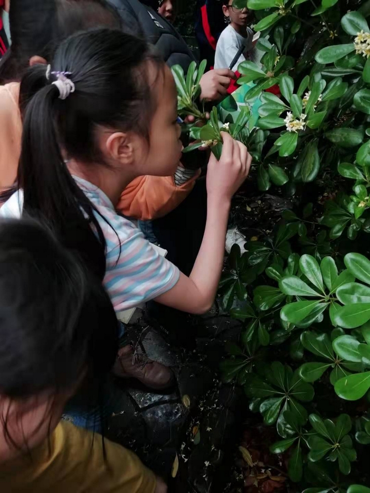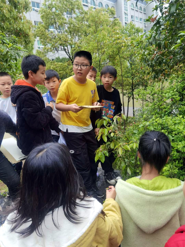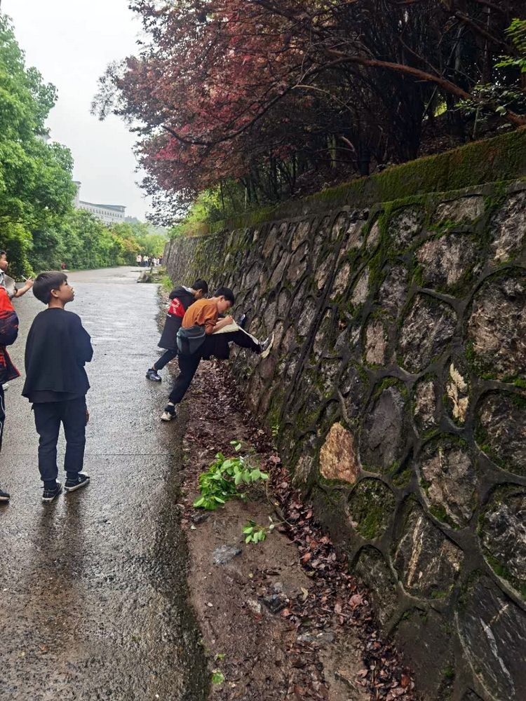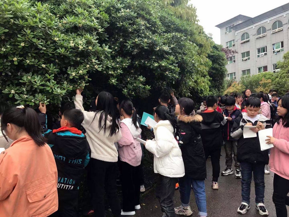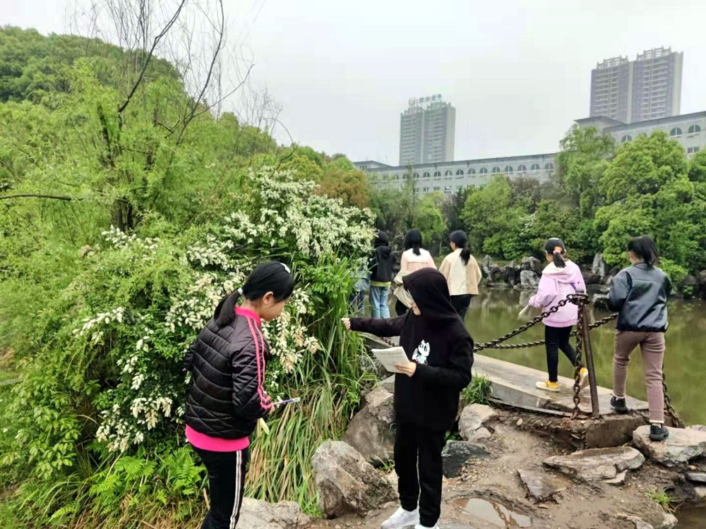 一群群拿着纸和笔的孩子簇拥在老师身边,漫步在校园的环形水泥道上,叽叽喳喳,热热闹闹,孩子们惊奇地发现,这青绿之中竟藏着这么多不同种类的植物呀!面对不熟知的种类,孩子们都睁着求知的双眼,一遍遍的询问老师,此时的语文老师恨不得化身为生物老师,不厌其烦的拿着手机拍图识物,把自己有限的树木花草知识讲解给孩子们听。