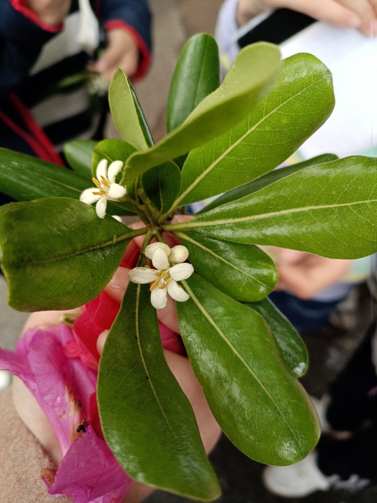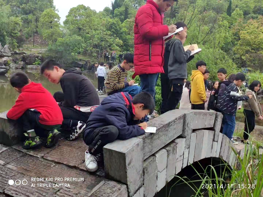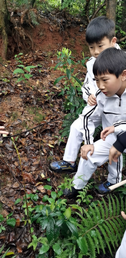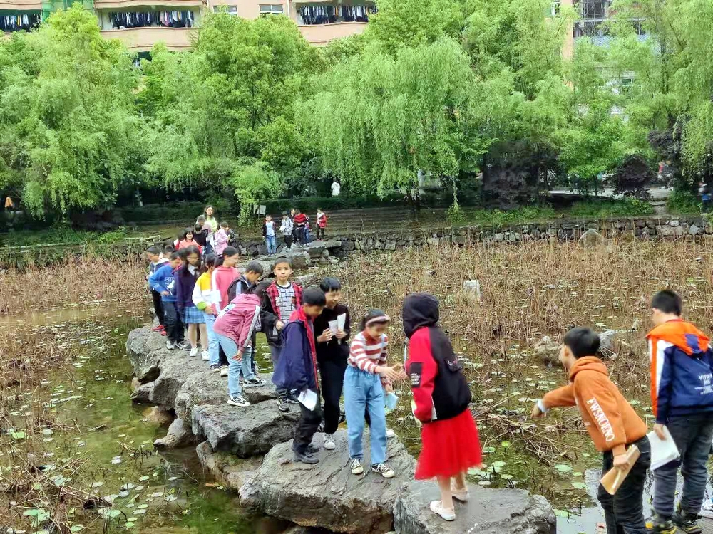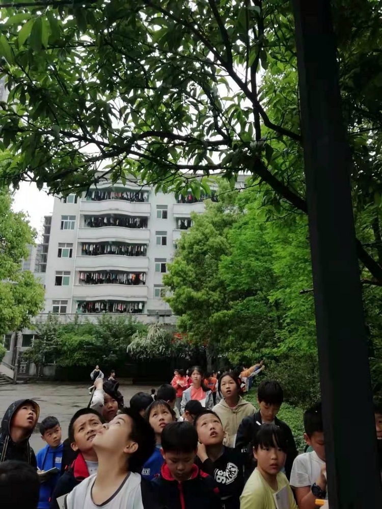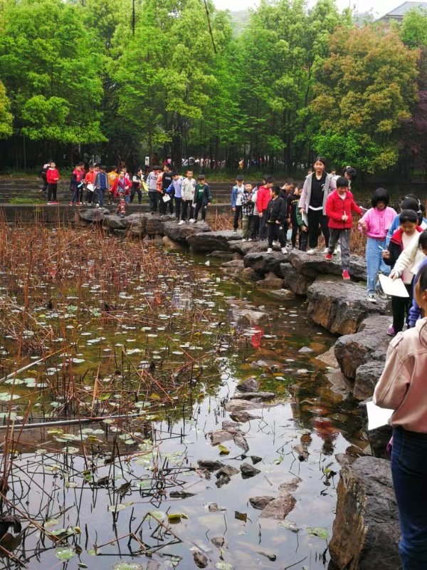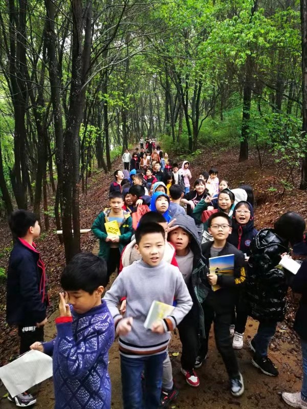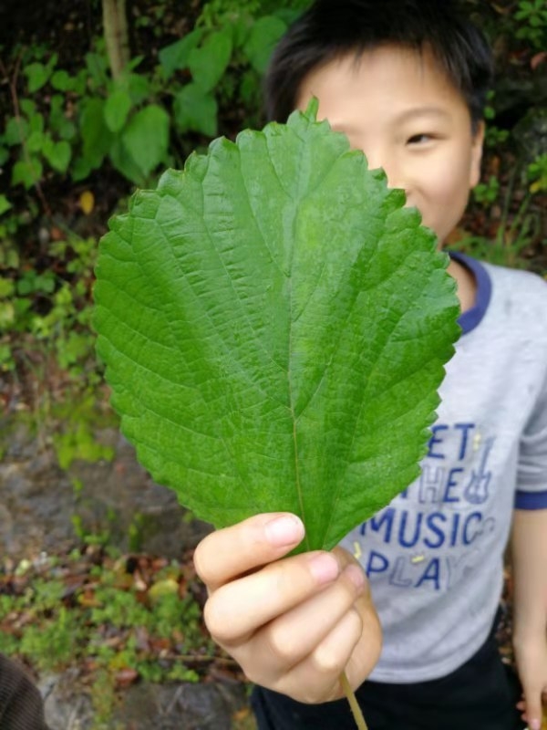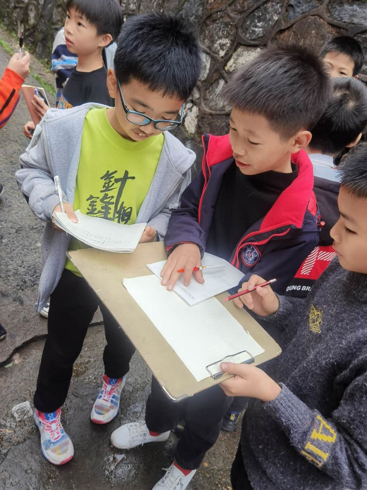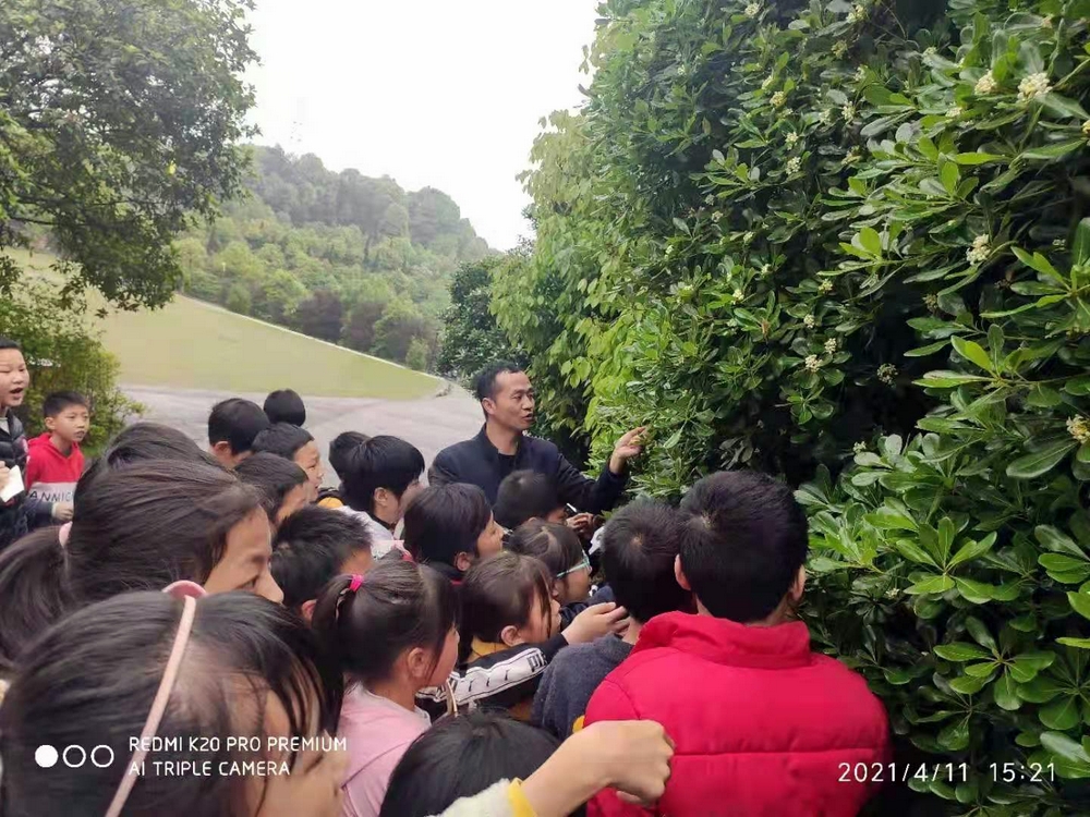 一群群拿着纸和笔的孩子簇拥在老师身边,漫步在校园的环形水泥道上,叽叽喳喳,热热闹闹,孩子们惊奇地发现,这青绿之中竟藏着这么多不同种类的植物呀!面对不熟知的种类,孩子们都睁着求知的双眼,一遍遍的询问老师,此时的语文老师恨不得化身为生物老师,不厌其烦的拿着手机拍图识物,把自己有限的树木花草知识讲解给孩子们听。