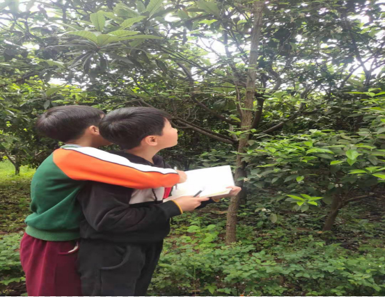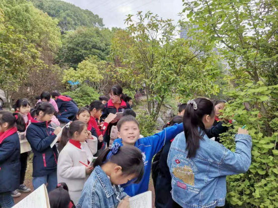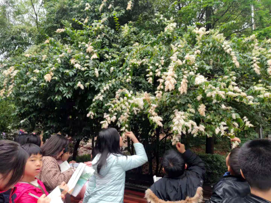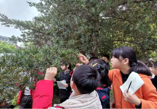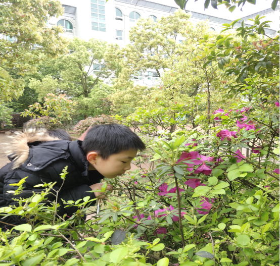 孩子们沿着校园路漫步前行。路旁的野花、山中的鸟鸣、风中的清香,都让大家沉醉不已。老师们则像称职的导游,耐心、细致地在一旁讲解:“这是盛开的‘海桐’,因为花气袭人,又名‘七里香’,清代诗人柳是,曾赞美‘海桐花发最高枝,碧宇霏微芳树迟。’”。“那是‘杜鹃花’,别名‘映山红’,李白曾描写道:‘蜀国曾闻子规鸟,宣城还见杜鹃花’……”孩子们一边听,一边记,时而凑上去闻一闻,时而伸出手摸一摸,在轻松愉快的气氛中,不知不觉已学了不少知识。