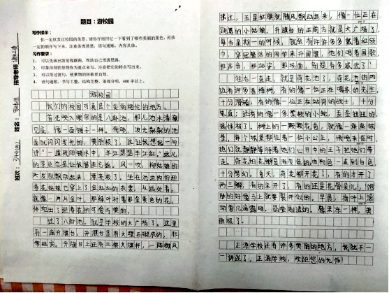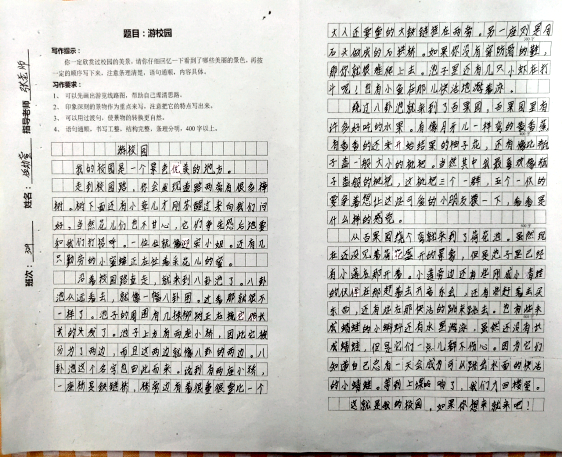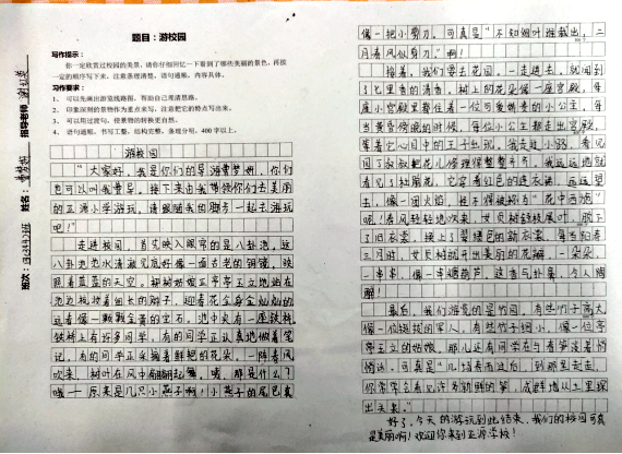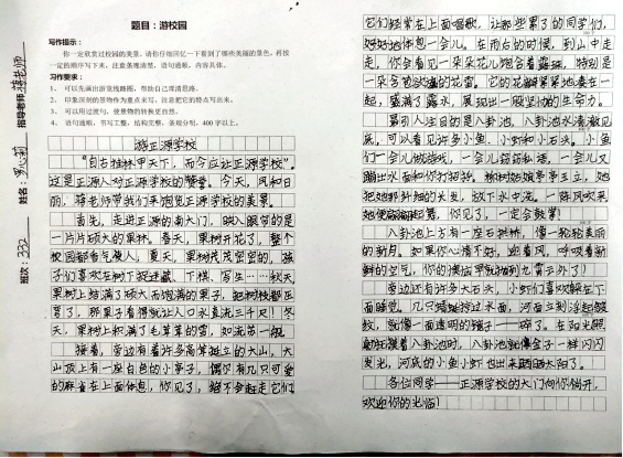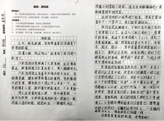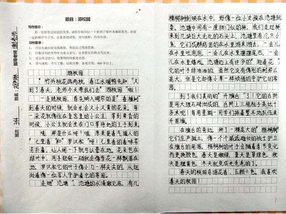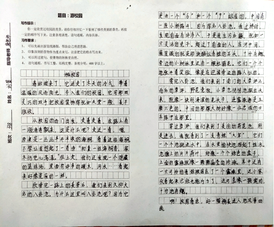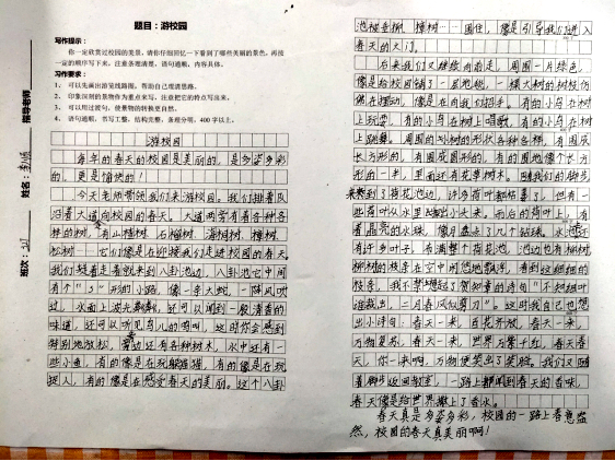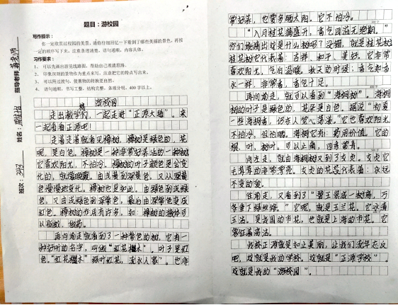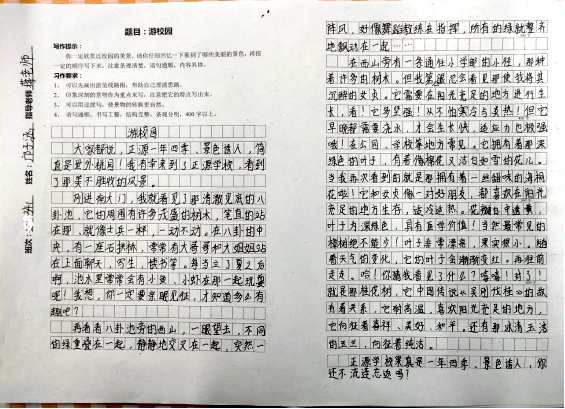 游园结束后,语文老师们趁热打铁,立即举行了一场全年级的作文竞赛。结合学生们的所见、所闻、.所感,一篇篇优美的文章,呈现在我们眼前。
