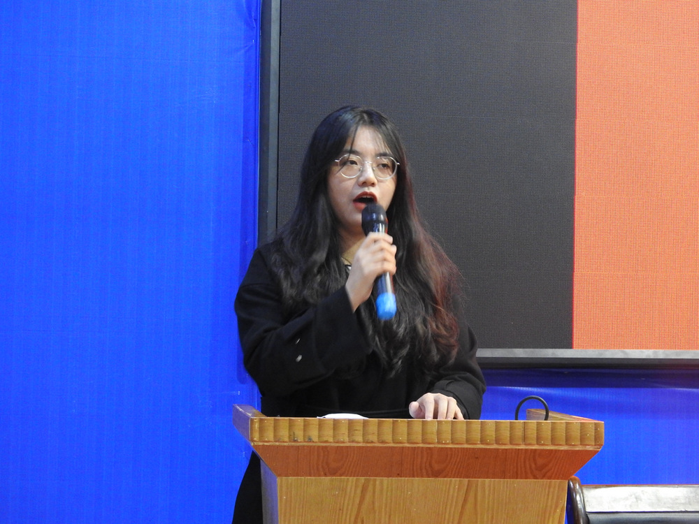 “大会进行第一项,有请学生代表260班雷倩琳同学发言。”雷同学主修传媒专业,在本学期第一次月考中,以超出第二名10分的骄人成绩勇夺第一,她在发言中谈到了自己的学习经历,要求同学们掌握科学的复习方法,多读多记、多做题多思考,勤于练习永不放弃,向着自己的艺术梦迈进!最后,她勉励同窗学友“我们既不能辜负学校和老师对我们的悉心栽培,也不能辜负家长对我们的期望。”