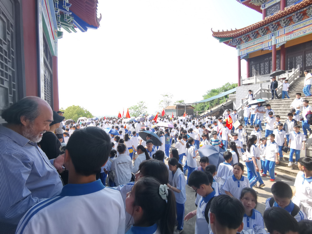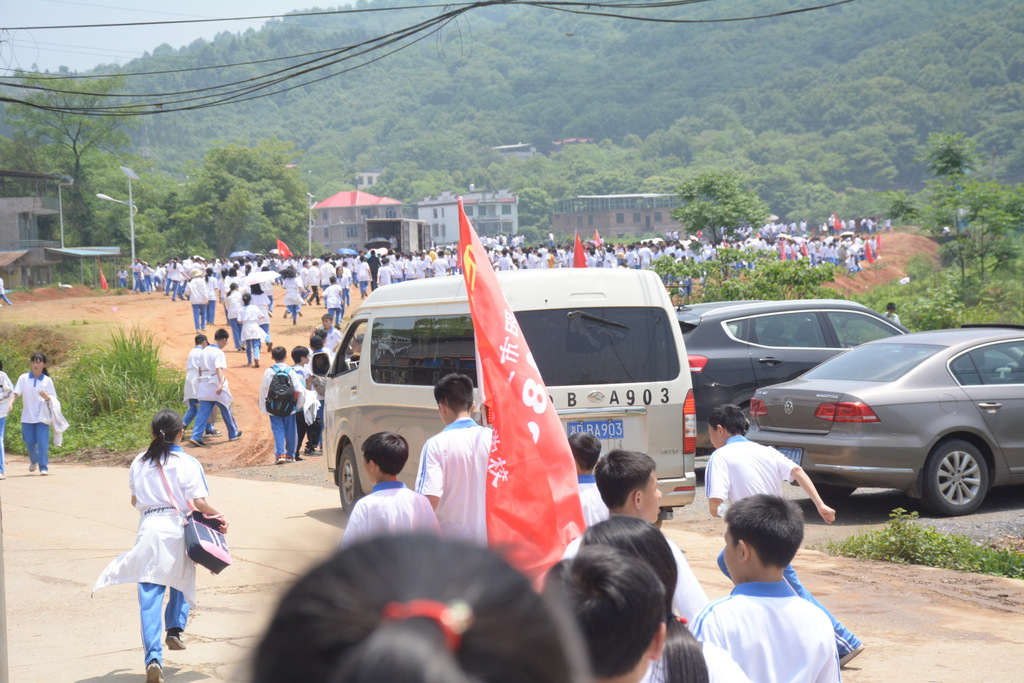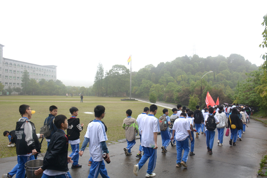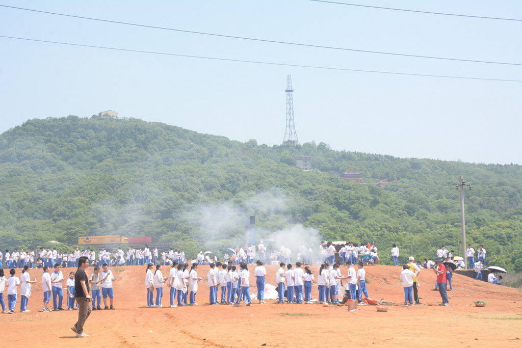 收拾餐具送还到随行的后勤校车,打扫干净野炊营地,开始爬山。1200人的队伍沿着山路盘旋而上,22面班旗在山间延绵不绝。