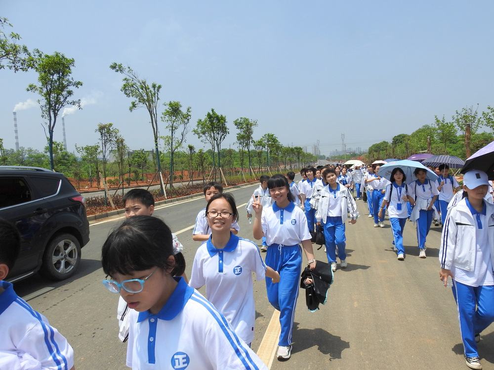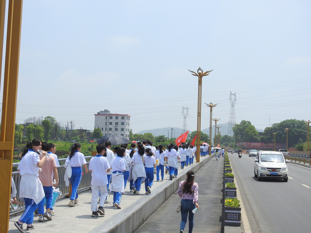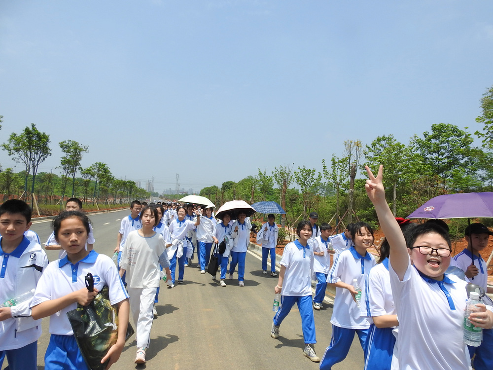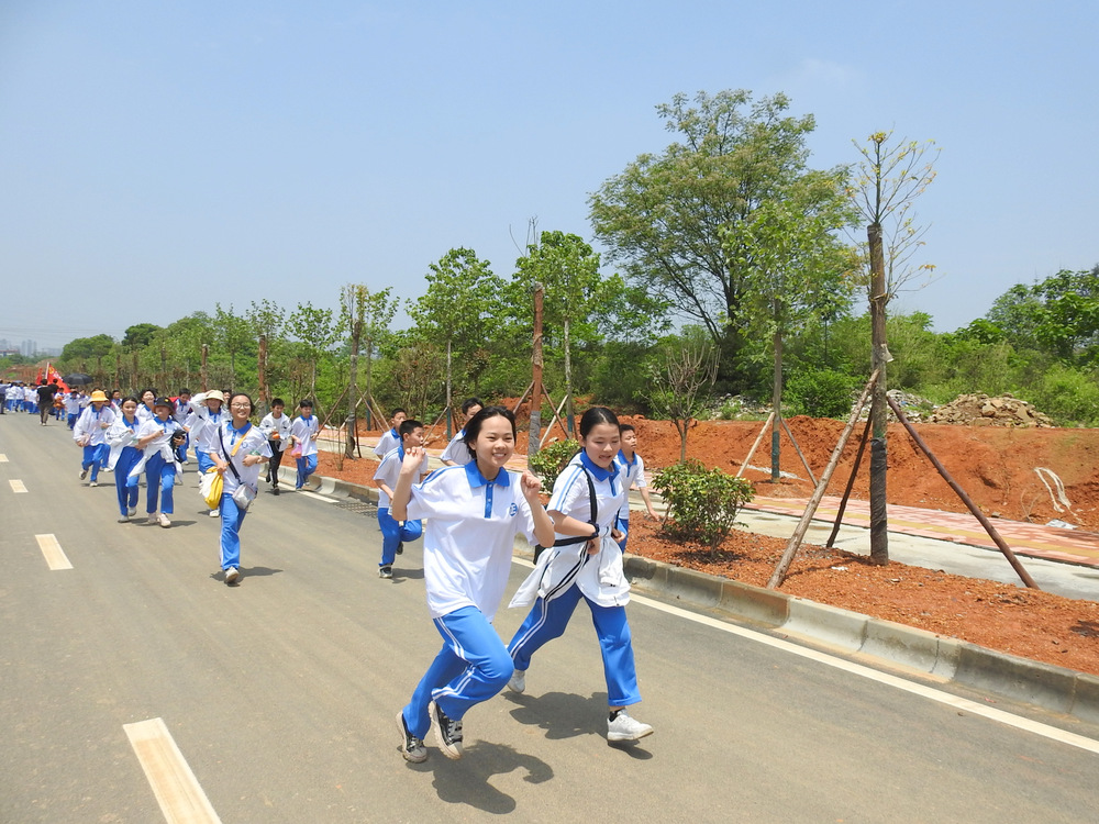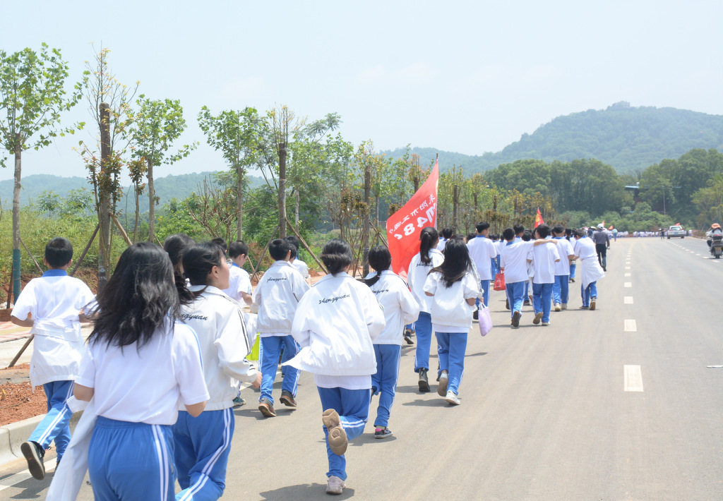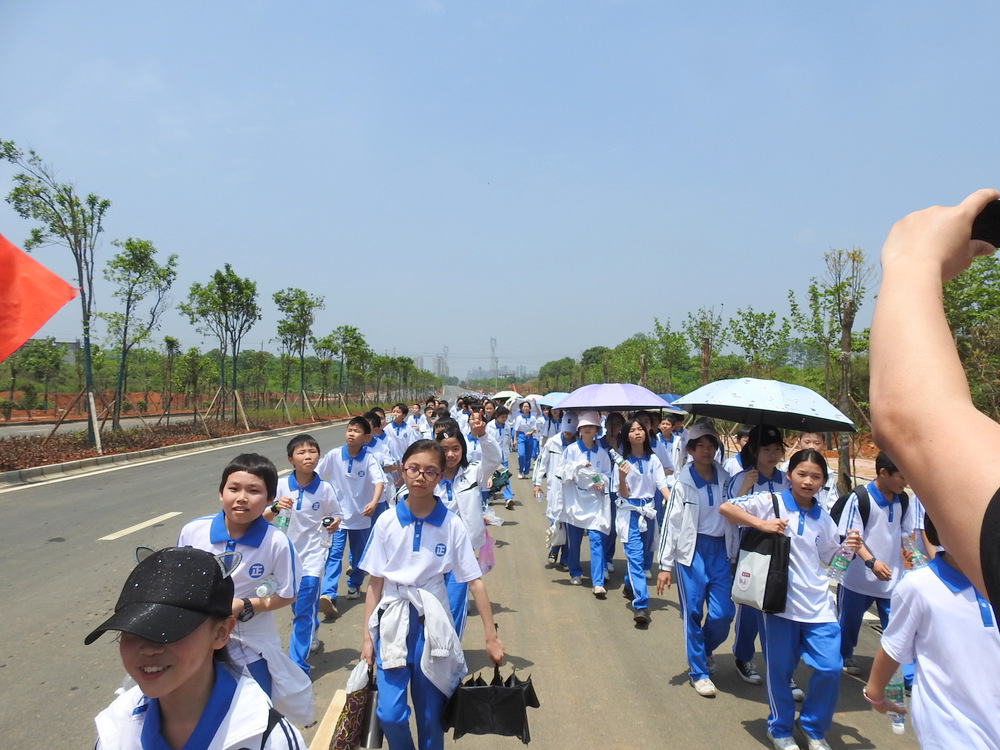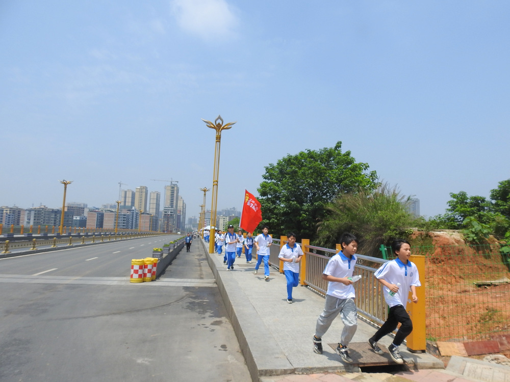 经过群英南路,转过和谐南苑,通过鹿岐峰大桥,已是正午时分,高照的艳阳早已驱散连日的阴霾,火辣辣地照射着地面。同学们开始擦拭额头的汗珠,脚步也渐渐变得沉重。