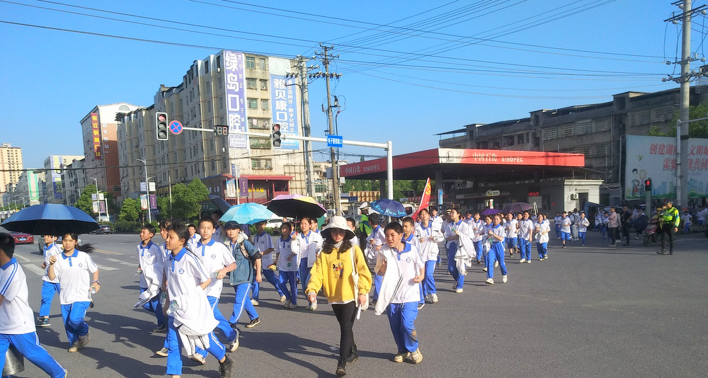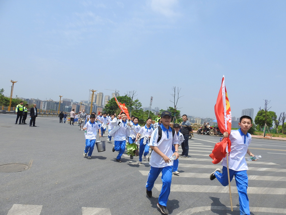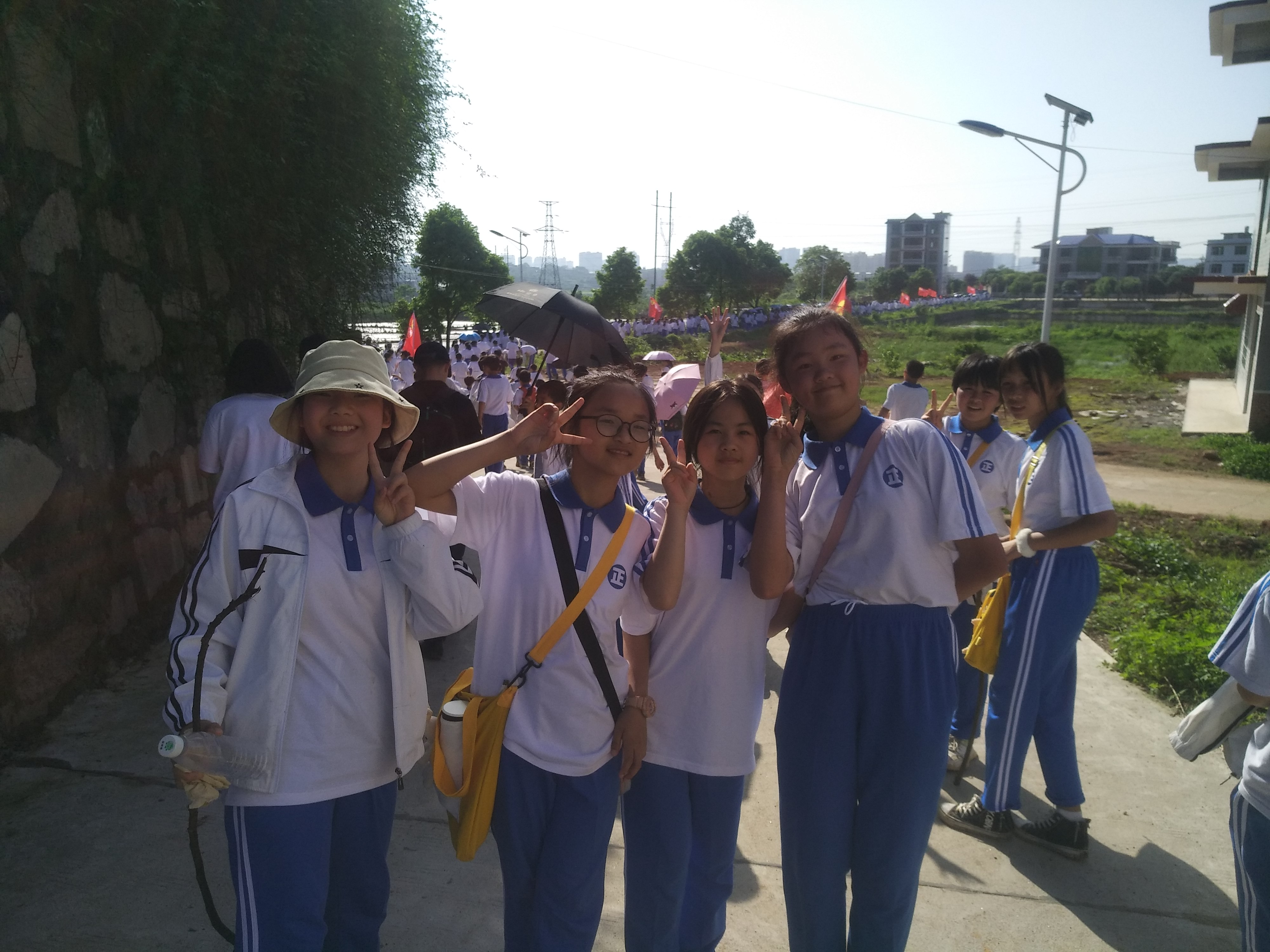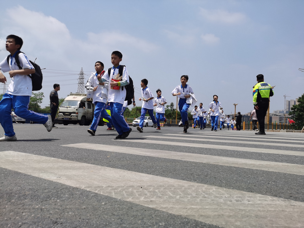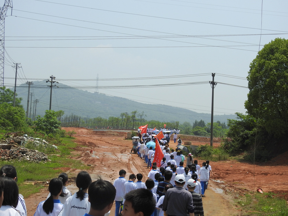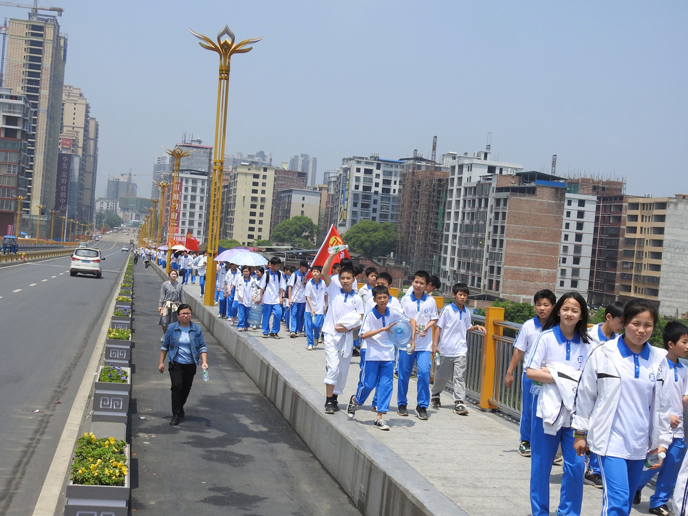 经过群英南路,转过和谐南苑,通过鹿岐峰大桥,已是正午时分,高照的艳阳早已驱散连日的阴霾,火辣辣地照射着地面。同学们开始擦拭额头的汗珠,脚步也渐渐变得沉重。