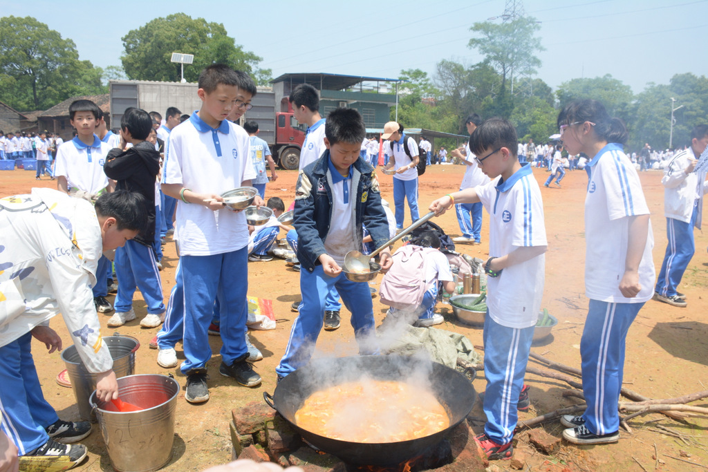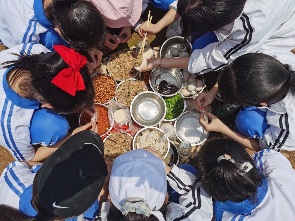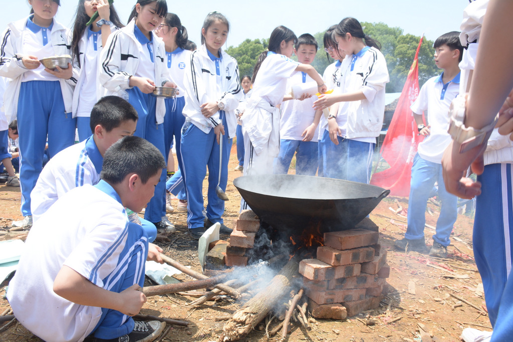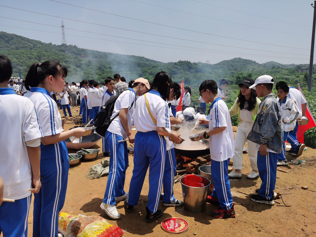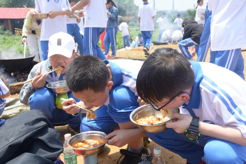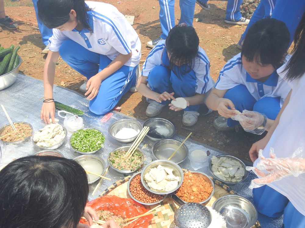 22个班级散落在营地四周,大家兴高采烈地忙碌起来。男生搬砖、垒灶、打水,女生们刷锅、洗菜、包饺子,班主任生火、烧水、下调料。一阵忙碌过后,炊烟缕缕升起,香味阵阵飘来,饺子、面条纷纷出锅。自己的劳动成果,自然是格外香甜,一边大汗淋漓,一边狼吞虎咽,大快朵颐的同时还不忘互相竖起大拇指:“超级好吃!”