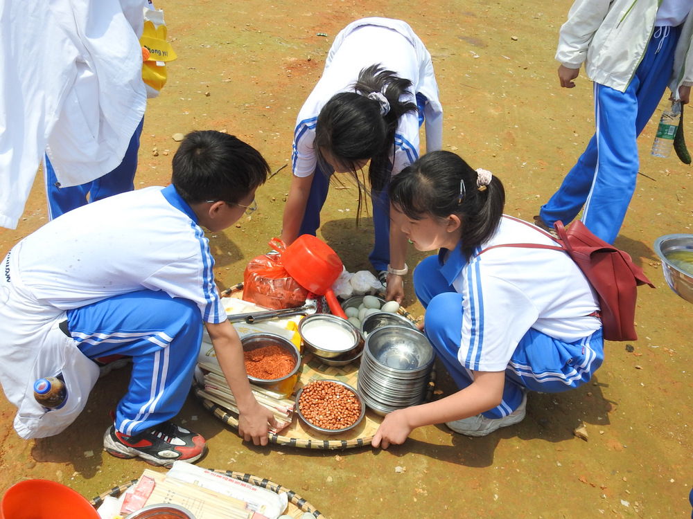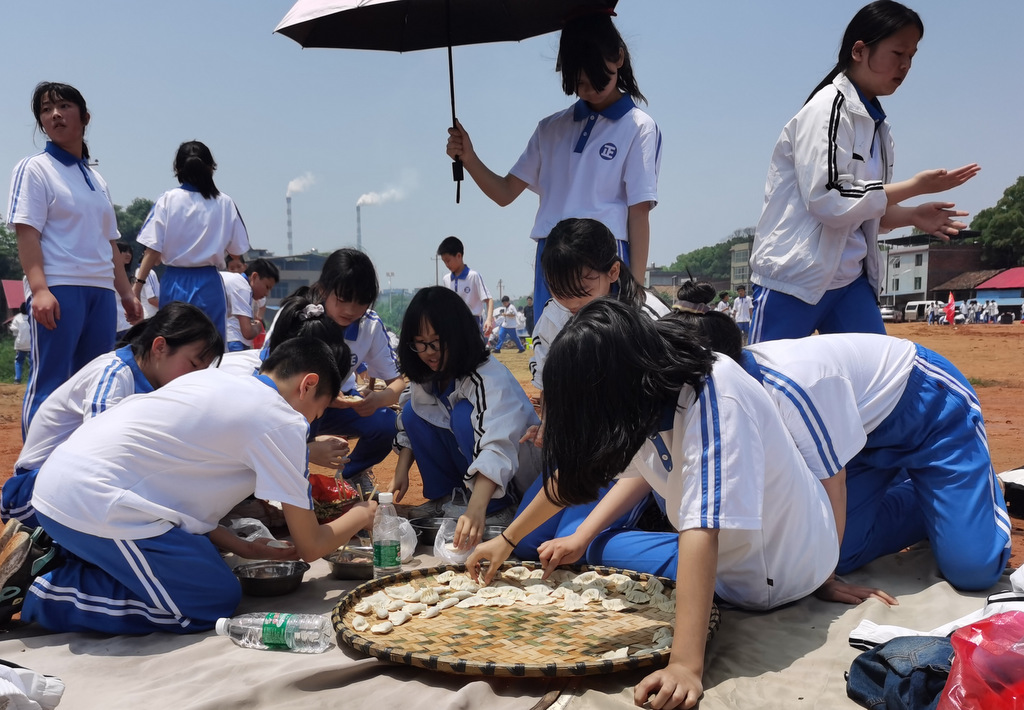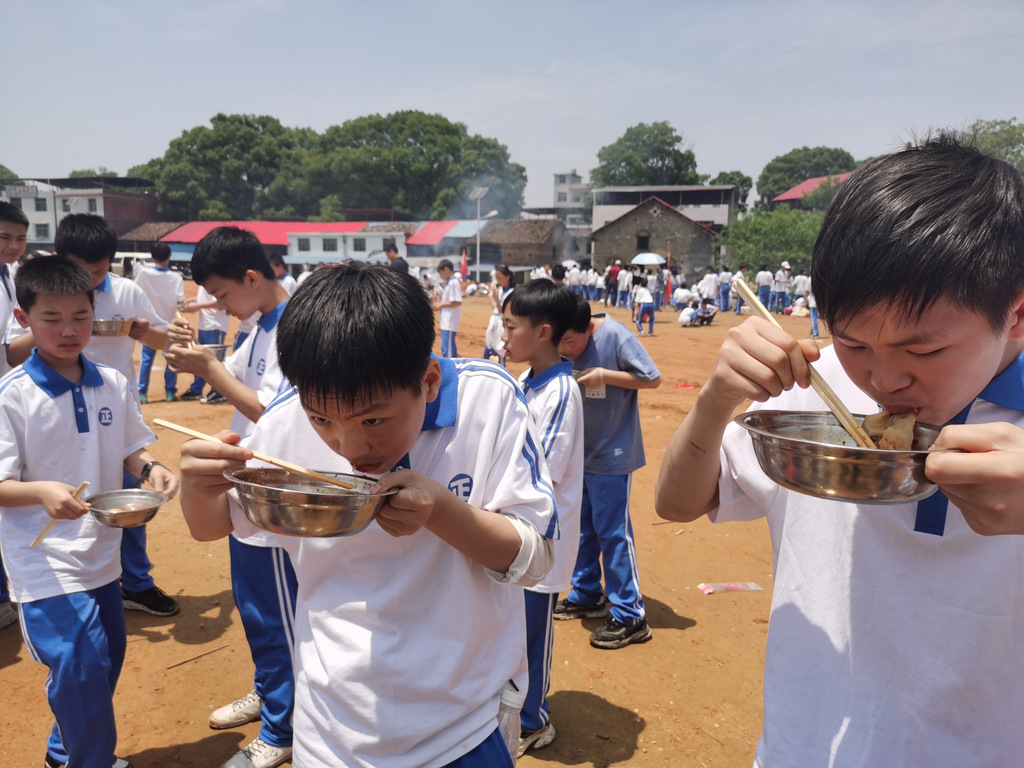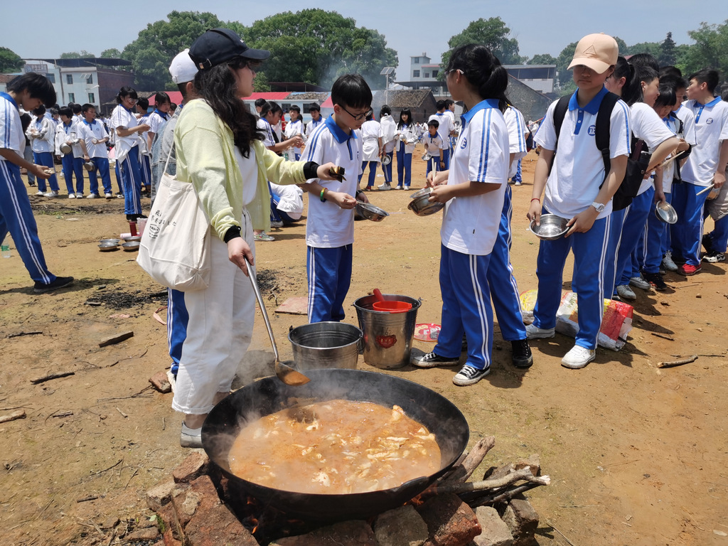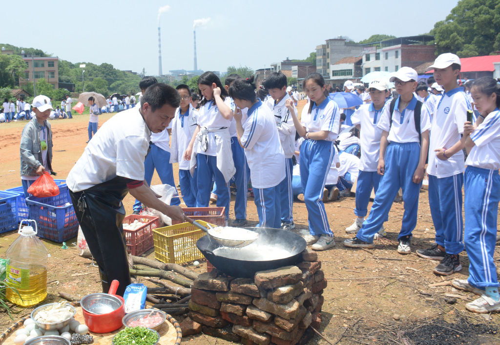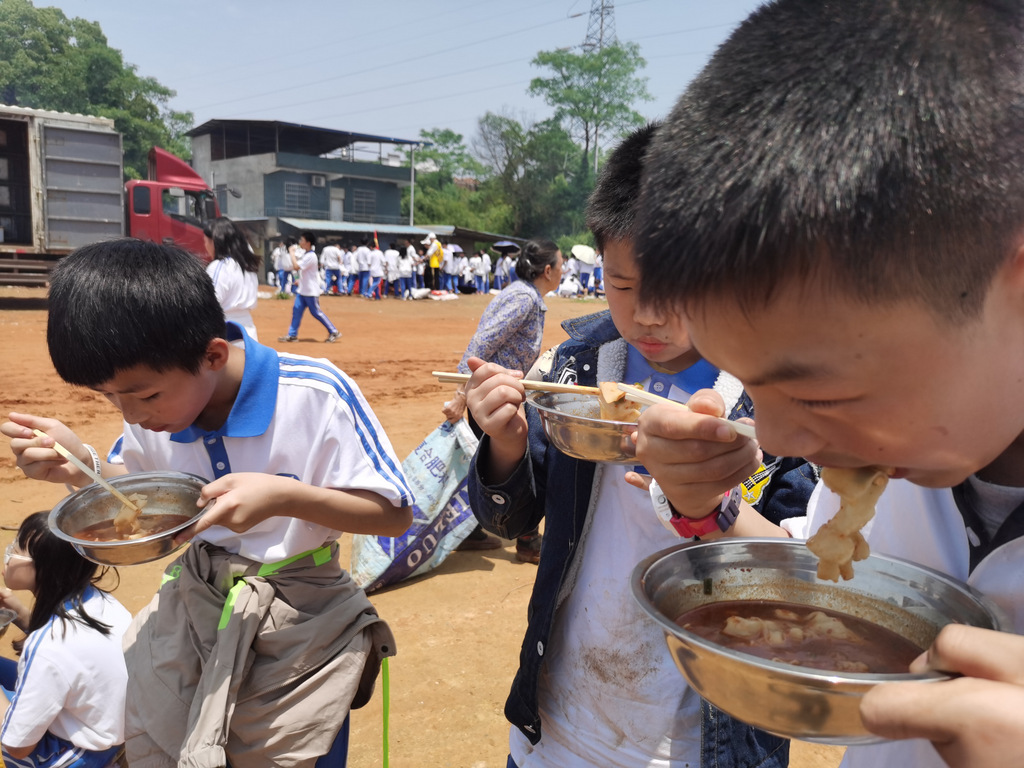 22个班级散落在营地四周,大家兴高采烈地忙碌起来。男生搬砖、垒灶、打水,女生们刷锅、洗菜、包饺子,班主任生火、烧水、下调料。一阵忙碌过后,炊烟缕缕升起,香味阵阵飘来,饺子、面条纷纷出锅。自己的劳动成果,自然是格外香甜,一边大汗淋漓,一边狼吞虎咽,大快朵颐的同时还不忘互相竖起大拇指:“超级好吃!”