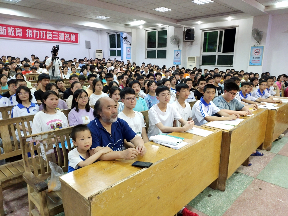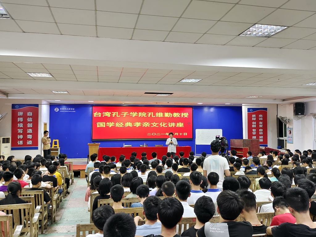 晚读过后,400名准高一学生齐聚学校报告厅,期待一睹孔子后裔的风采,翘首以盼孔教授的国学讲座。8:30,孔教授翩然而至,笑容和蔼,与同学们亲切致意。热烈的掌声中,罗校长给同学们介绍起孔教授与正源的渊源,介绍孔教授对正源“风水宝地”的评价以及对同学们的期许,勉励同学们爱国爱家,努力学习回报亲恩,踏实行动践行孝道。