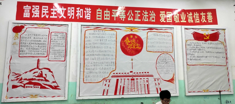 5月18日~25日,手抄报作品陆续成品,黑板报作品大功告成。各年级德育主任和美术老师加班加点连夜评选优秀作品;各年级对获奖同学和班级进行颁奖表彰;获奖作品拍成图片,发到年级群和家长群传阅分享。