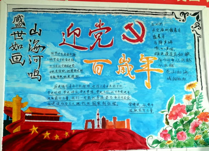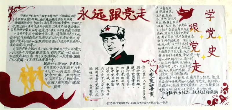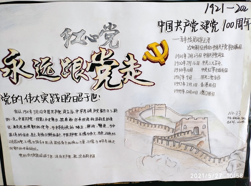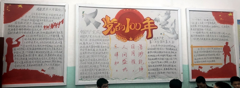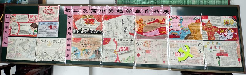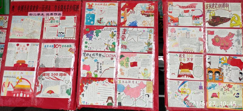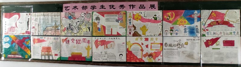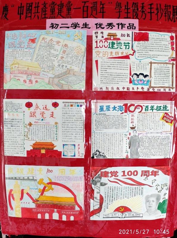 初中部、艺术部和高中美术兴趣同学们 5月6日即开始行动起来,积极参与“庆祝中国共产党建党100周年”手抄报巡展活动:探讨主题,查找资料,乐在其中;框排版面,描画插图,一丝不苟;勾勒线条,渲染色彩,精益求精……