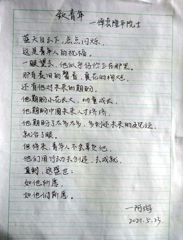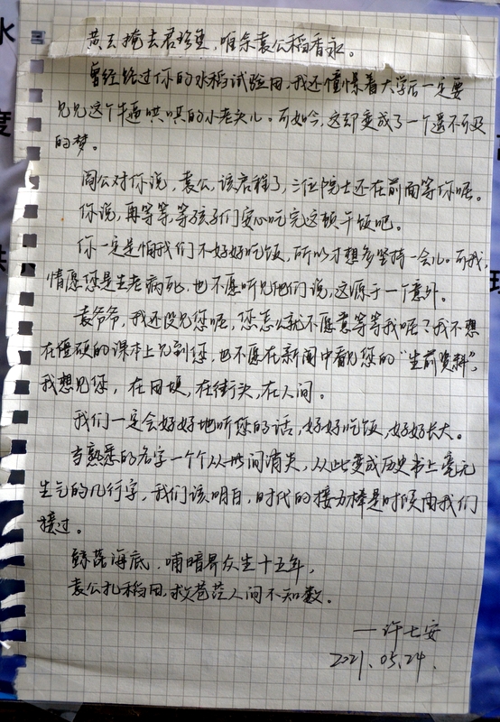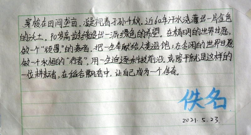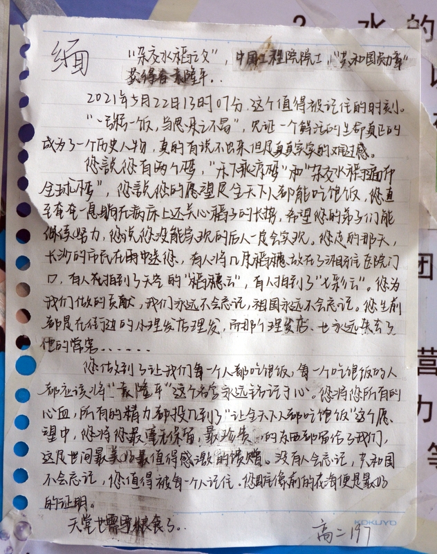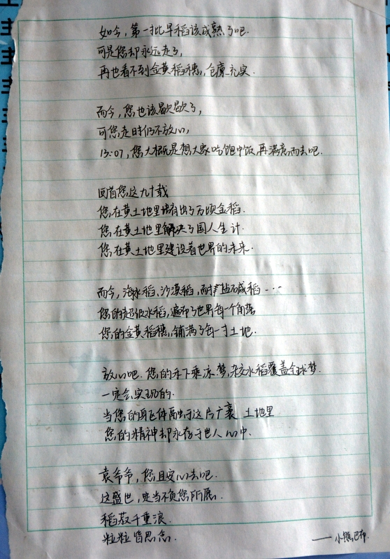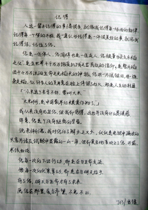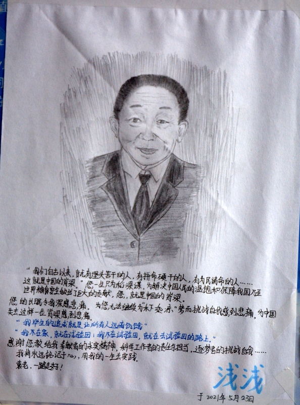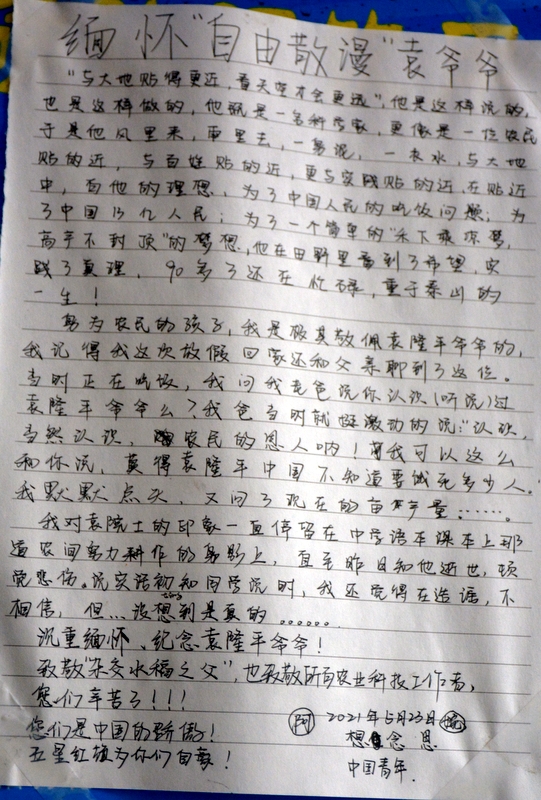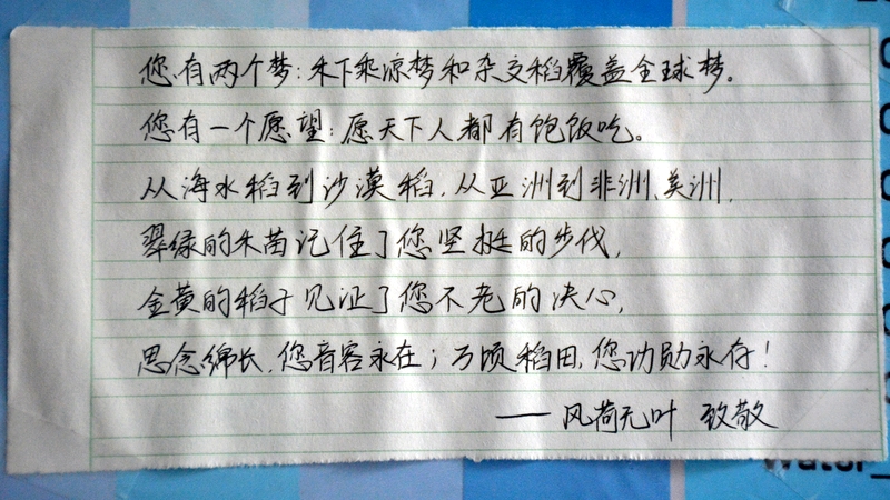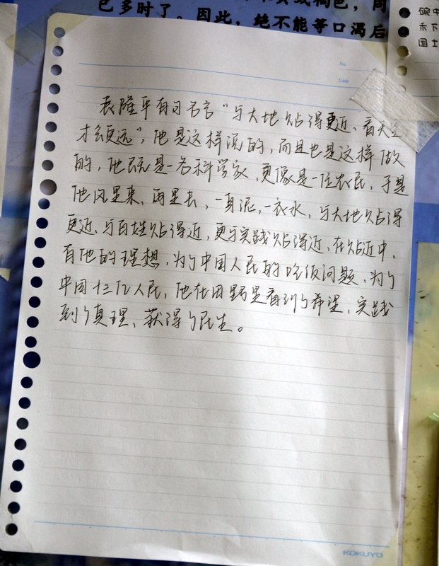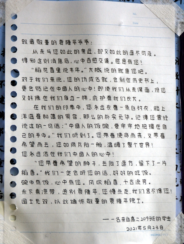 “国士已逝,稻禾犹存。”这些大大小小的纸片,亦如袁老的一生,质朴而又赤诚。同学们亦将继承袁老遗志,为国为民,鞠躬尽瘁,不负青春,勤学奋进。
