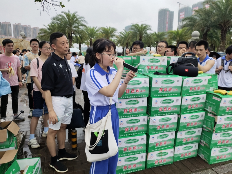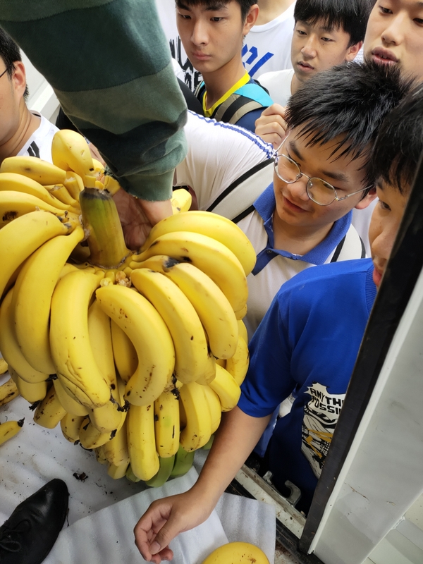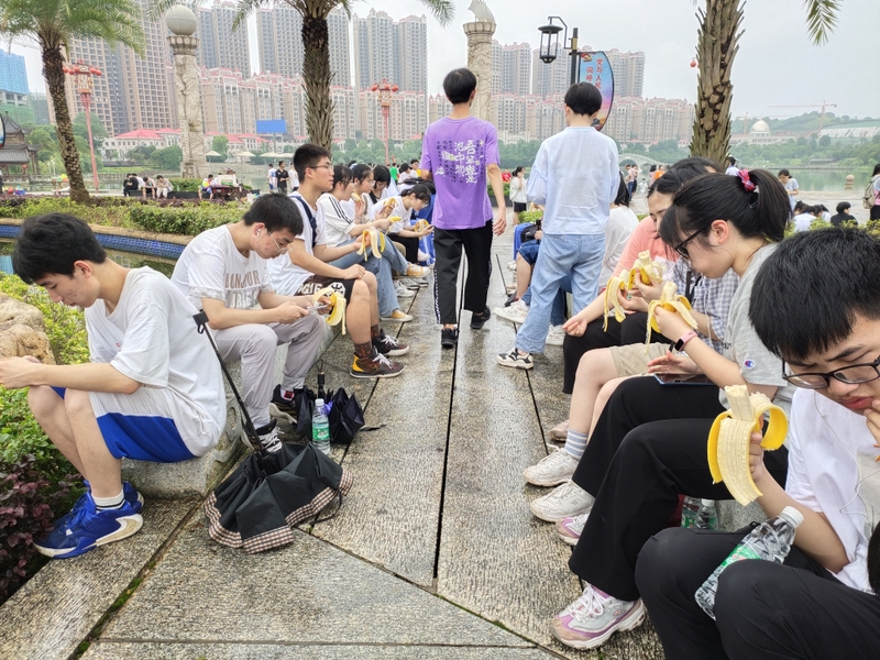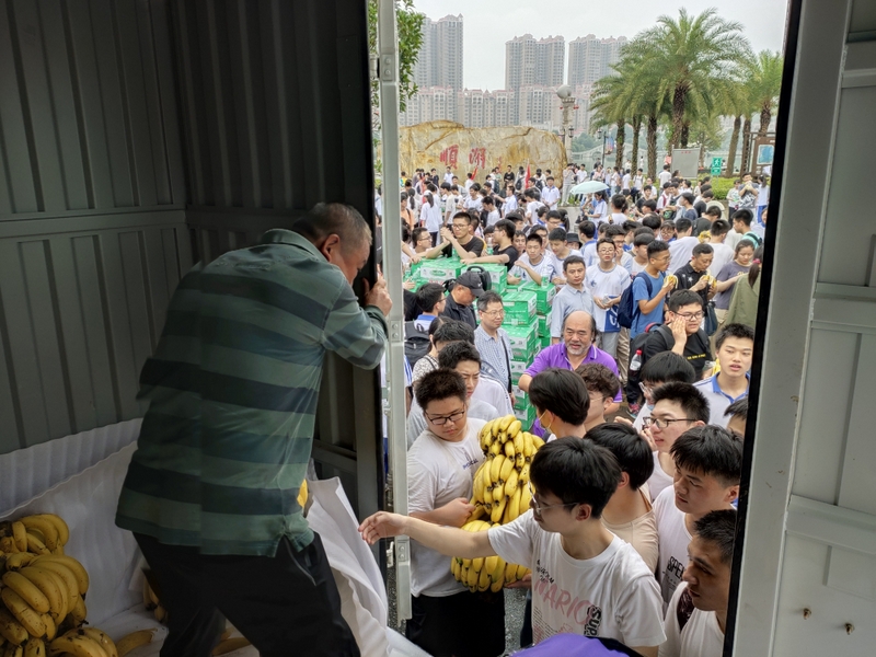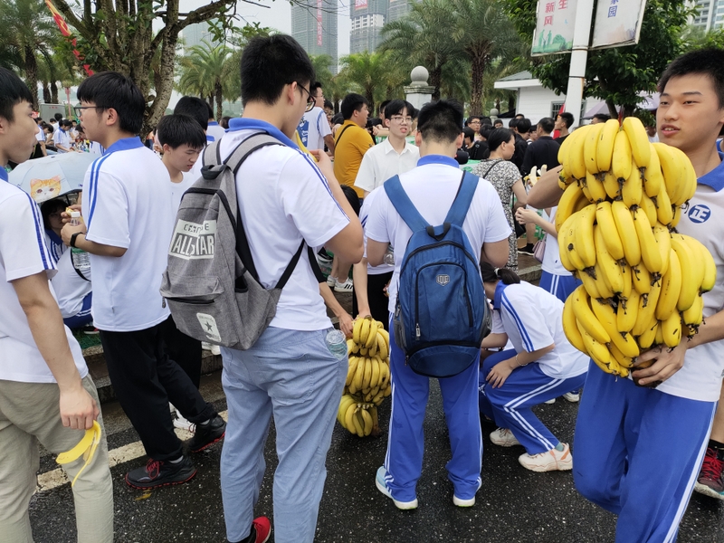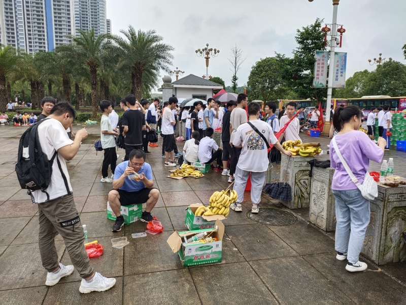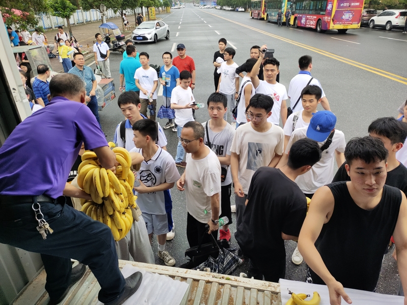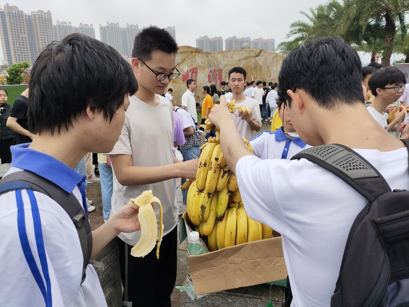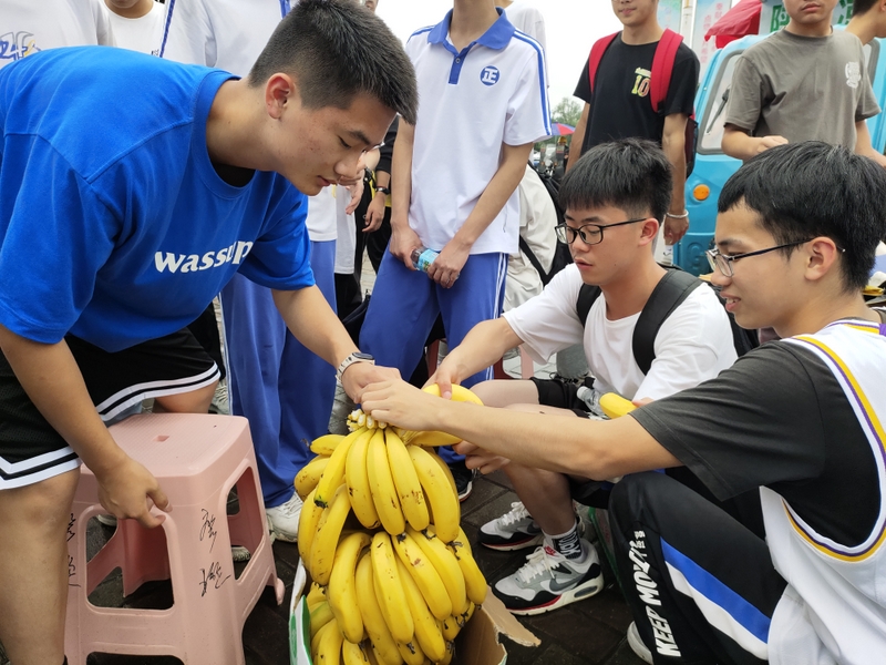 雨后的天空逐渐清朗,后勤车陆续抵达。300箱矿泉水卸完,水果车紧随而至,黄灿灿的香蕉堆满车厢,每班一树香蕉串,领回去自己摘,管够。一车香蕉逐渐见底,还有两个班级没来搬取,水堆旁搭台唱歌的老师就着喇叭现场吆喝:卖香蕉,不要钱,免费的香蕉香又甜!