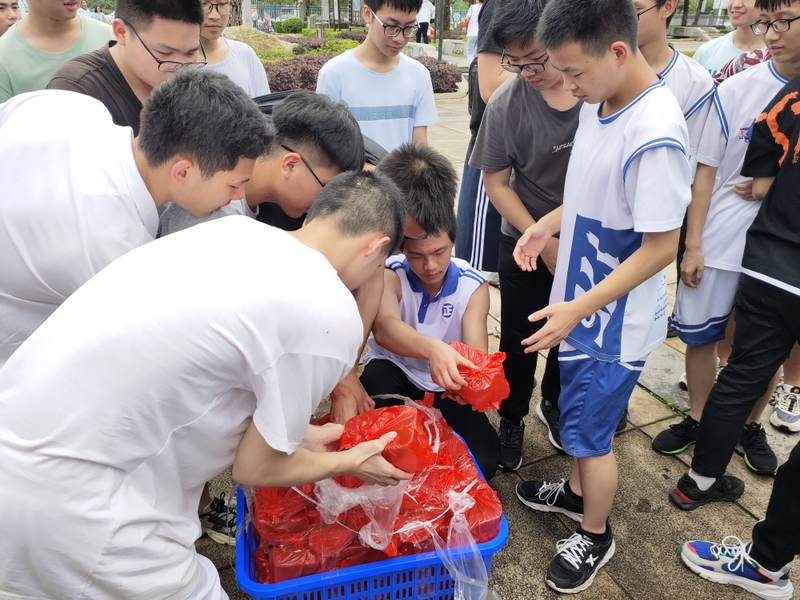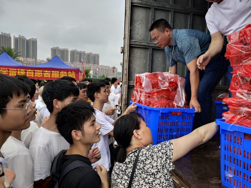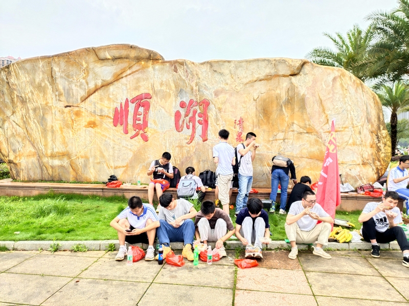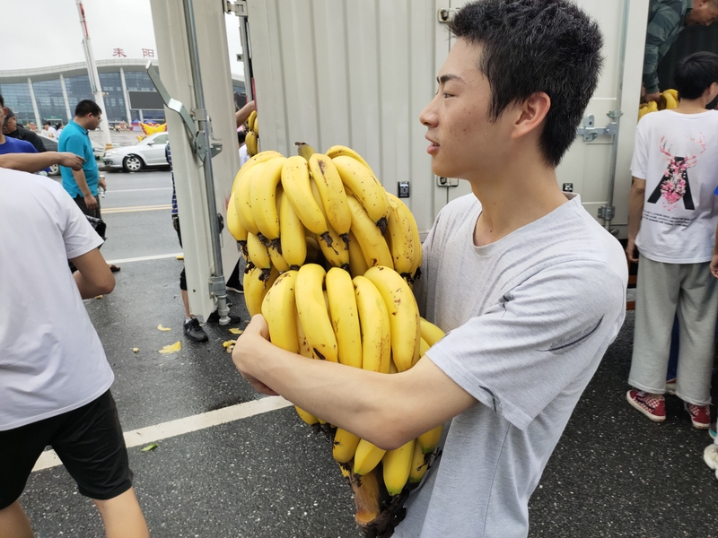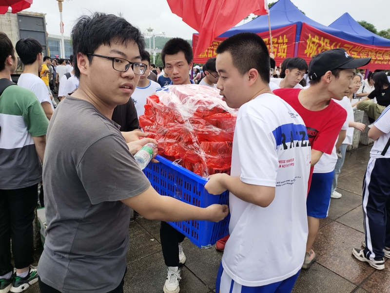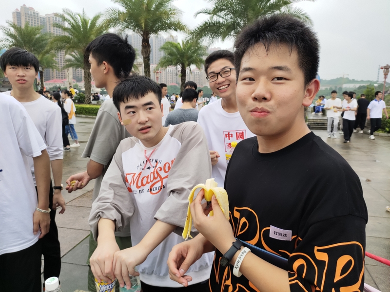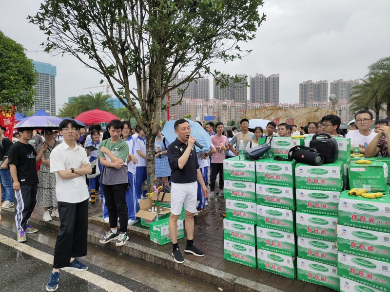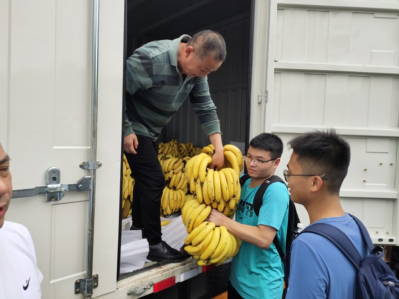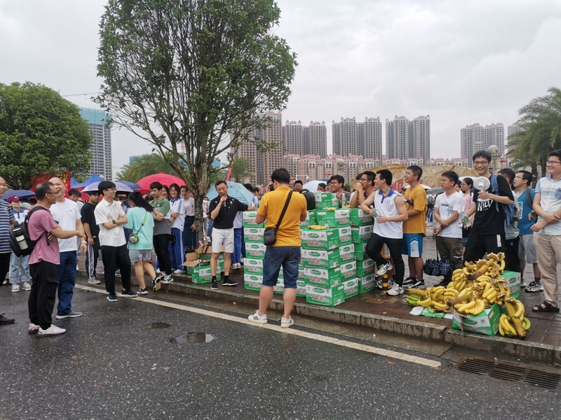 雨后的天空逐渐清朗,后勤车陆续抵达。300箱矿泉水卸完,水果车紧随而至,黄灿灿的香蕉堆满车厢,每班一树香蕉串,领回去自己摘,管够。一车香蕉逐渐见底,还有两个班级没来搬取,水堆旁搭台唱歌的老师就着喇叭现场吆喝:卖香蕉,不要钱,免费的香蕉香又甜!