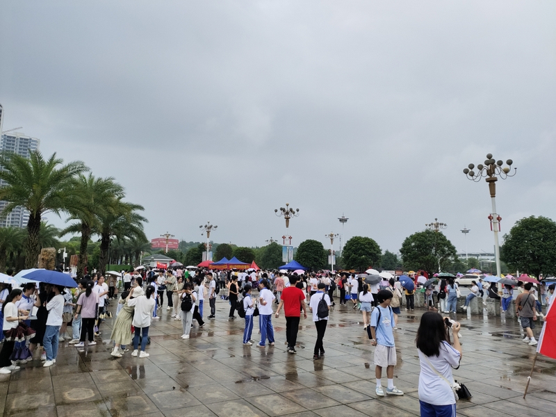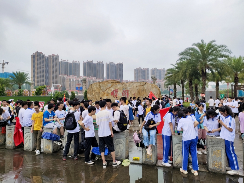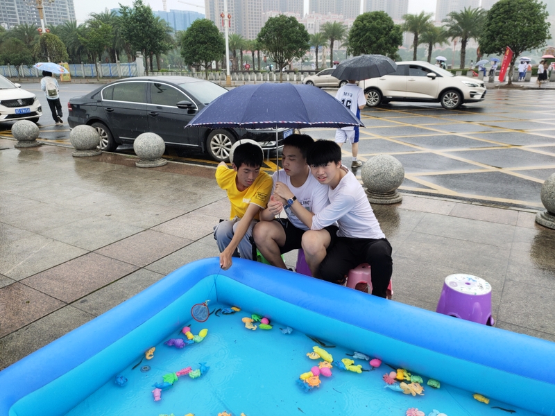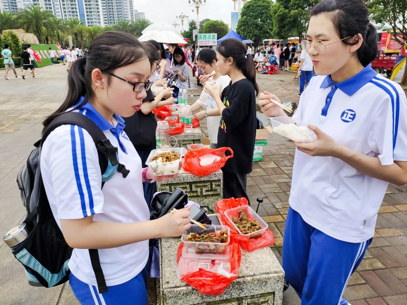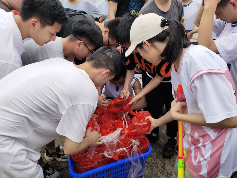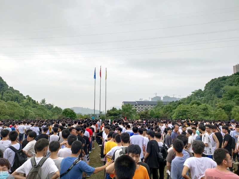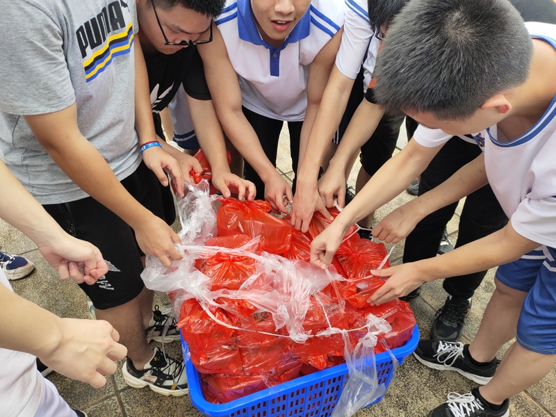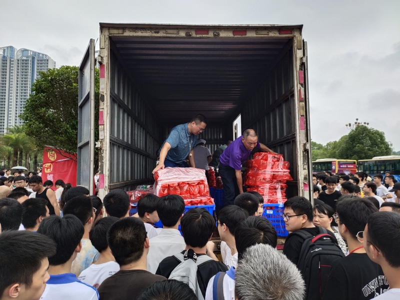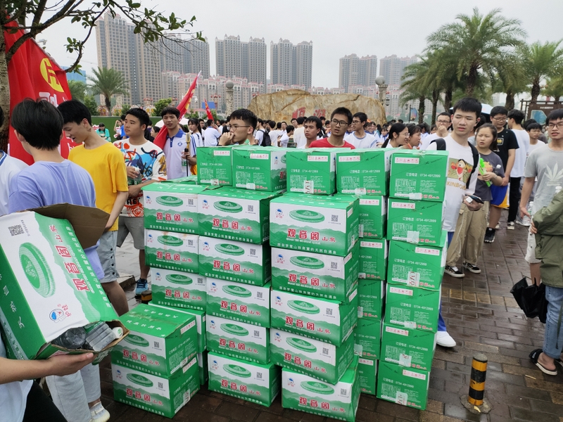 雨后的天空逐渐清朗,后勤车陆续抵达。300箱矿泉水卸完,水果车紧随而至,黄灿灿的香蕉堆满车厢,每班一树香蕉串,领回去自己摘,管够。一车香蕉逐渐见底,还有两个班级没来搬取,水堆旁搭台唱歌的老师就着喇叭现场吆喝:卖香蕉,不要钱,免费的香蕉香又甜!