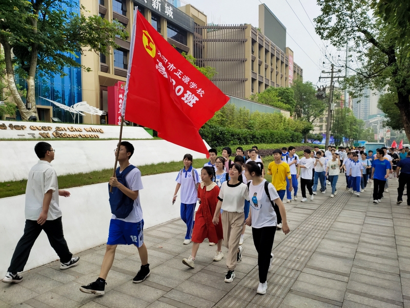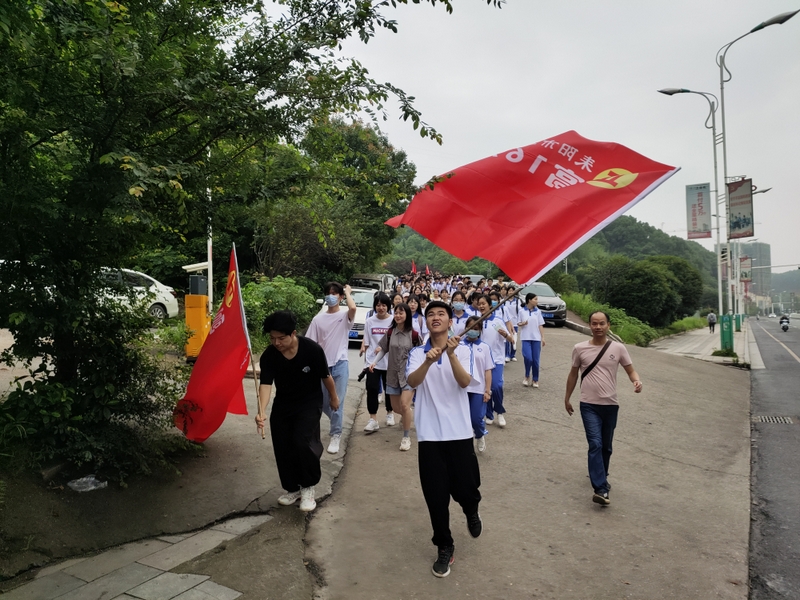 高三学子在罗校长的带领下,高举着校旗与班旗,健步如飞,前往顺湖公园。