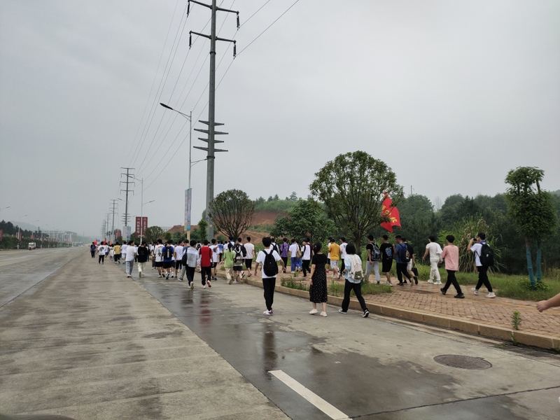 转瞬之间已到聚龙湾,跃下大巴,聚拢队伍继续步行二公里。顺湖在望,阵雨袭来,“竹杖芒鞋轻胜马,一蓑烟雨任平生”,同学们打伞前行,风雨无阻。