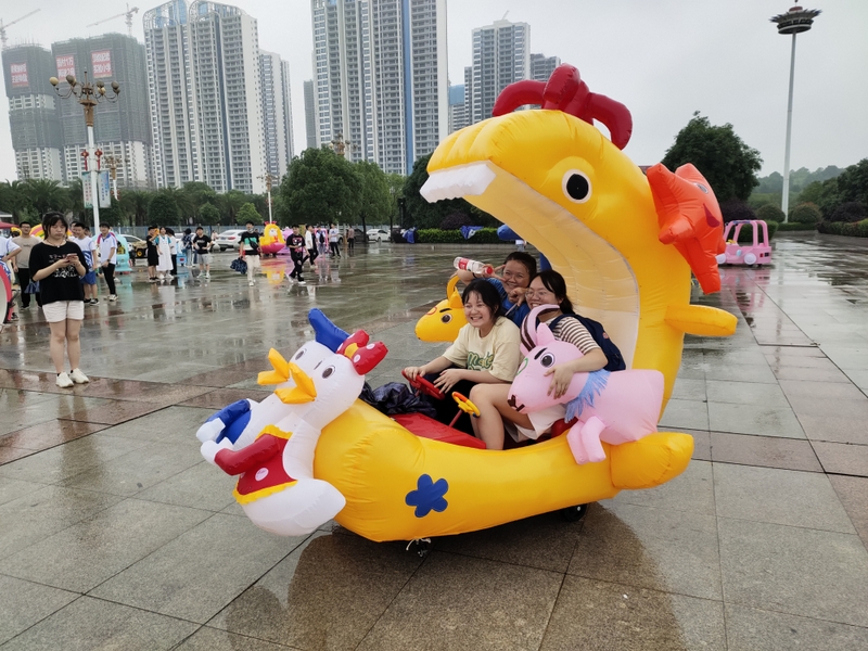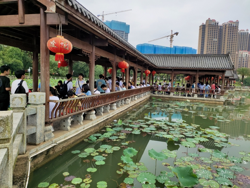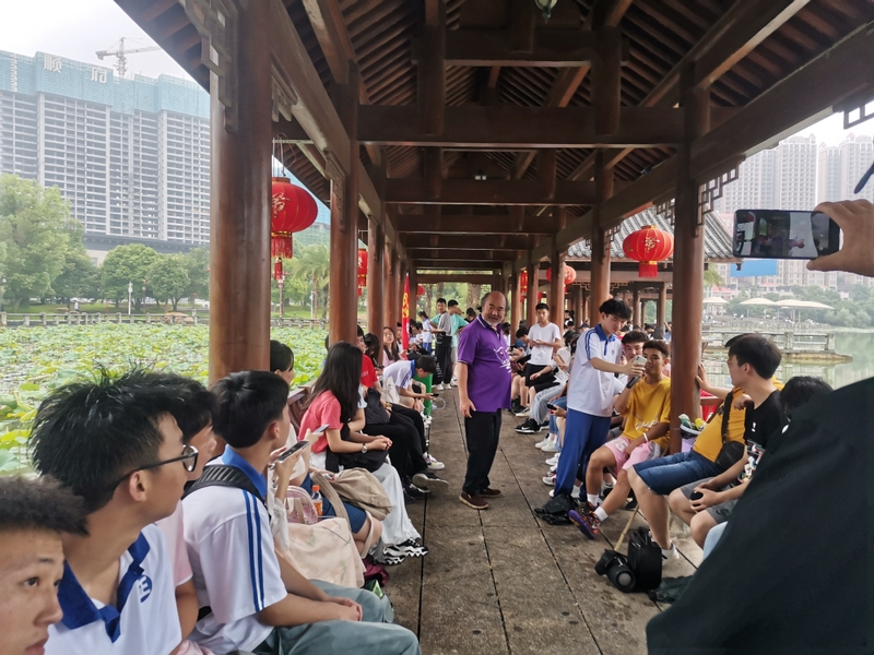 雨来了,聚到回廊凉亭里放声欢唱,不减好心情。雨停了,抓紧时机登上“状元桥”打卡合影,博取好彩头。