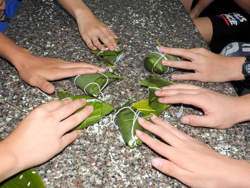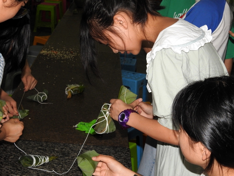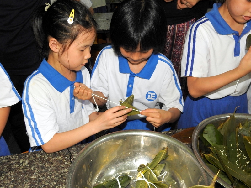 上午,各年级分单双班依次到食堂上课——手工课包粽子。