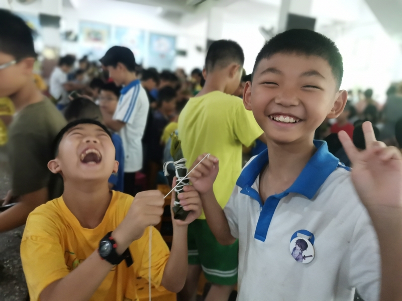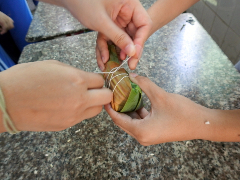 要么功亏一篑,眼瞅着丝线捆了一圈又一圈,还边绕圈边念叨“一二三四…”只差没给粽子捆上一件丝线衫了,一松手……漏!MGD!“二二三四,再来一次……”一阵阵欢声笑语充斥在食堂各个角落。