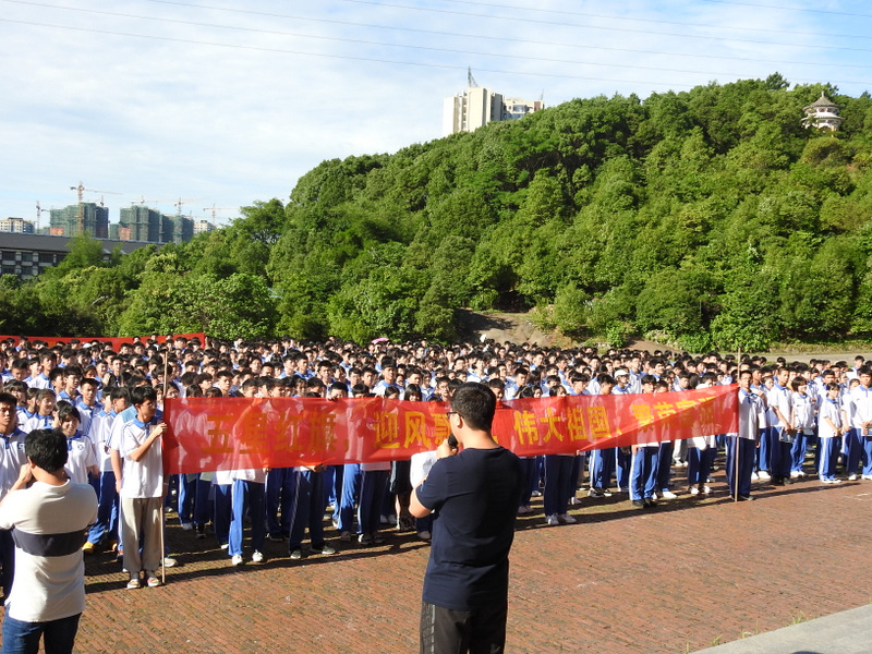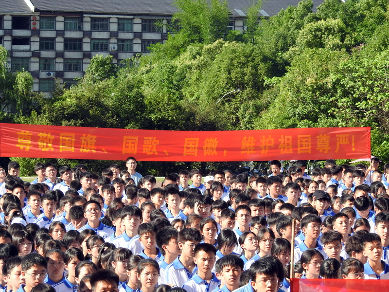 “向伟大祖国敬礼,向五星红旗敬礼”、“五星红旗迎风飘扬,伟大祖国繁荣富强”、“尊敬国旗、国歌、国徽,维护祖国尊严”、“立报国之志,增建国之才,践爱国之行”四条鲜艳的横幅在学生方阵两端飘扬。