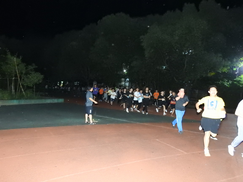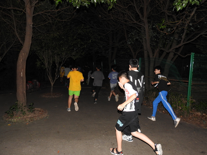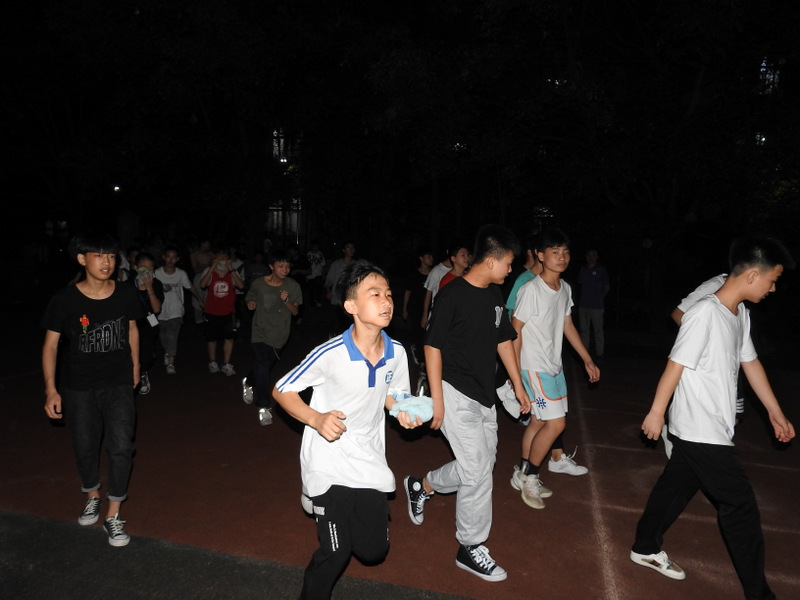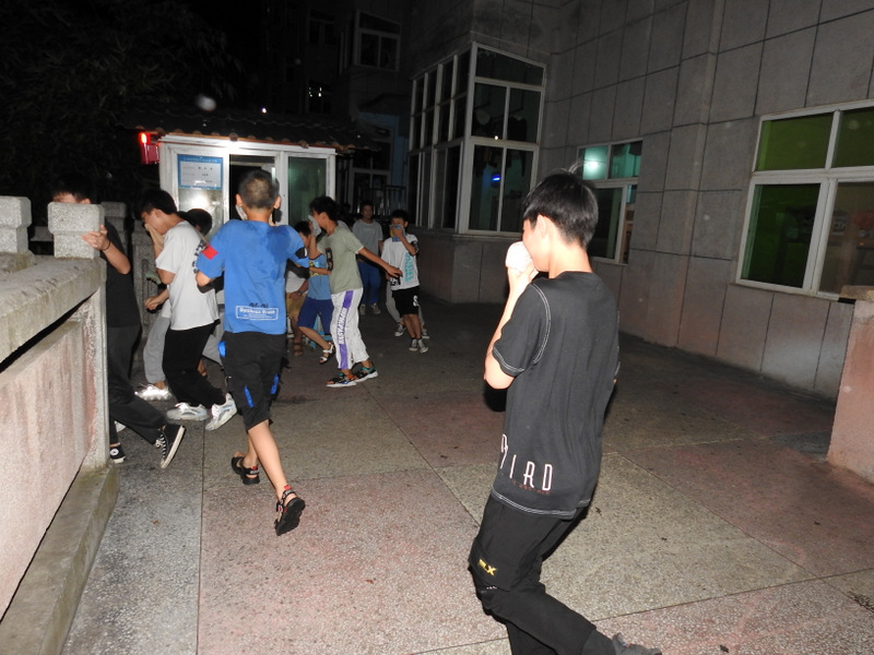 第二场演练睡后场景,学生躺在各自床位,宿舍熄灯。警铃一响,寝室长及班干部第一时间冲到门口,打开备用手电筒照明,组织大家以寝室为单位在黑夜中安全有序撤离。从警报响起,到全员抵达小学部运动场指定位置,耗时4分 20秒。