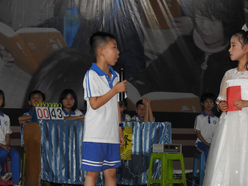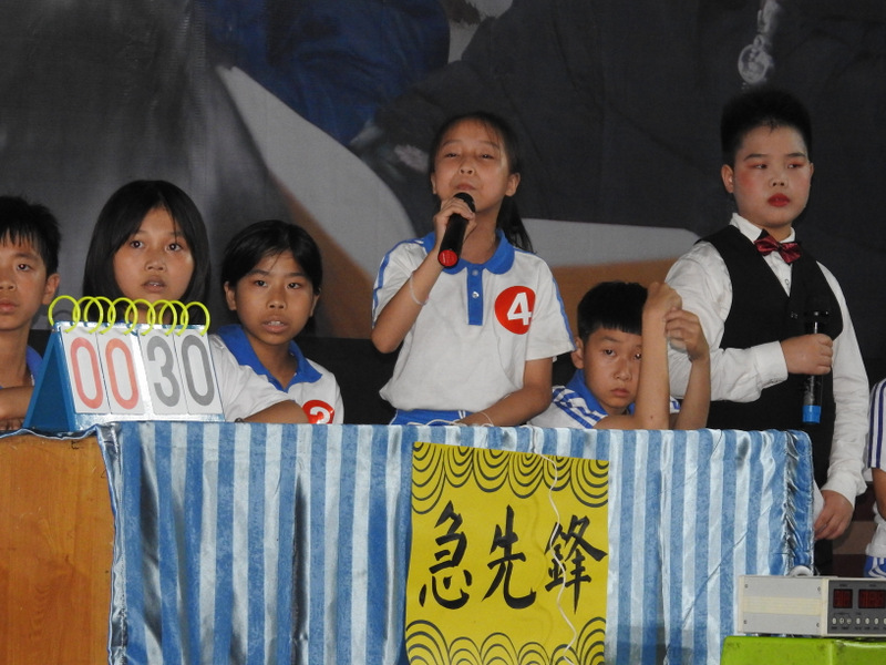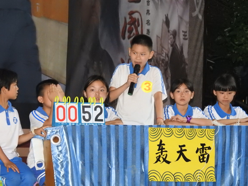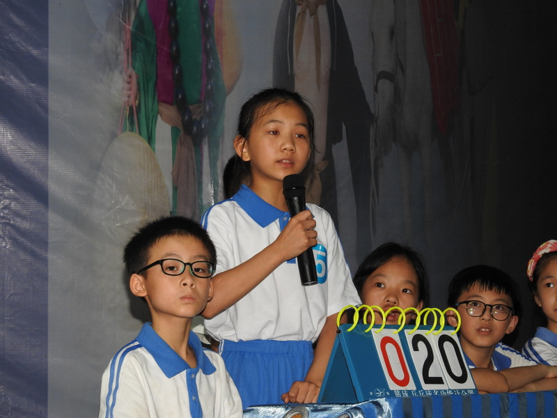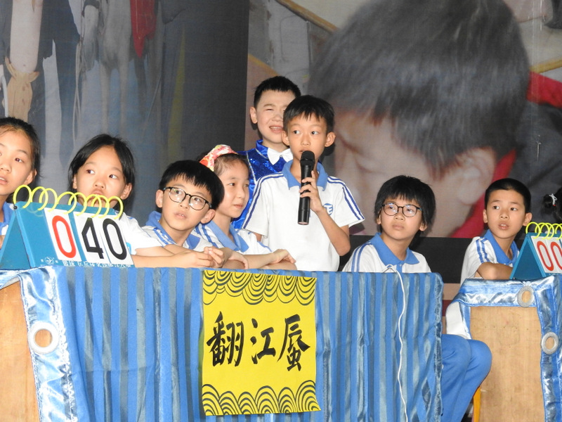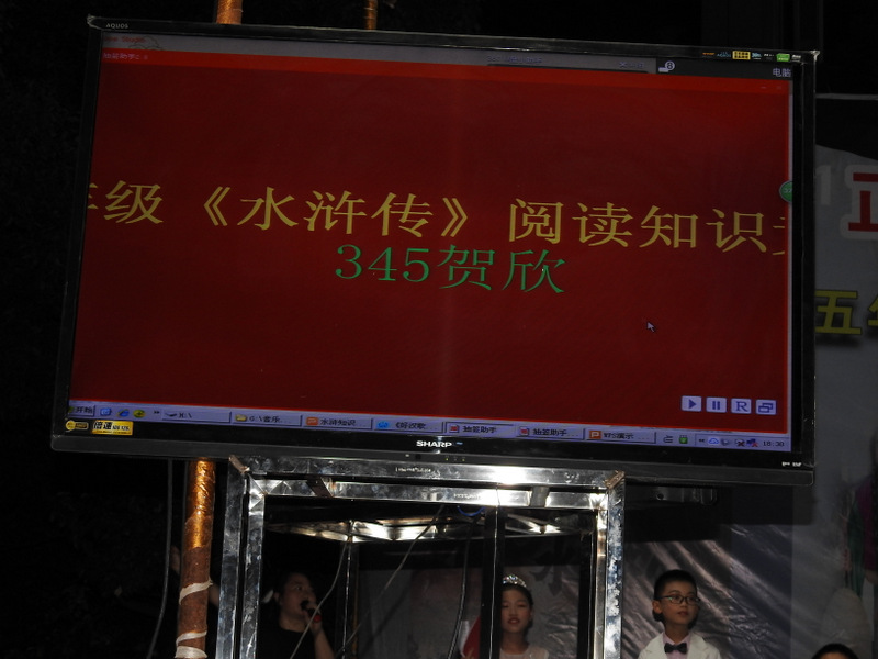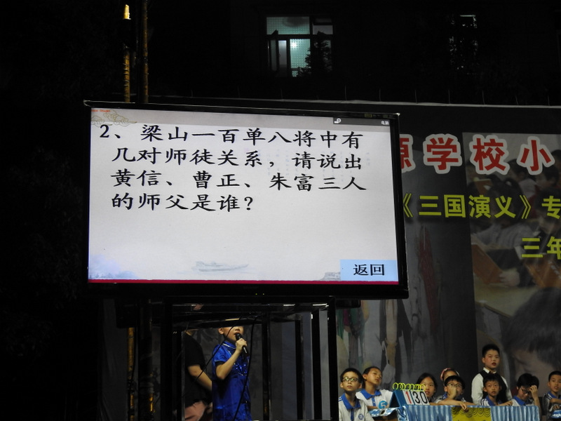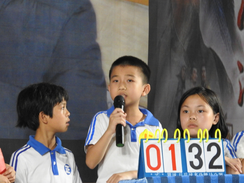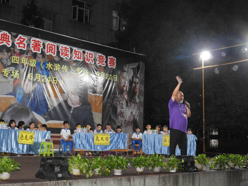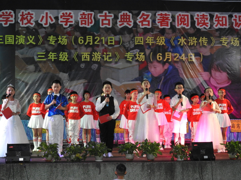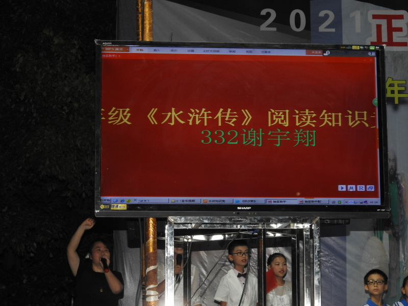 首先由主持人宣布开场并公布竞赛规则。竞赛共分为必答题、朗读题、抢答题、风险题四大部分。题目都是与《水浒传》知识相关。第一环节进行的是必答题。比赛开始,气氛一下子紧张起来,第一支队伍开始答题,接着按事先安排好的顺序依次答题……紧接着是第二个环节朗读题,孩子们清脆、充满感情的声音深深打动了在场的每一位观众。比赛间隙,《好汉歌》的前奏一响起,孩子们便兴奋地跟着节拍唱起来,罗校长也拿过话筒,跟孩子们一起演唱这首脍炙人口的歌曲。场面热闹极了,堪比一流歌星的演唱会,孩子们跟校长亲密无间,十分和谐。欢呼声、欢笑声久久在校园上空回荡。