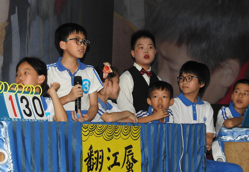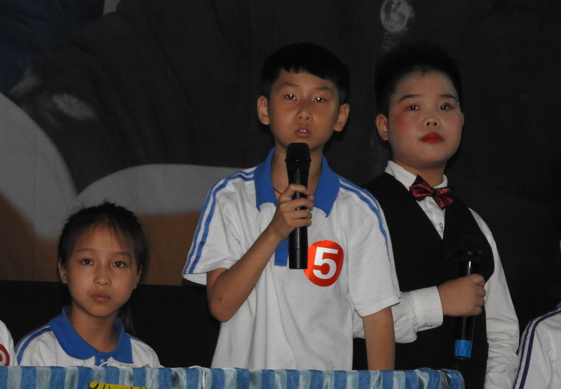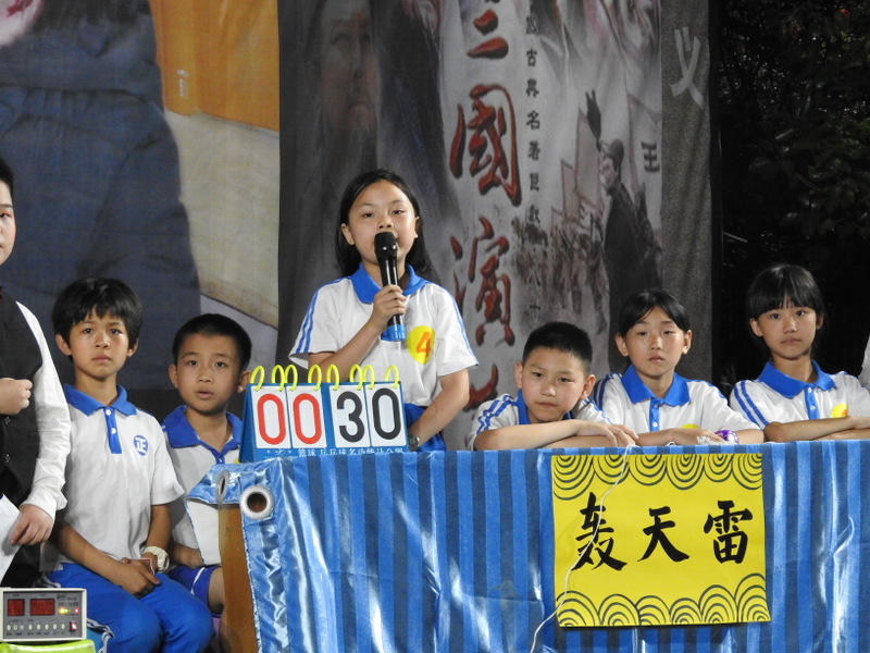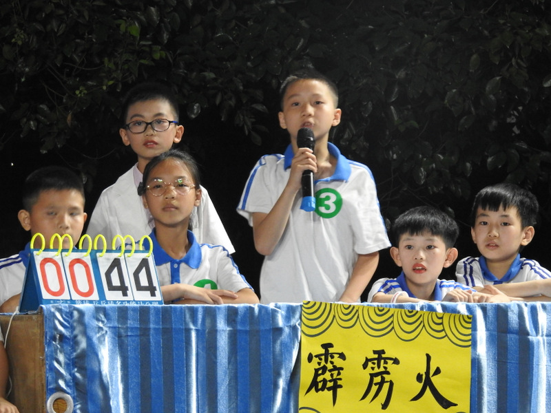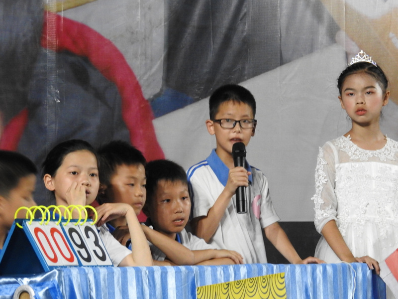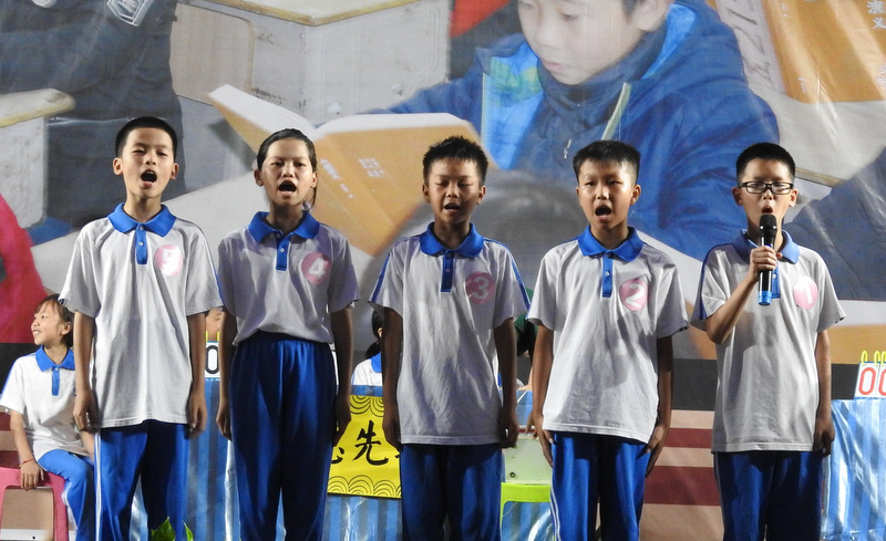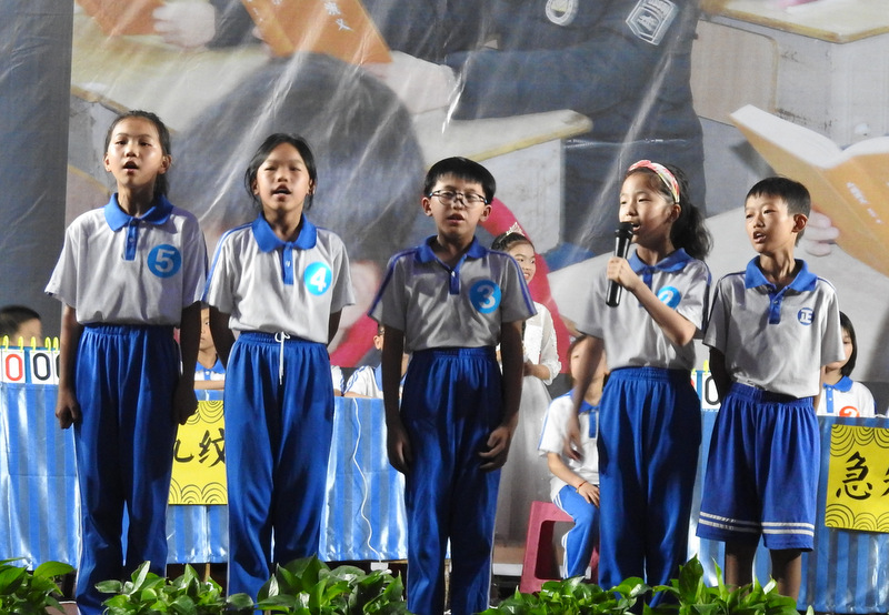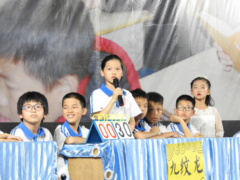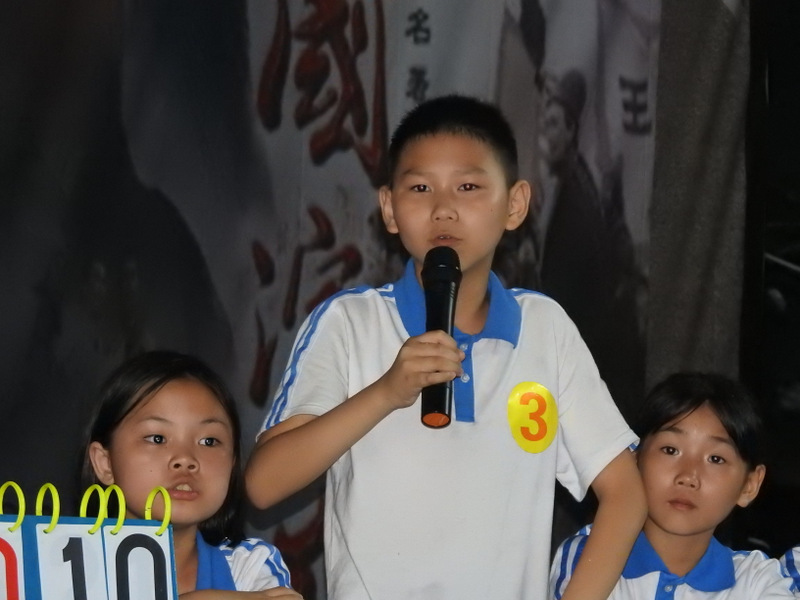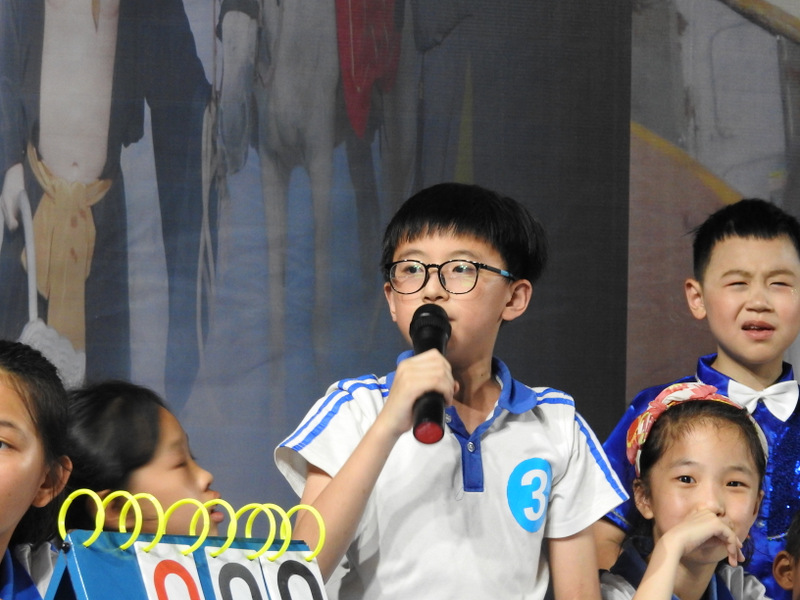 首先由主持人宣布开场并公布竞赛规则。竞赛共分为必答题、朗读题、抢答题、风险题四大部分。题目都是与《水浒传》知识相关。第一环节进行的是必答题。比赛开始,气氛一下子紧张起来,第一支队伍开始答题,接着按事先安排好的顺序依次答题……紧接着是第二个环节朗读题,孩子们清脆、充满感情的声音深深打动了在场的每一位观众。比赛间隙,《好汉歌》的前奏一响起,孩子们便兴奋地跟着节拍唱起来,罗校长也拿过话筒,跟孩子们一起演唱这首脍炙人口的歌曲。场面热闹极了,堪比一流歌星的演唱会,孩子们跟校长亲密无间,十分和谐。欢呼声、欢笑声久久在校园上空回荡。