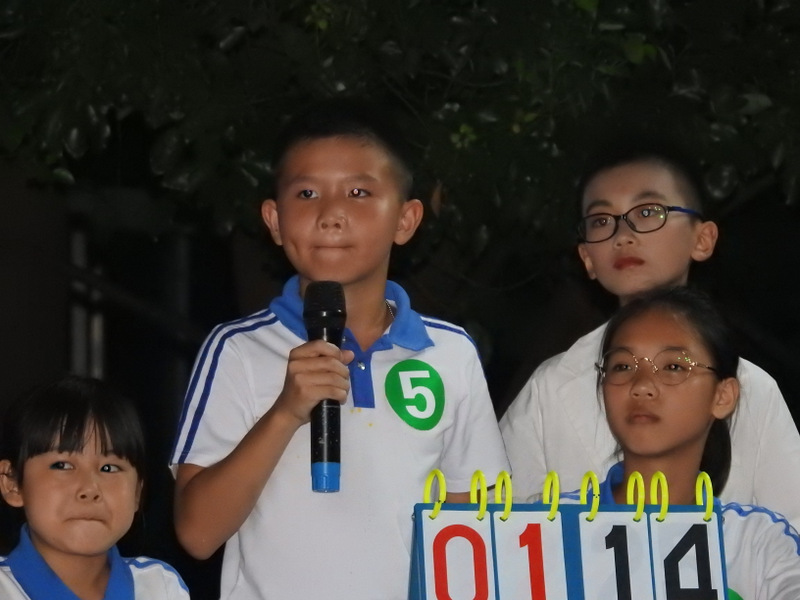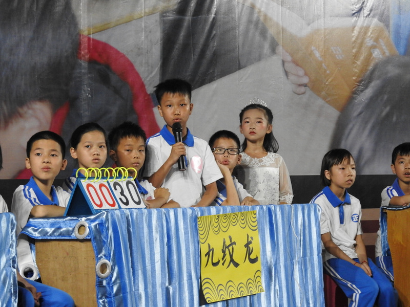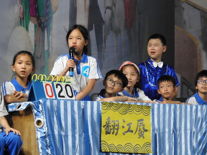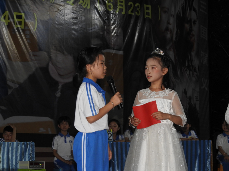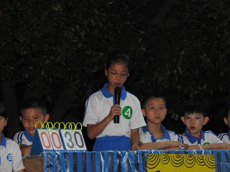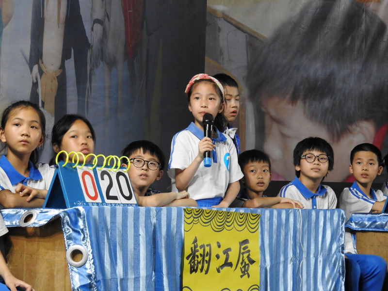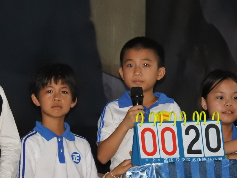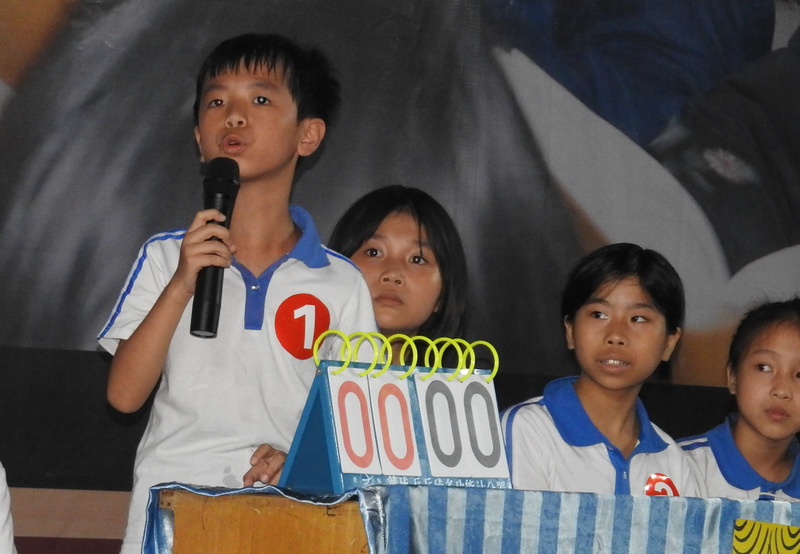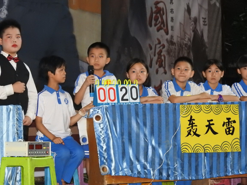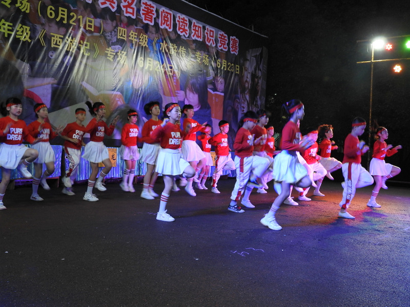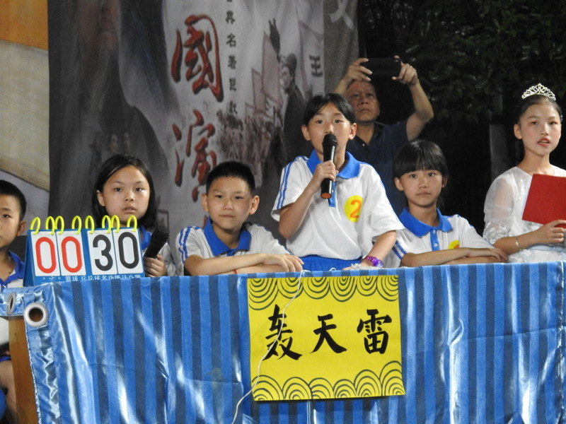 首先由主持人宣布开场并公布竞赛规则。竞赛共分为必答题、朗读题、抢答题、风险题四大部分。题目都是与《水浒传》知识相关。第一环节进行的是必答题。比赛开始,气氛一下子紧张起来,第一支队伍开始答题,接着按事先安排好的顺序依次答题……紧接着是第二个环节朗读题,孩子们清脆、充满感情的声音深深打动了在场的每一位观众。比赛间隙,《好汉歌》的前奏一响起,孩子们便兴奋地跟着节拍唱起来,罗校长也拿过话筒,跟孩子们一起演唱这首脍炙人口的歌曲。场面热闹极了,堪比一流歌星的演唱会,孩子们跟校长亲密无间,十分和谐。欢呼声、欢笑声久久在校园上空回荡。