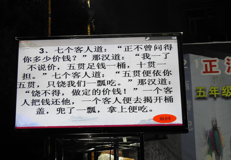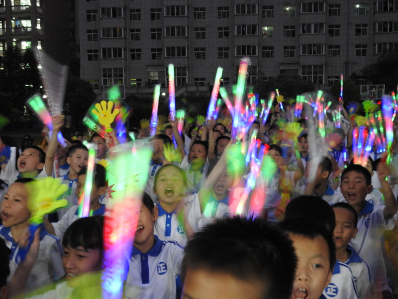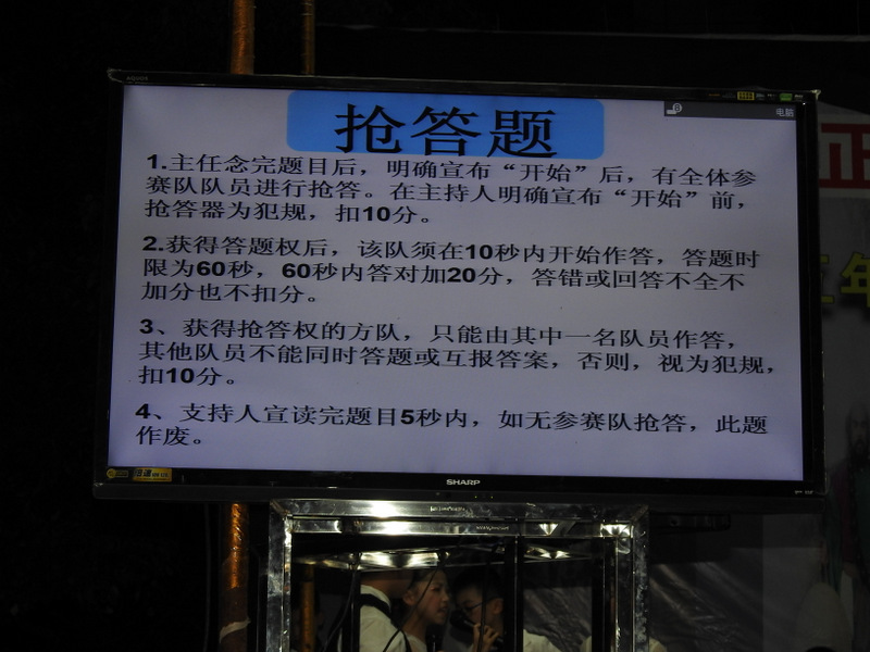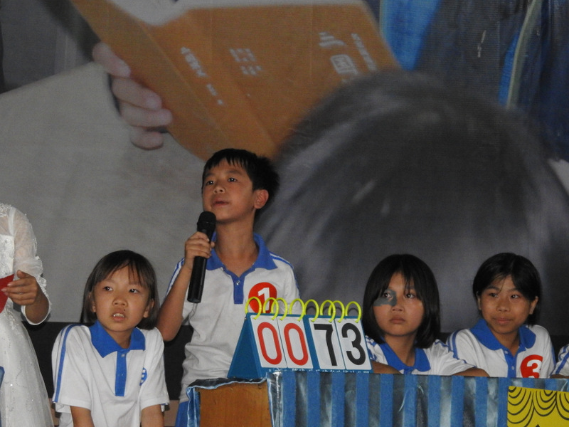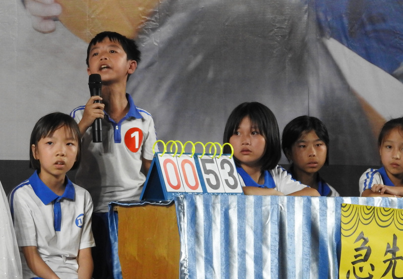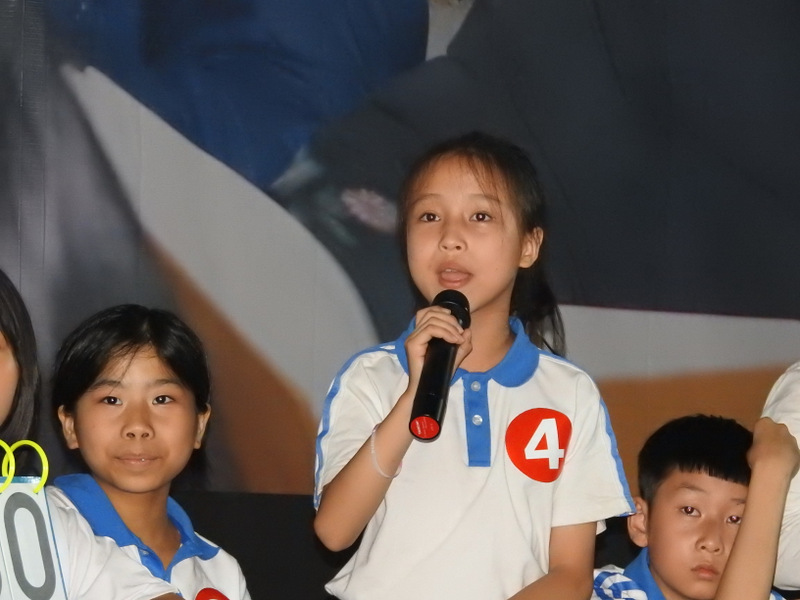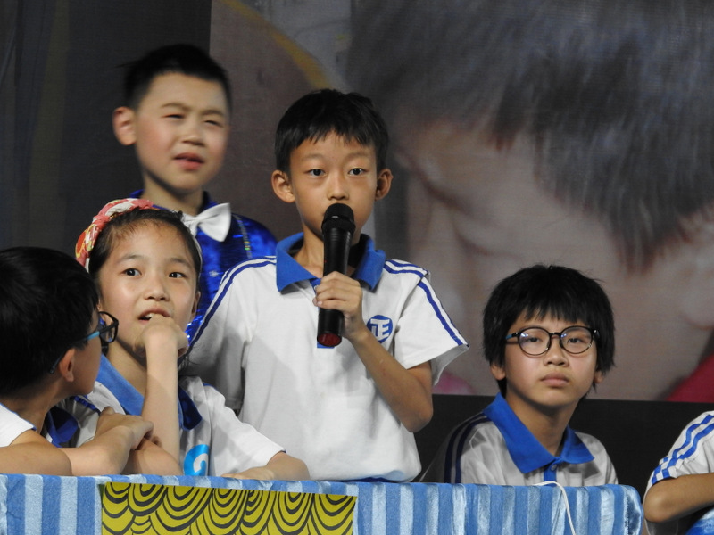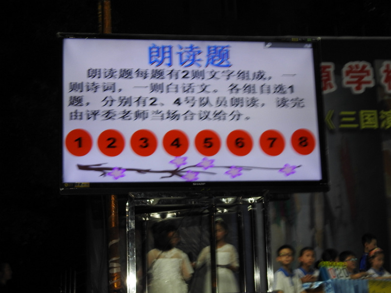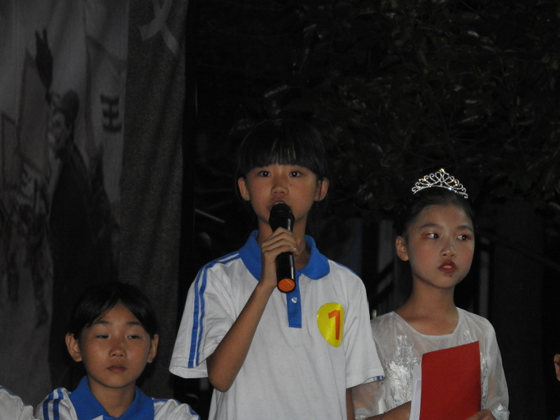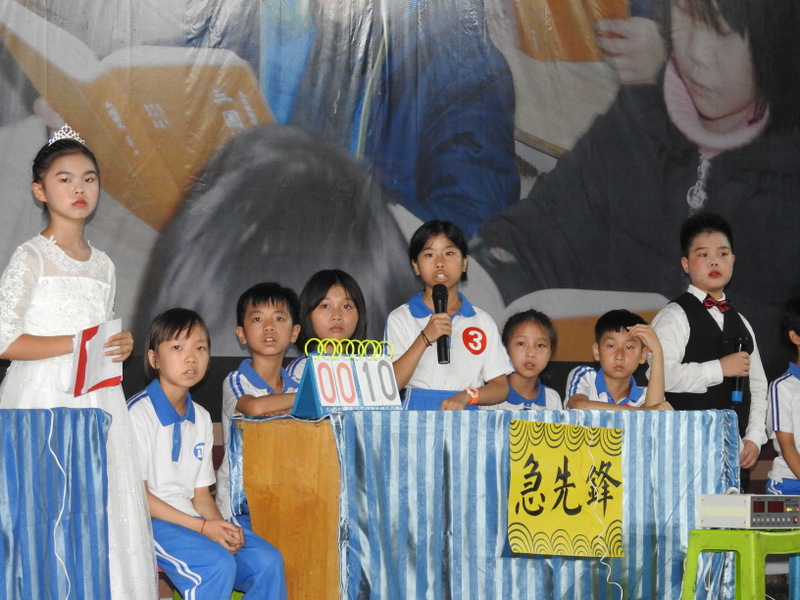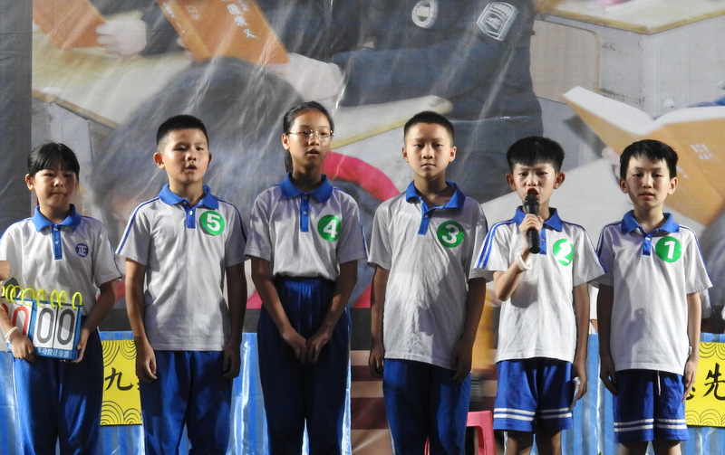 首先由主持人宣布开场并公布竞赛规则。竞赛共分为必答题、朗读题、抢答题、风险题四大部分。题目都是与《水浒传》知识相关。第一环节进行的是必答题。比赛开始,气氛一下子紧张起来,第一支队伍开始答题,接着按事先安排好的顺序依次答题……紧接着是第二个环节朗读题,孩子们清脆、充满感情的声音深深打动了在场的每一位观众。比赛间隙,《好汉歌》的前奏一响起,孩子们便兴奋地跟着节拍唱起来,罗校长也拿过话筒,跟孩子们一起演唱这首脍炙人口的歌曲。场面热闹极了,堪比一流歌星的演唱会,孩子们跟校长亲密无间,十分和谐。欢呼声、欢笑声久久在校园上空回荡。