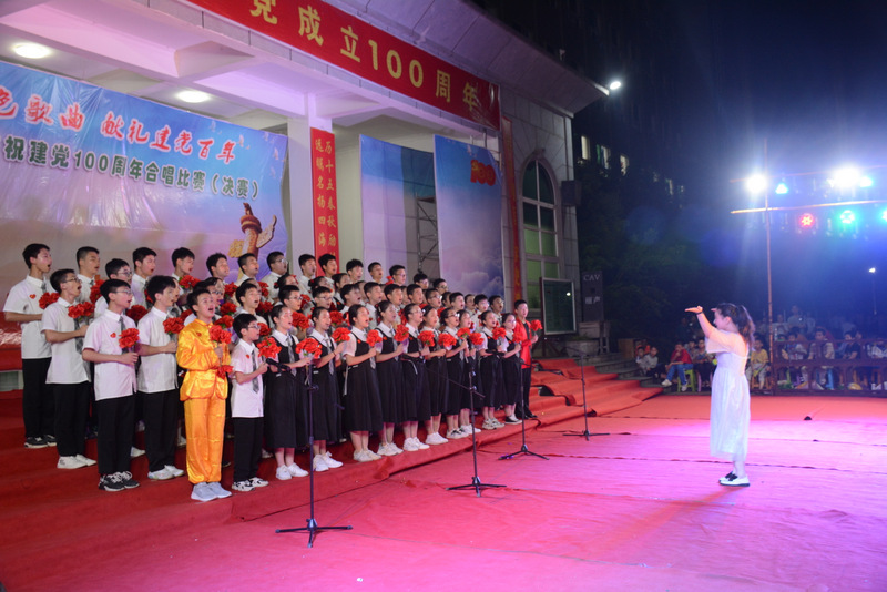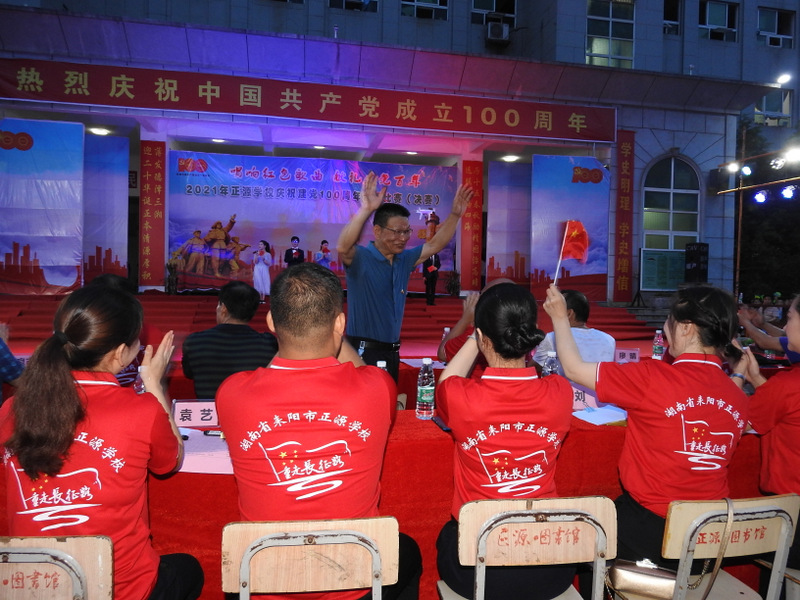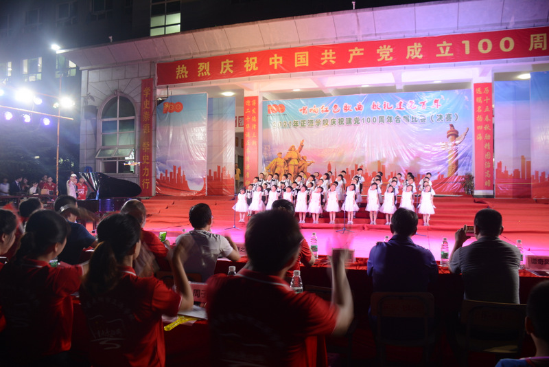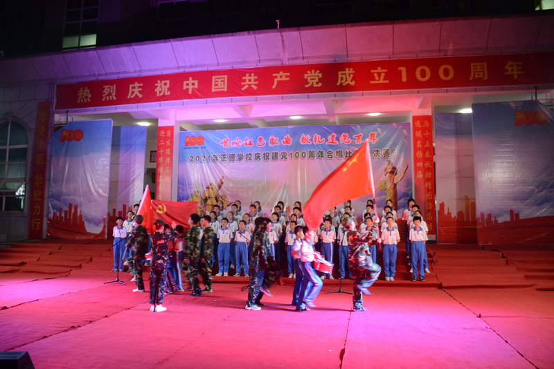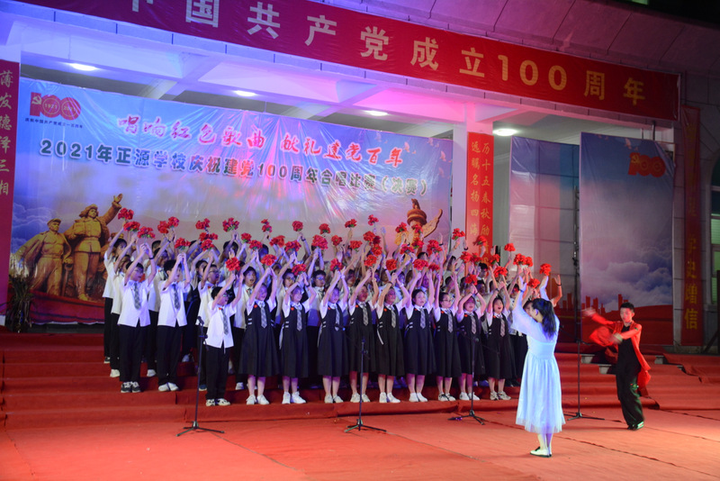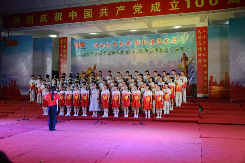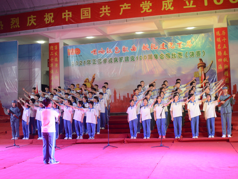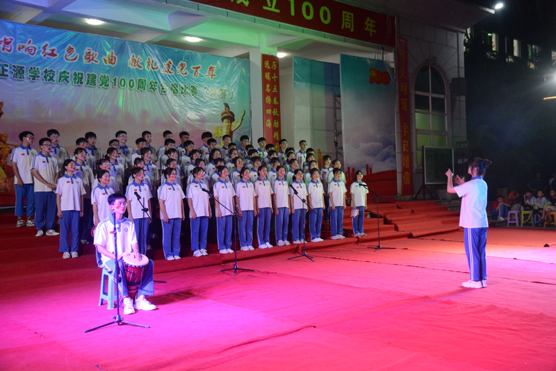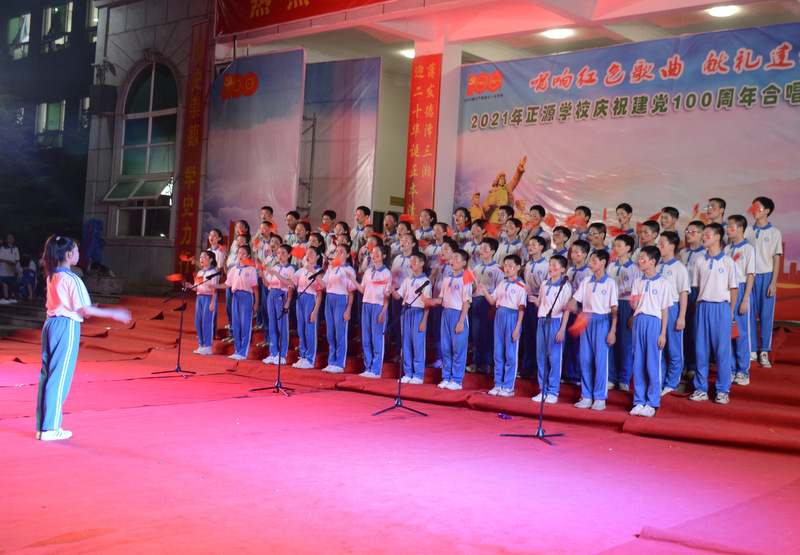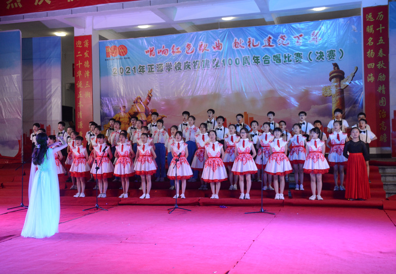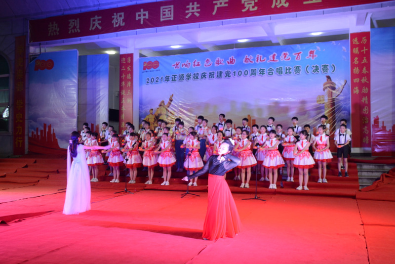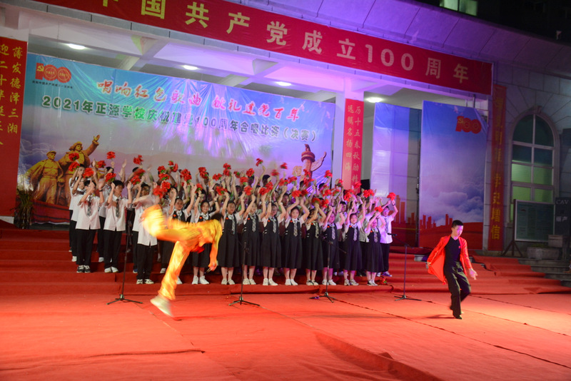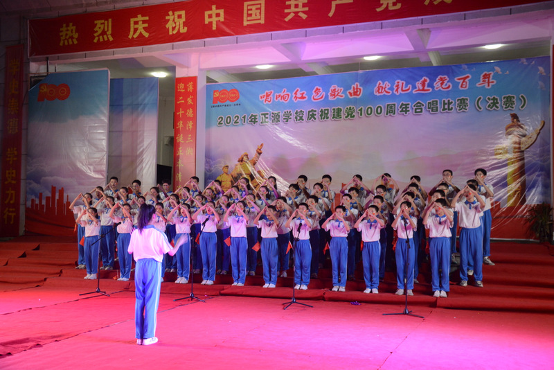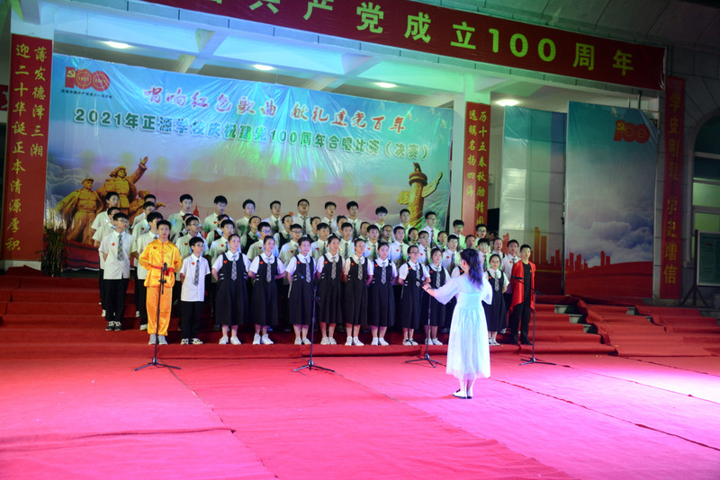 9点,各年级参赛队伍演唱完毕,评委老师紧锣密鼓统分评选,党员教师组成的正源之声青年教师合唱团压轴演唱《我和我的祖国》、《我宣誓》,将活动气氛推向高潮。最后,罗校长带领全场万余名师生全体起立,再次唱响《没有共产党就没有新中国》,用慷慨激昂的万人大合唱致敬建党百年,用发自肺腑的赤子心声歌颂党的伟大功绩,歌颂民族复兴历史进程。
